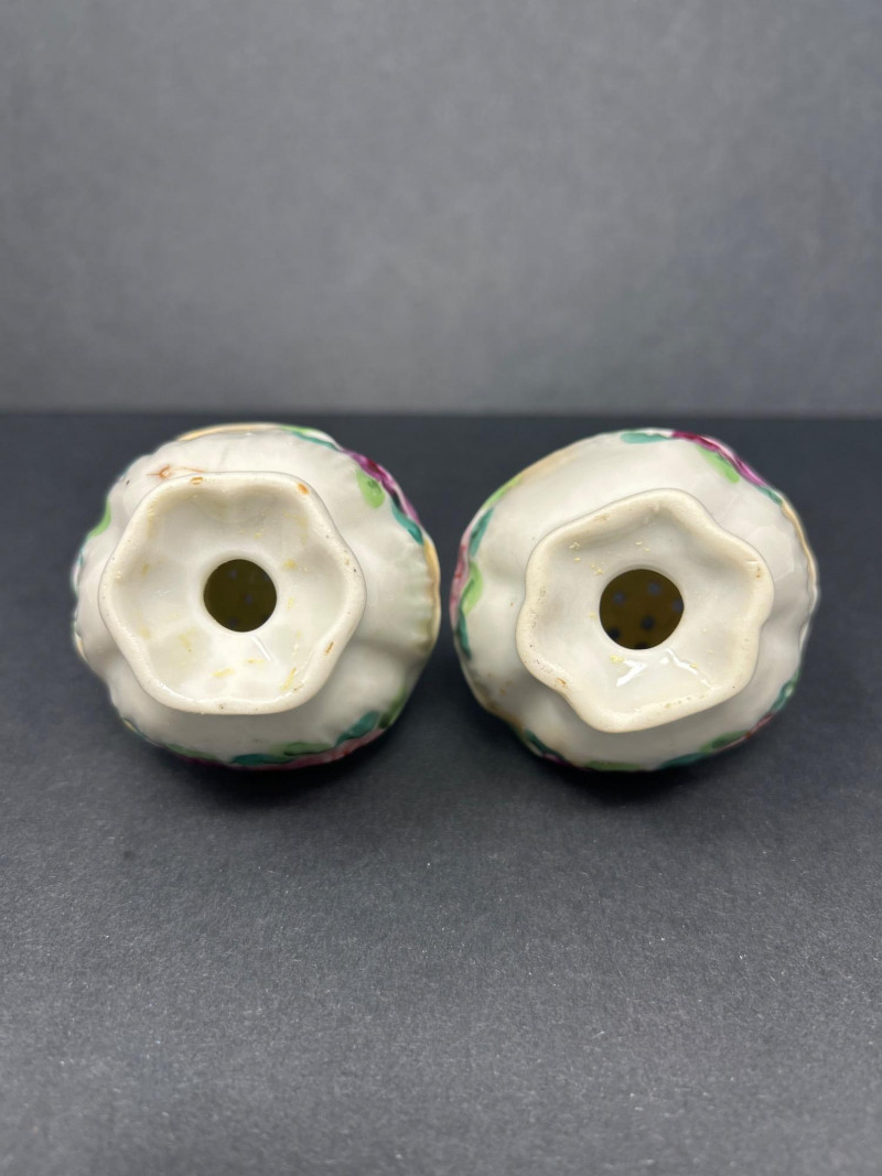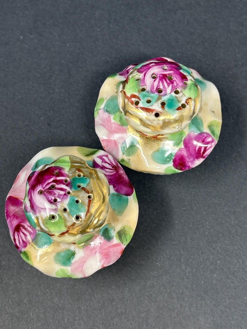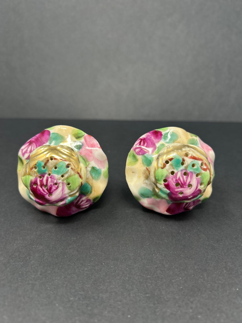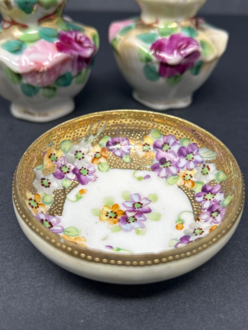 Unified by romantic florals and rich gilding, this set exemplifies the elegance of Meiji-era export porcelain. The sugar bowl’s geometric gold banding contrasts beautifully with the soft brushwork of the florals, while the shakers and dish echo the palette and hand-painted charm. Materials: