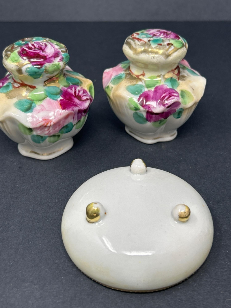 An exquisite hand-painted porcelain grouping, likely dating to the early 20th century, featuring: Lidded sugar bowl – Bulbous form with twin handles and a domed lid, adorned with soft lavender and pink florals. Raised gold latticework and trim add opulence to the rim and handles. Salt & pepper shakers (pair) – Hexagonal bases with lush rose motifs in crimson and green, topped with matching floral lids. Small dish – Circular with scalloped edge, decorated with miniature florals and a wide band of raised gold filigree. Design Notes: