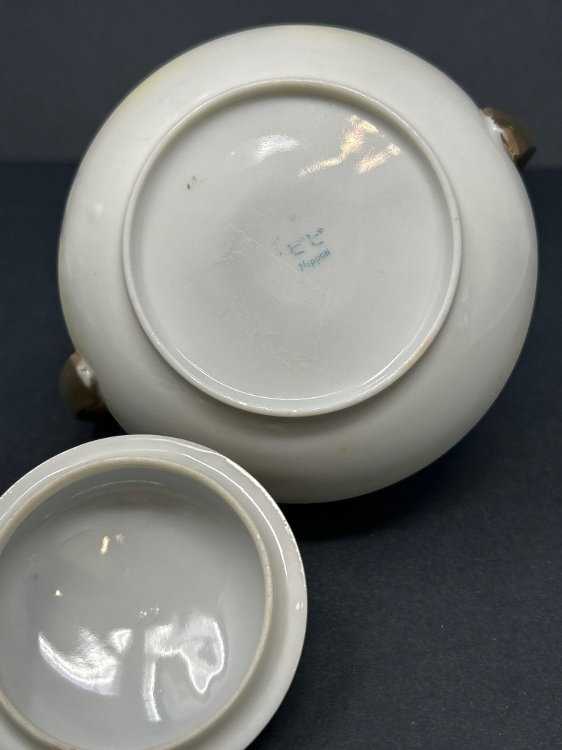 Marked “Nippon,” this set was produced between 1891 and 1921 for Western export. Raised gold detailing and floral themes were hallmarks of the period, often symbolizing seasonal beauty and prosperity.