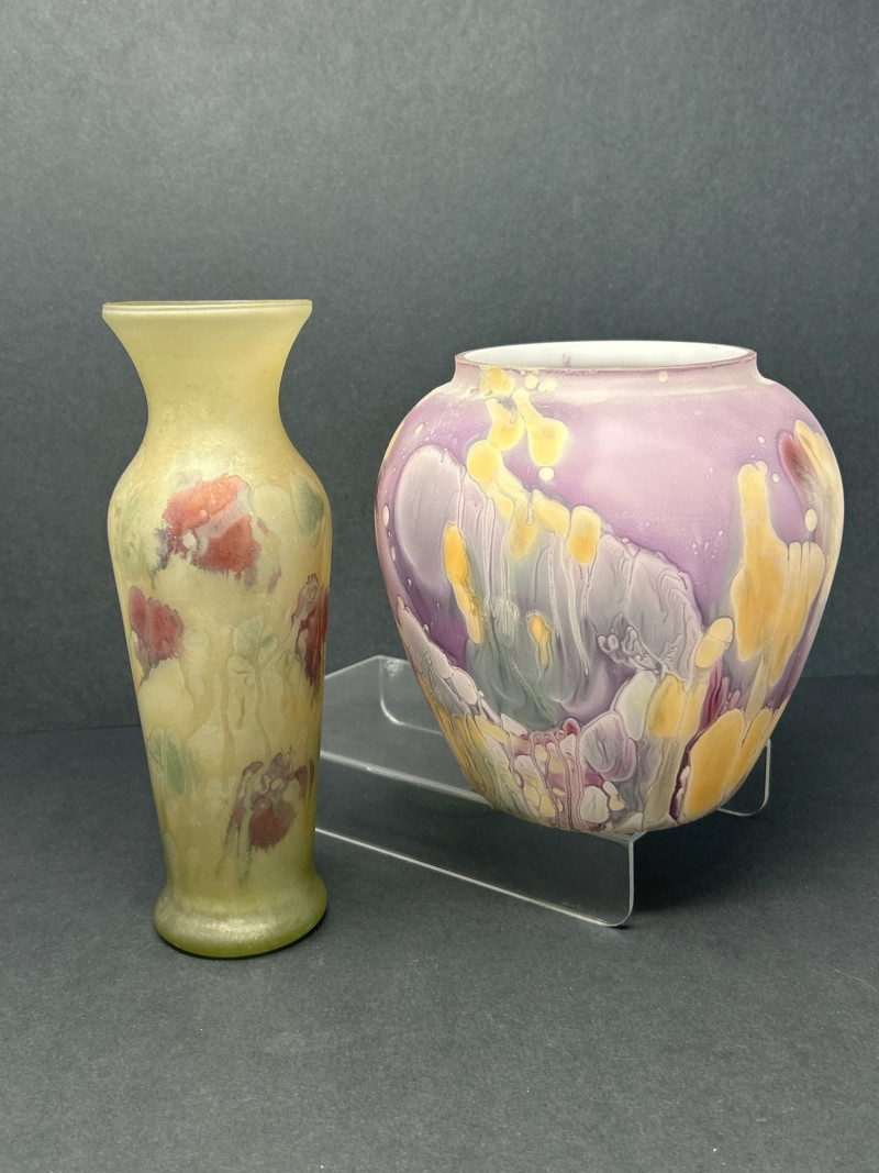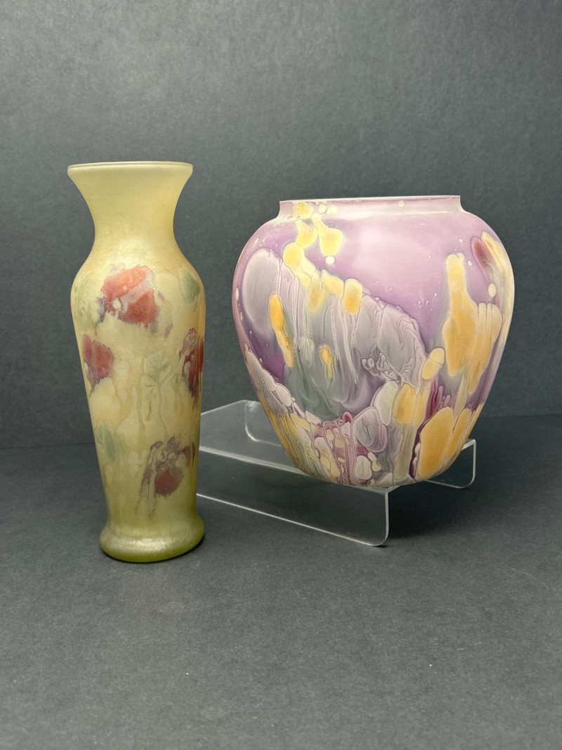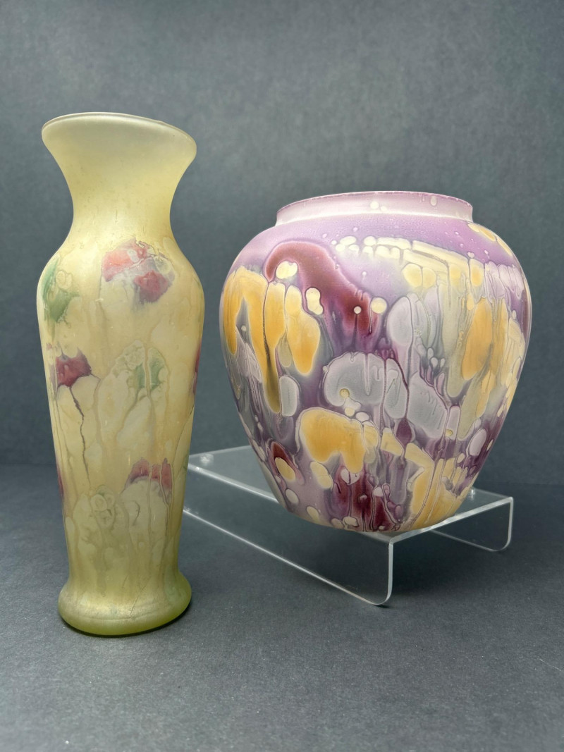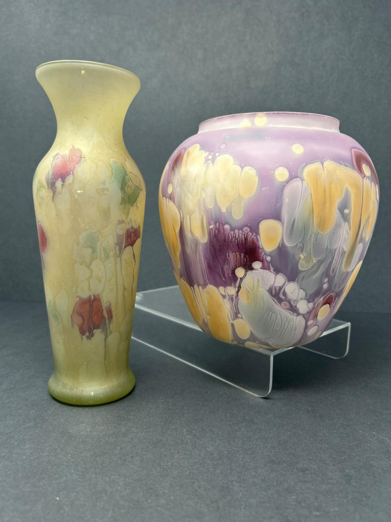 Both pieces reflect the influence of Nouveau and studio glass traditions, with expressive colorwork and hand-applied artistry. Their contrasting forms—one bulbous and one tapered—create a dynamic visual pairing. Condition: