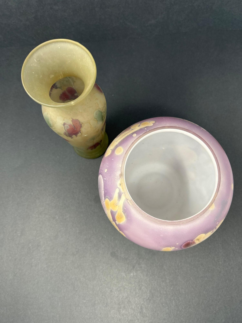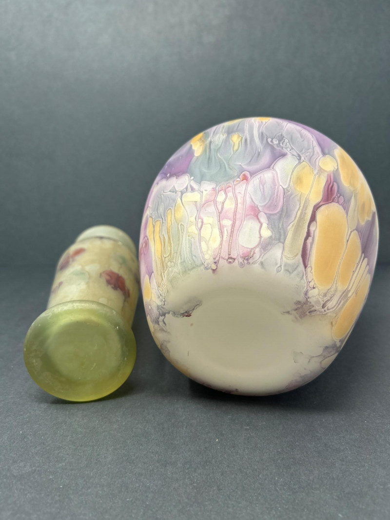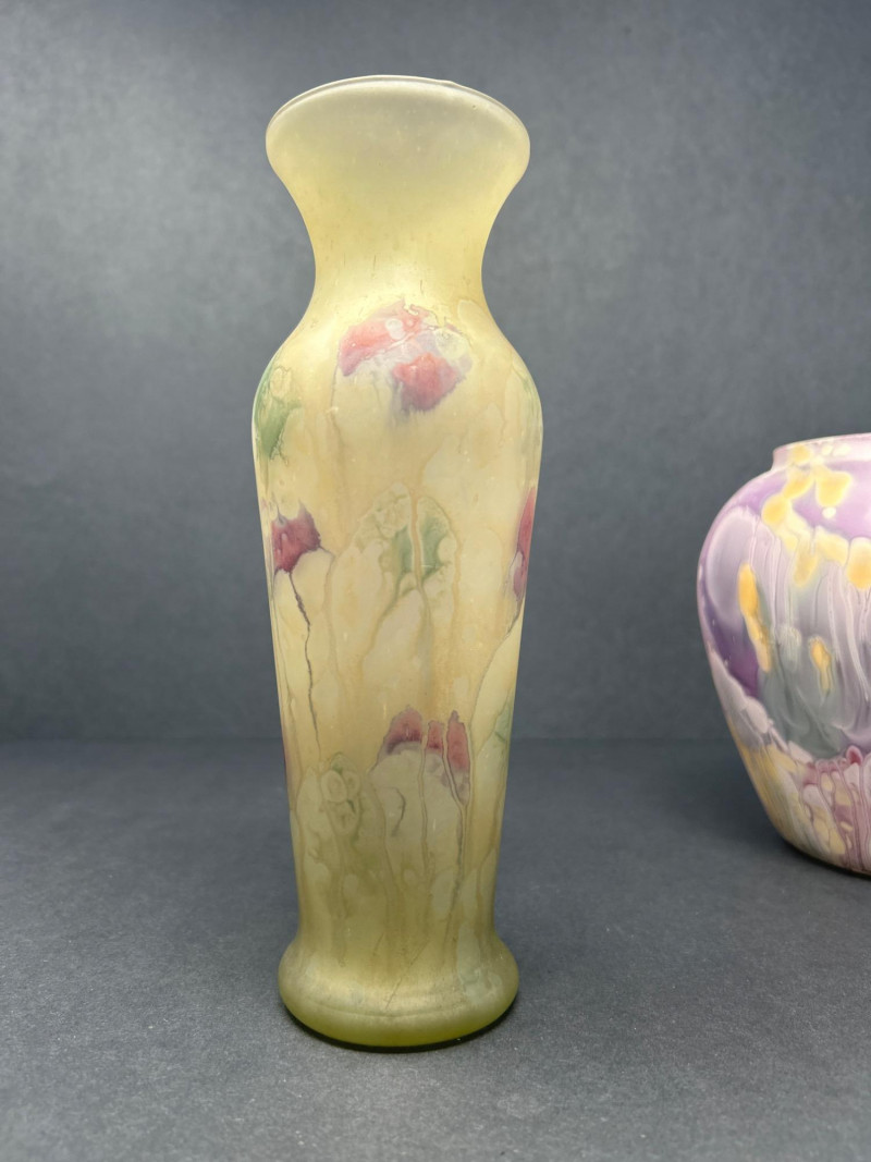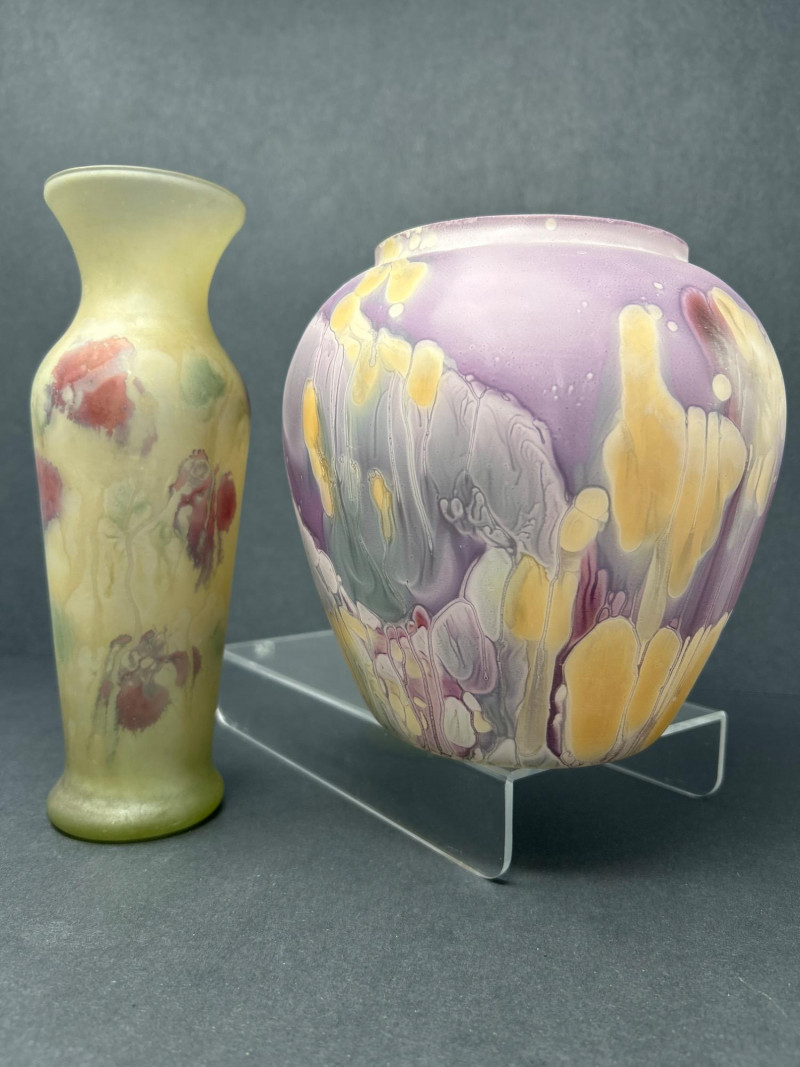 Both pieces reflect the influence of Nouveau and studio glass traditions, with expressive colorwork and hand-applied artistry. Their contrasting forms—one bulbous and one tapered—create a dynamic visual pairing. Condition: