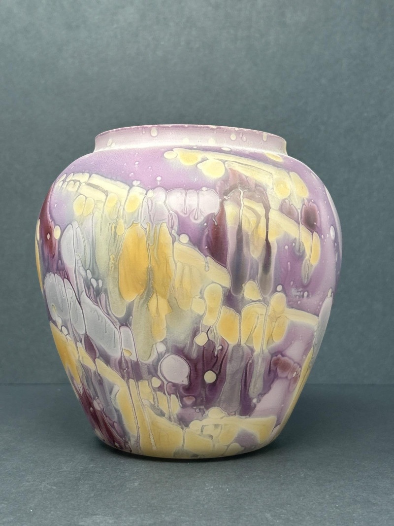 A visually striking pair of art glass vases, each showcasing a unique painterly finish and sculptural form: Purple Vase – 7" tall × 4" diameter at top. Rounded body with a marbled surface of lavender, yellow, white, and gray. The flowing pattern evokes abstract florals or geode-like veining, with a soft matte finish. Yellow Vase – 9" tall × 3" diameter at top. Slender silhouette with a yellow-green base tone, adorned with abstract floral splashes in red, green, and white. The surface has a subtle satin texture, enhancing its organic feel. Design Notes:
