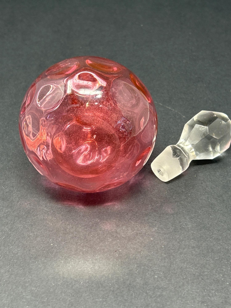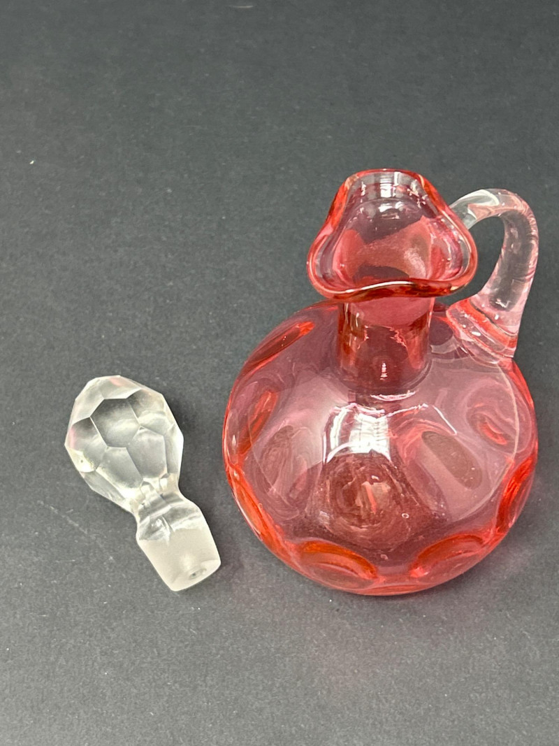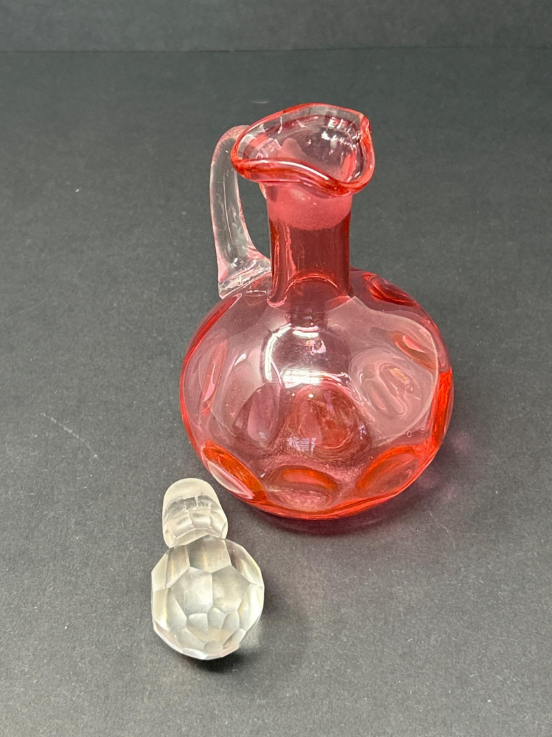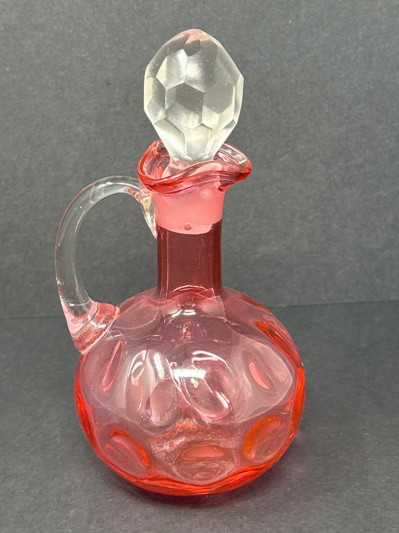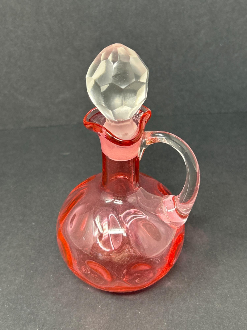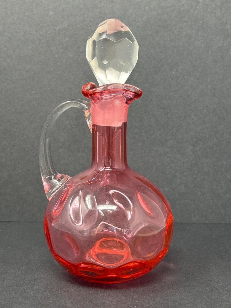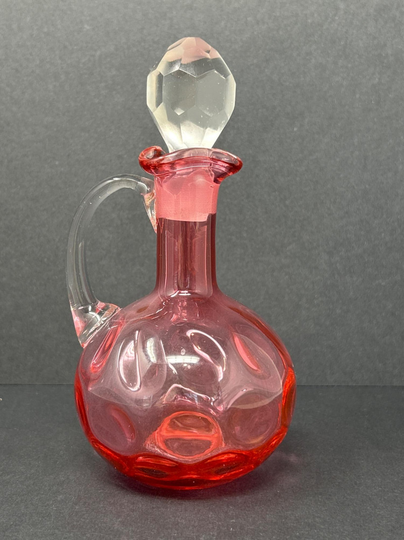 A radiant example of mid-century American art glass, this Fenton Cranberry Coin Dot Cruet—often referred to as “ruby overlay”—features: Coloration: Rich cranberry red body with clear glass handle and stopper Pattern: Signature “coin dot” motif—raised circular impressions that catch and refract light Form: Bulbous base with a narrow neck and faceted clear stopper shaped like a gemstone Dimensions: Approx. 7 inches tall Material: Blown glass with applied handle and stopper