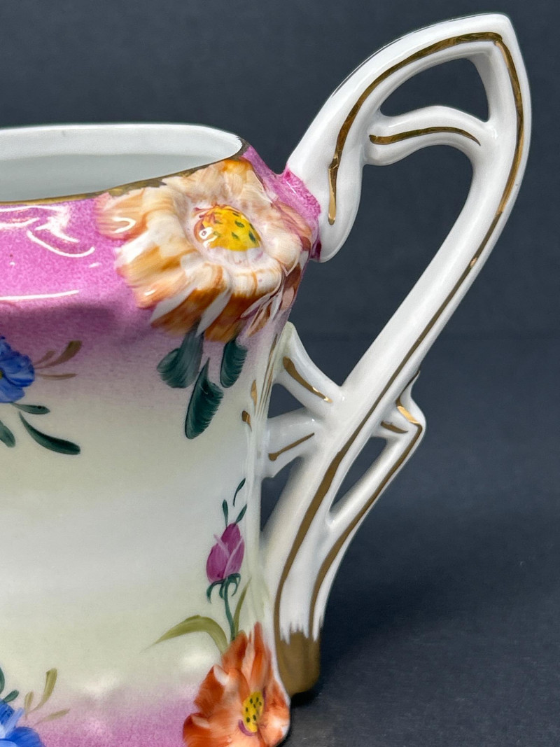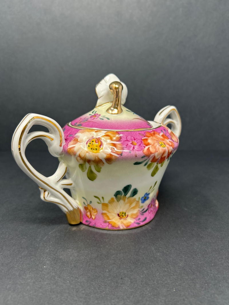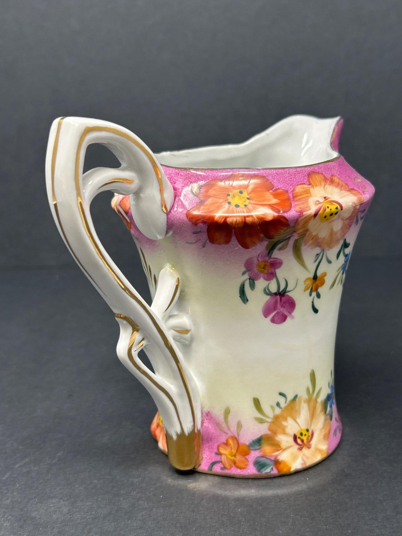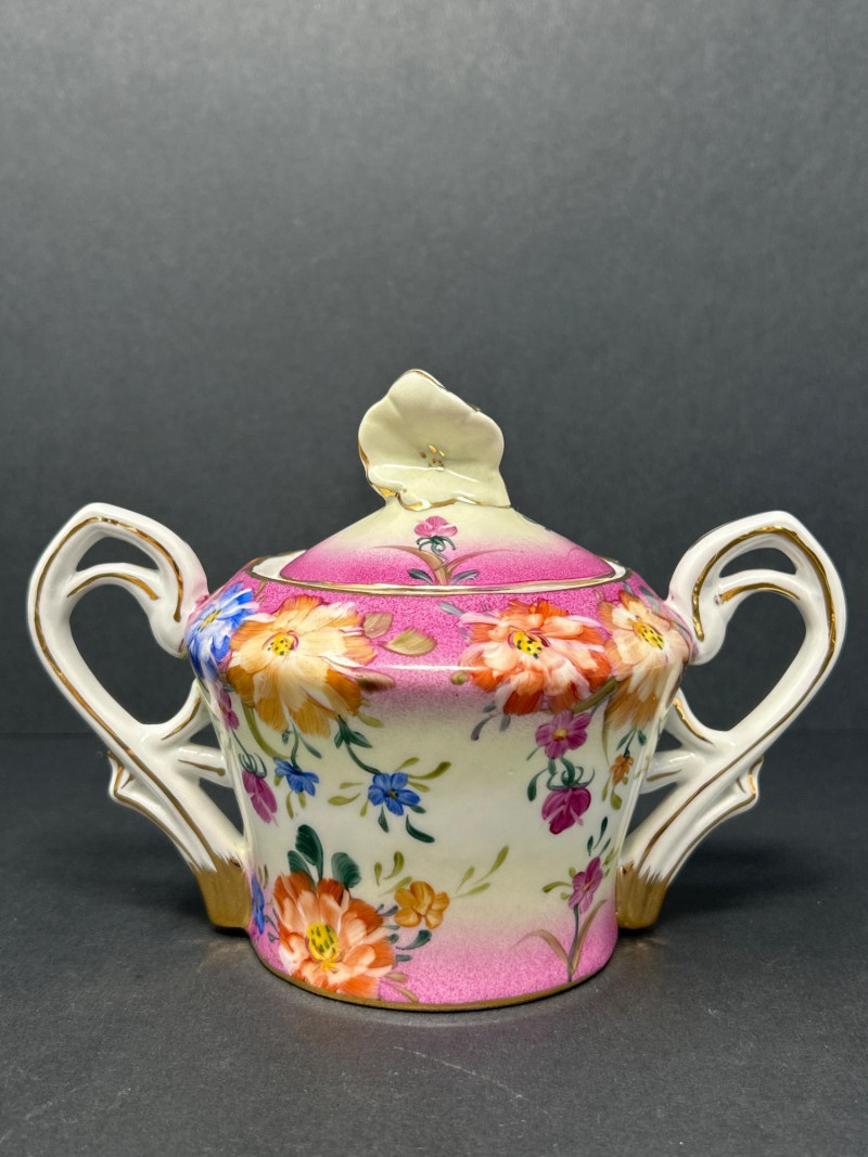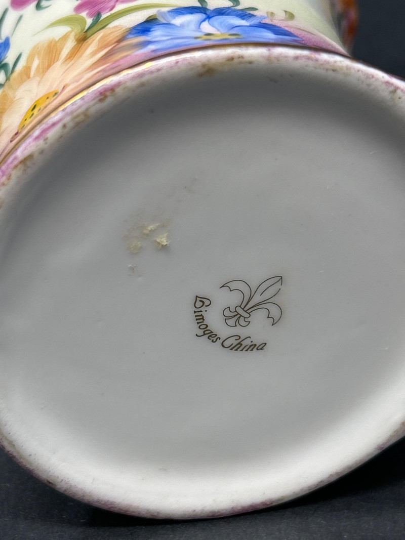 A vibrant duet of French artistry, this Limoges cream and sugar set showcases the elegance of hand-painted porcelain with sculptural flair: Creamer –Blushing pink fades into ivory, adorned with trailing florals in orange, blue, and green. The handle’s ornate silhouette adds a touch of Rococo whimsy, while the tall profile (5.5" at handle) lends graceful presence. Sugar Bowl –Twin handles frame a rounded body bursting with blooms, crowned by a flower-shaped finial atop the lid. Gold accents and dimensional detailing elevate this 8" wide piece to a celebration of turn-of-the-century charm.