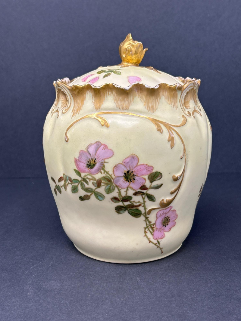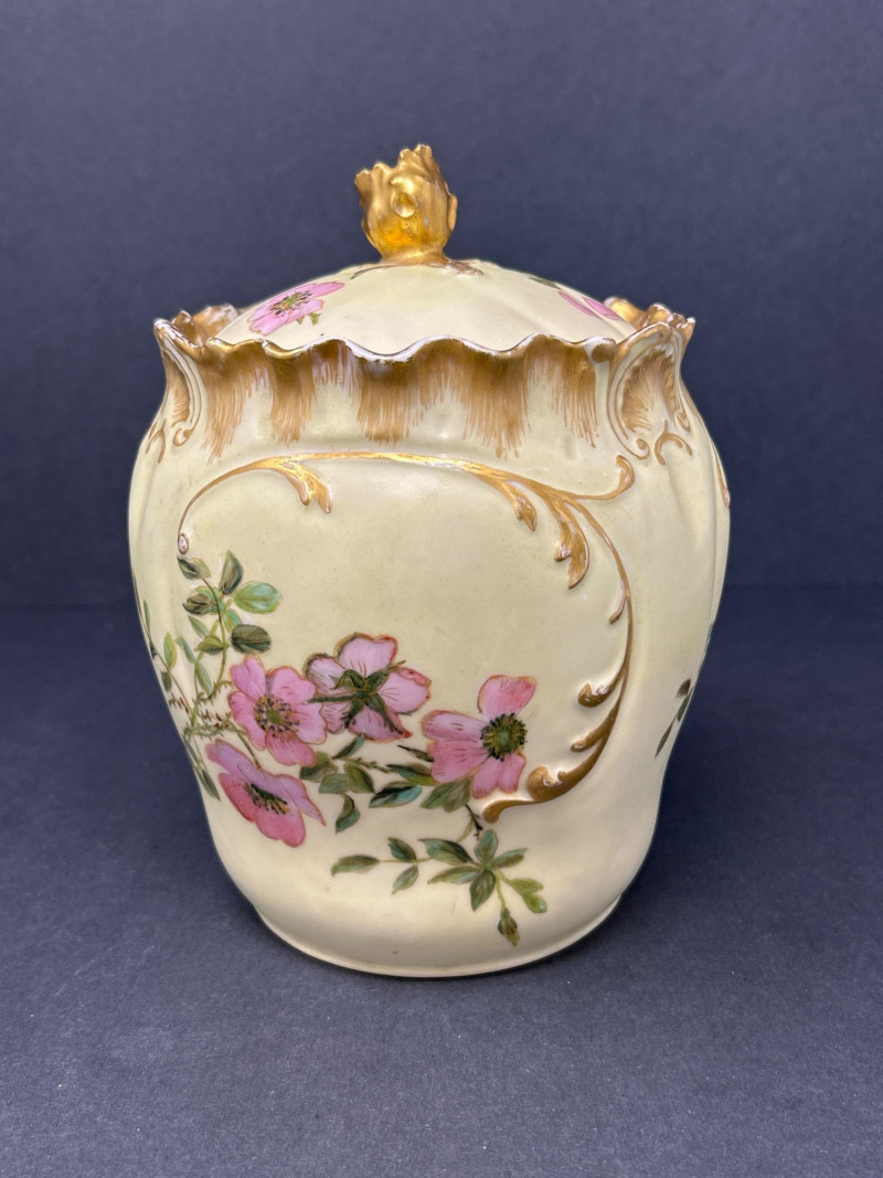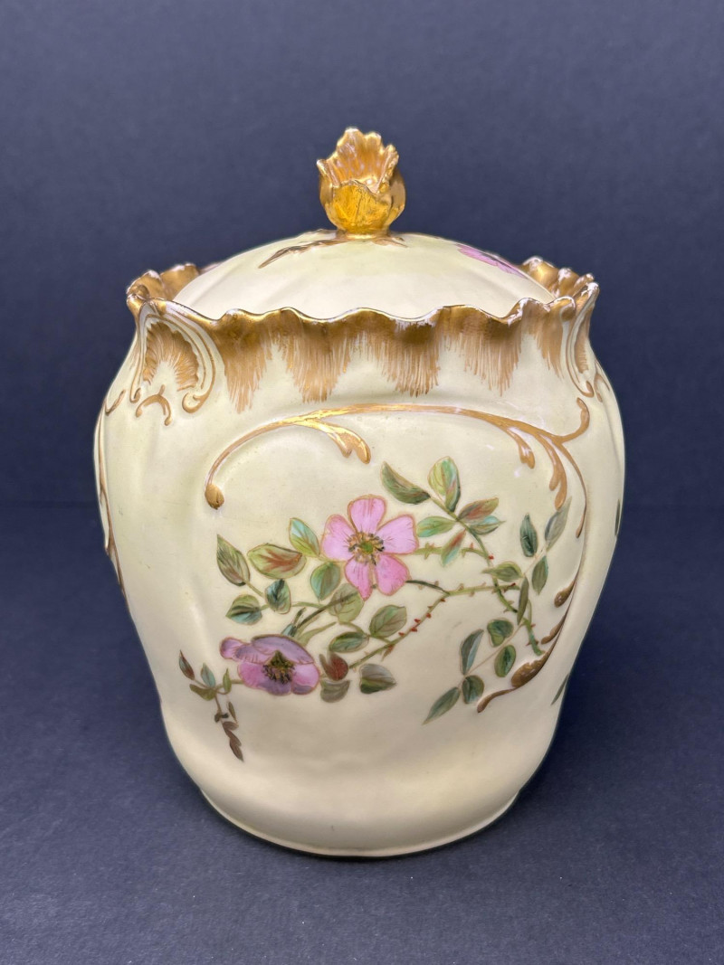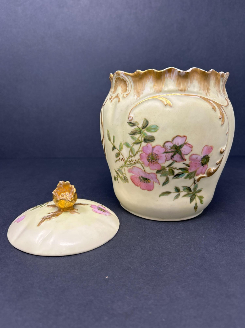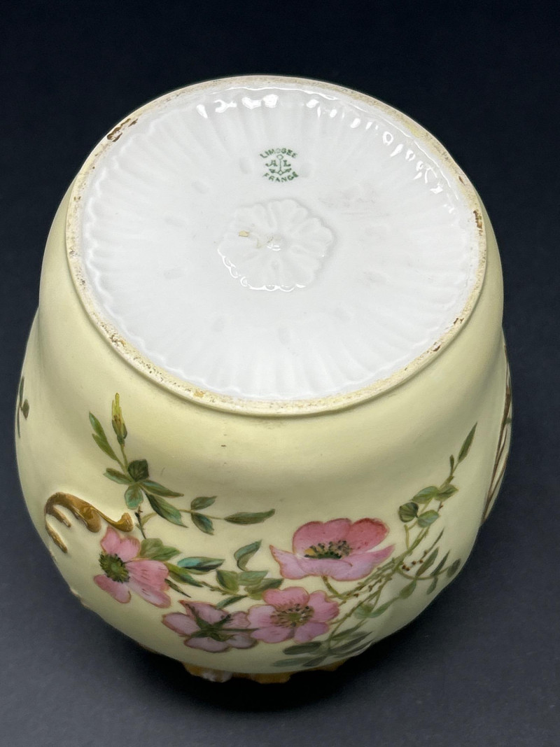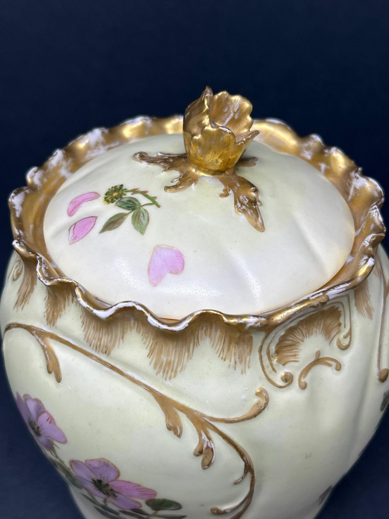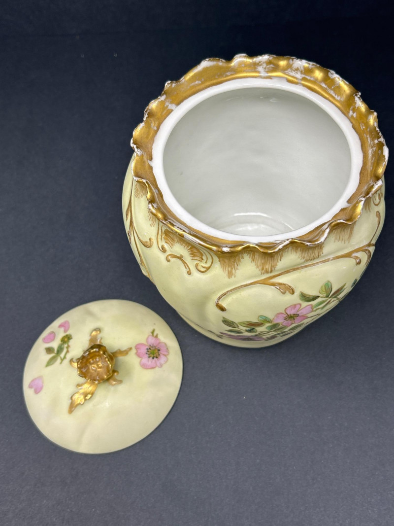 An exquisite Limoges of France porcelain biscuit jar, hand-painted and richly adorned: Design: Soft ivory body with delicate pink wild roses and leafy green stems, framed by ornate gold scrollwork Rim: Scalloped edge with hand-applied gold accents and petal-like detailing Lid: Topped with a golden flower bud finial, echoing the romantic floral motif Dimensions: Approx. 8" tall x 6" wide Material: Glazed porcelain with gilt embellishment