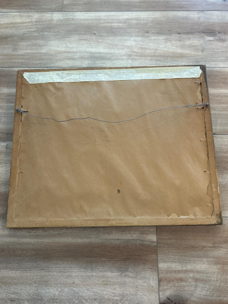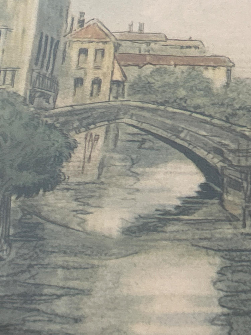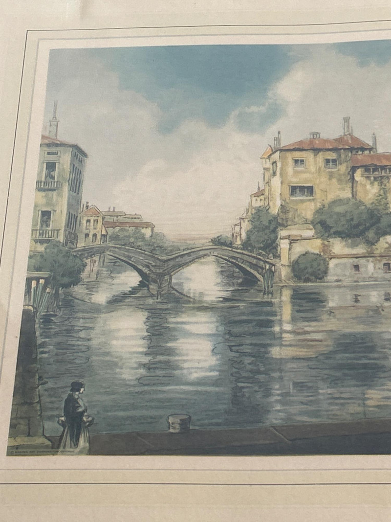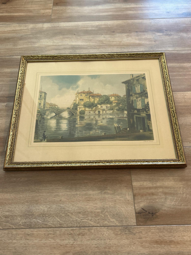 A tranquil pairing of classical architecture and reflective waters, this framed print by Canadian artist Claude Dorval evokes the romance of European riverside life: Bridge & Reflection – Twin stone arches span a glassy river, mirroring the stately buildings and soft clouds above. A lone fisherman and moored boats lend quiet narrative to the scene, inviting contemplation. Gilt Frame & Mat – Housed in an ornate gold frame with a cream mat, the 21.5" x 17.5" presentation enhances the artwork’s serene palette and timeless charm. A graceful accent for traditional interiors or collectors of vintage prints.