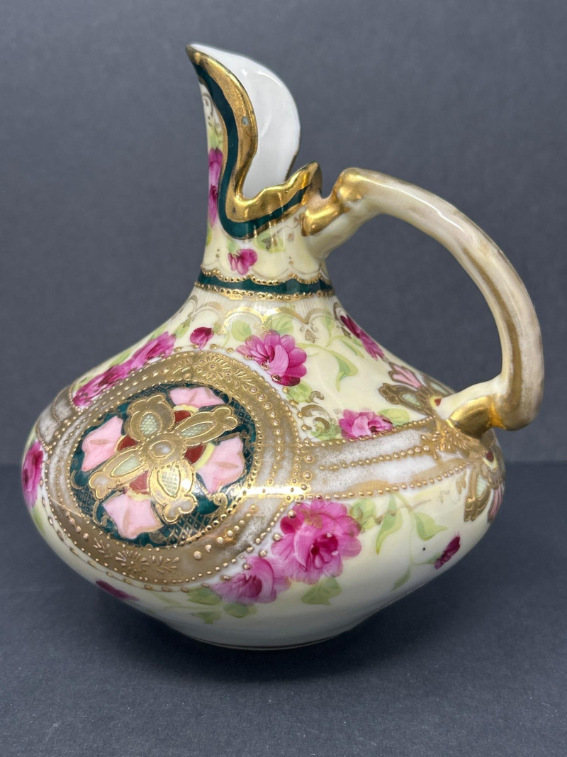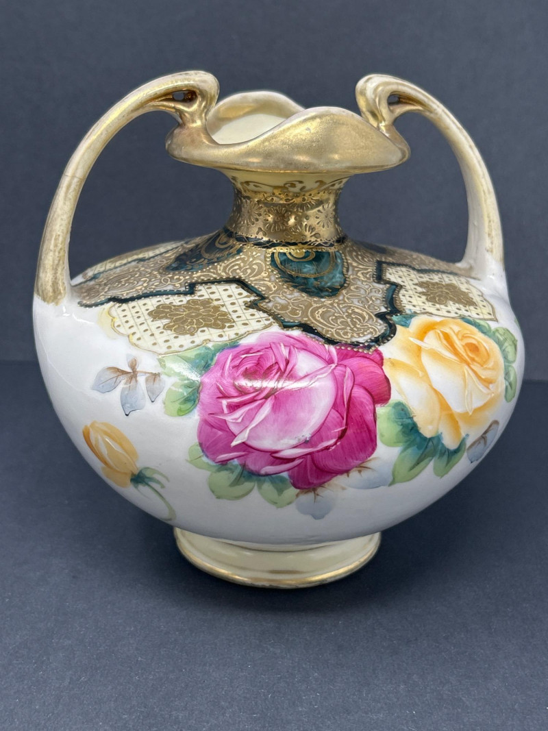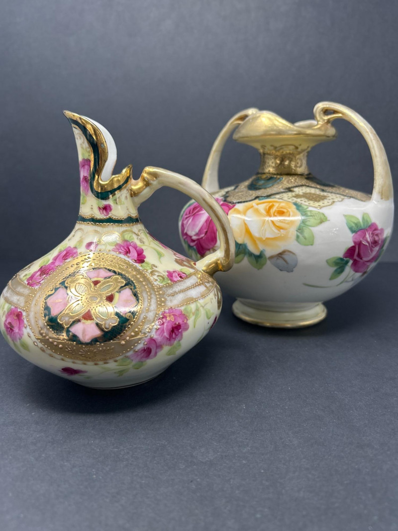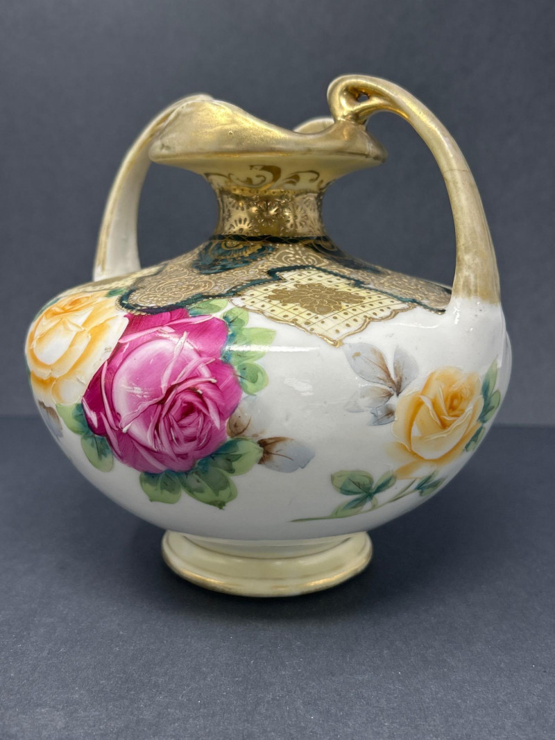 A stunning duo of hand-painted Nippon porcelain featuring exquisite moriage detailing and romantic floral motifs: Pitcher: Single-handled with a graceful spout, adorned in pink roses, scrolling gold accents, and raised enamel work. The body is softly rounded with a delicate ivory base. Vase: Two-handled with a wide mouth and dramatic curves, showcasing lush roses in pink, yellow, and white. Gilded overlays and textured moriage elevate its ornamental appeal. Dimensions: 6.5–7 inches high Material: Porcelain with moriage and gilt detailing