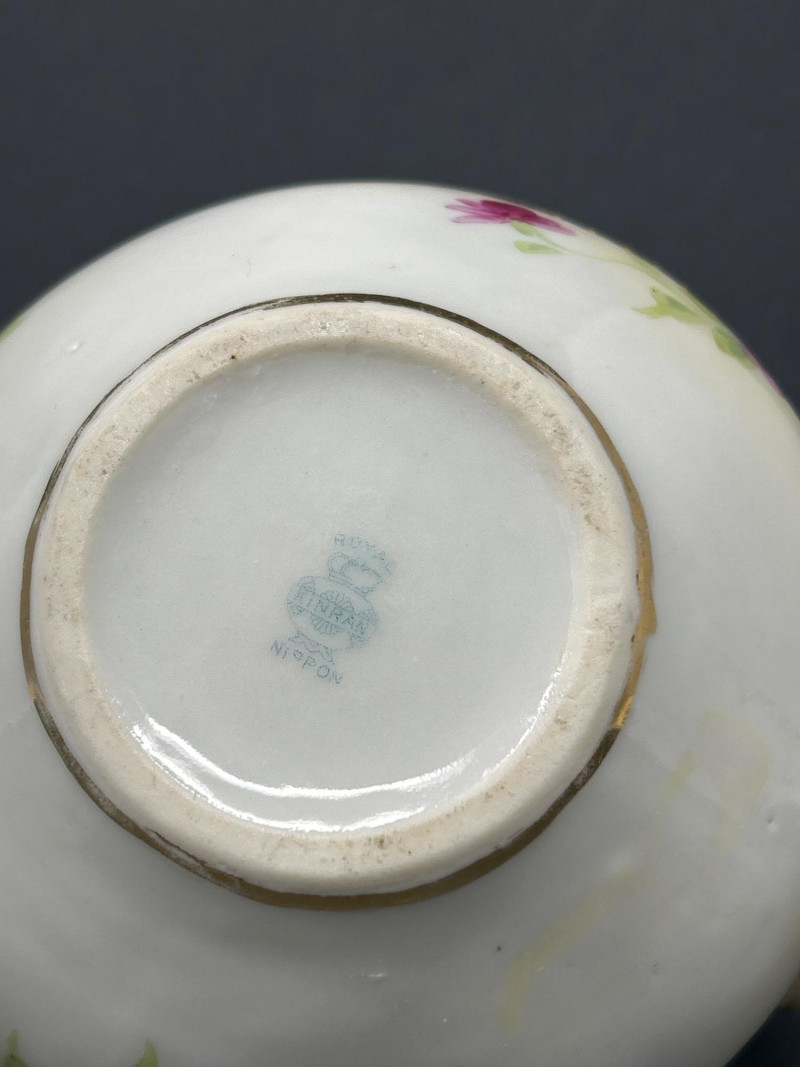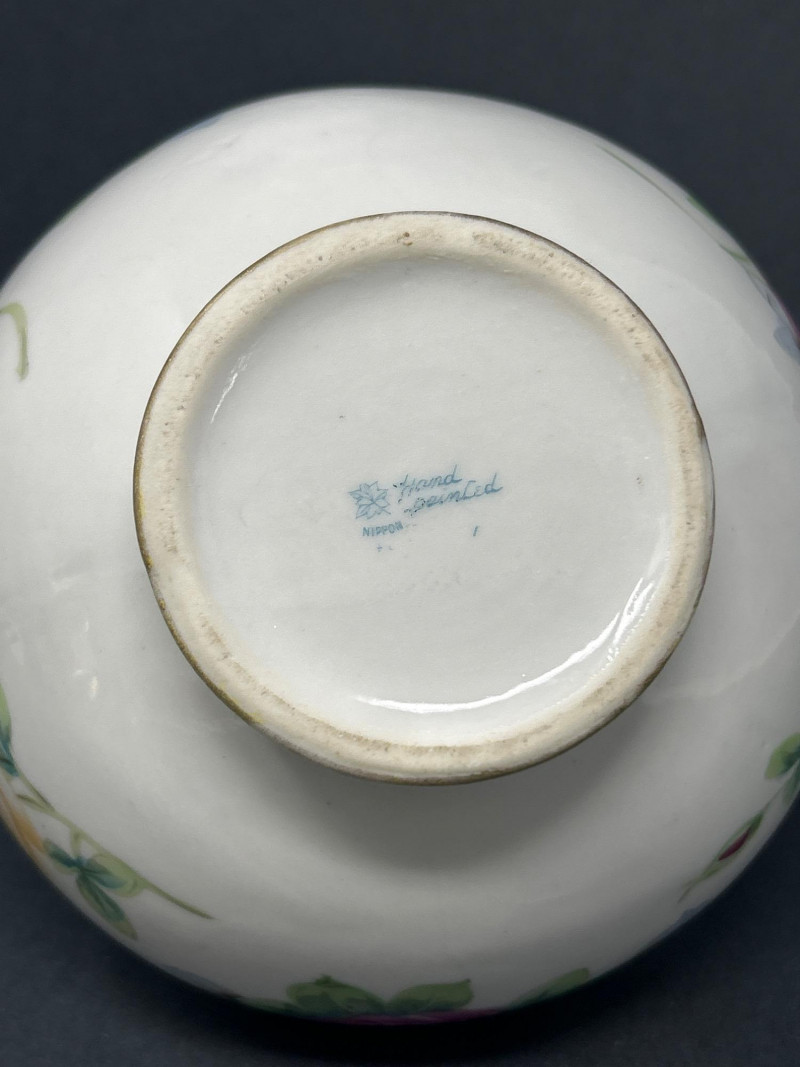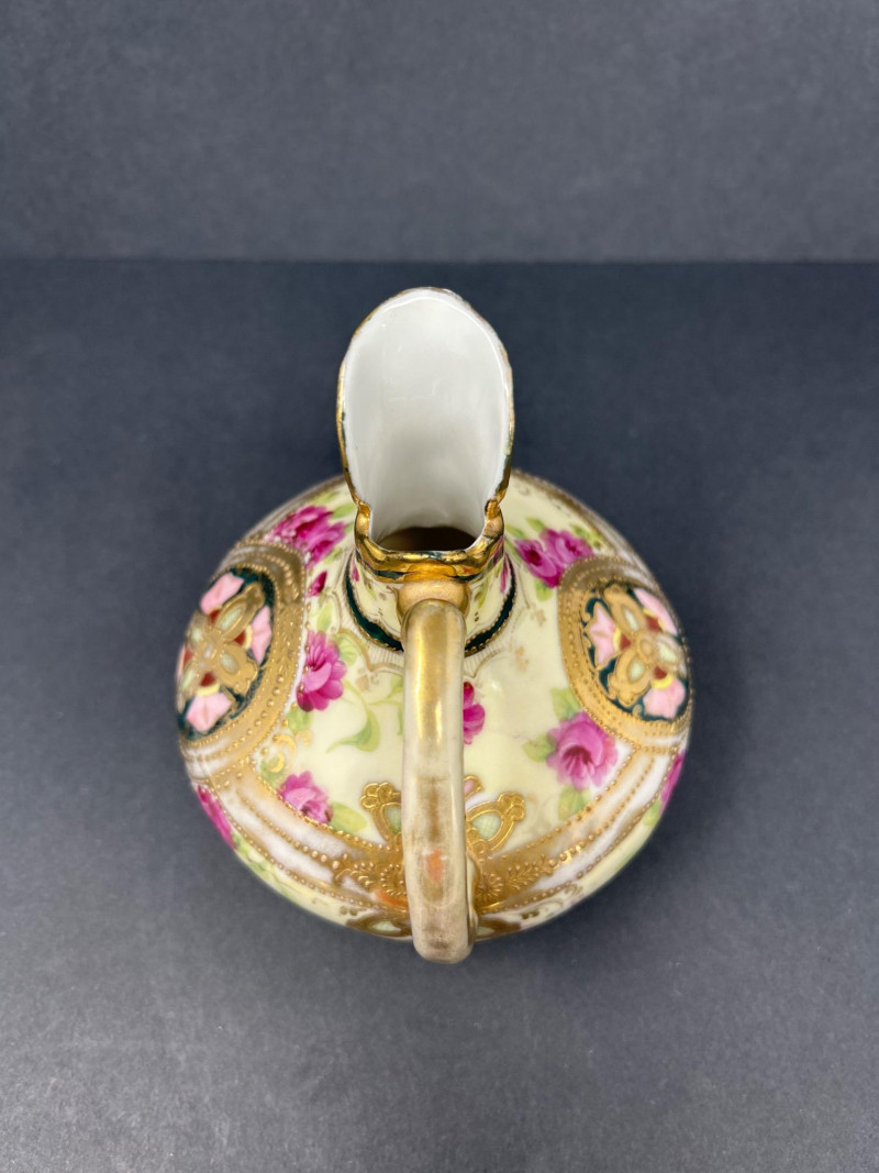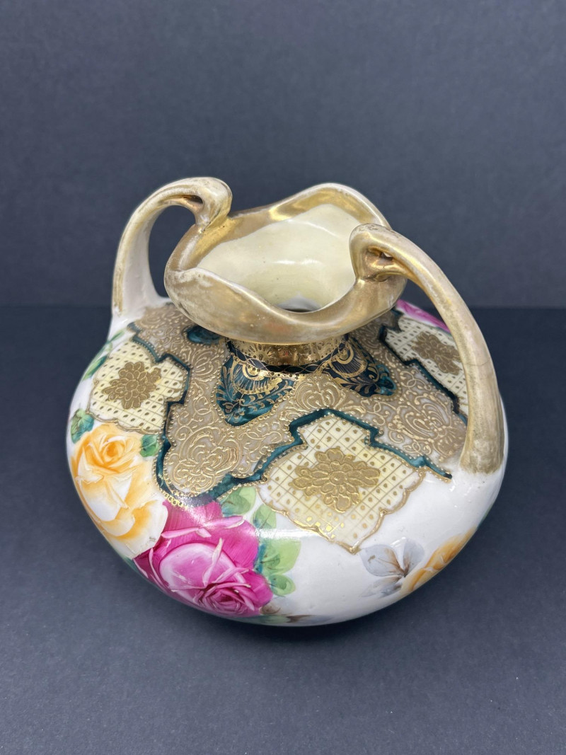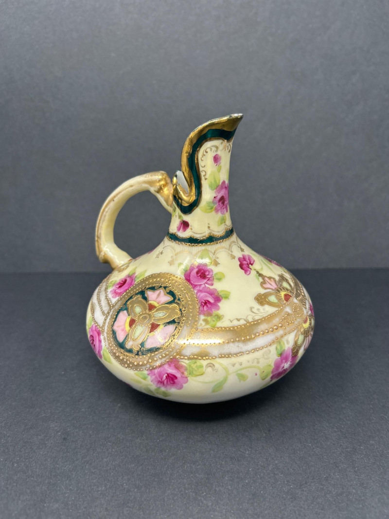 A stunning duo of hand-painted Nippon porcelain featuring exquisite moriage detailing and romantic floral motifs: Pitcher: Single-handled with a graceful spout, adorned in pink roses, scrolling gold accents, and raised enamel work. The body is softly rounded with a delicate ivory base. Vase: Two-handled with a wide mouth and dramatic curves, showcasing lush roses in pink, yellow, and white. Gilded overlays and textured moriage elevate its ornamental appeal. Dimensions: 6.5–7 inches high Material: Porcelain with moriage and gilt detailing