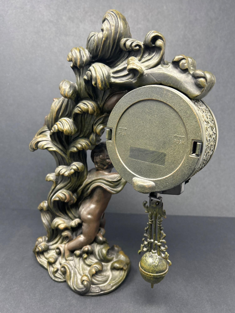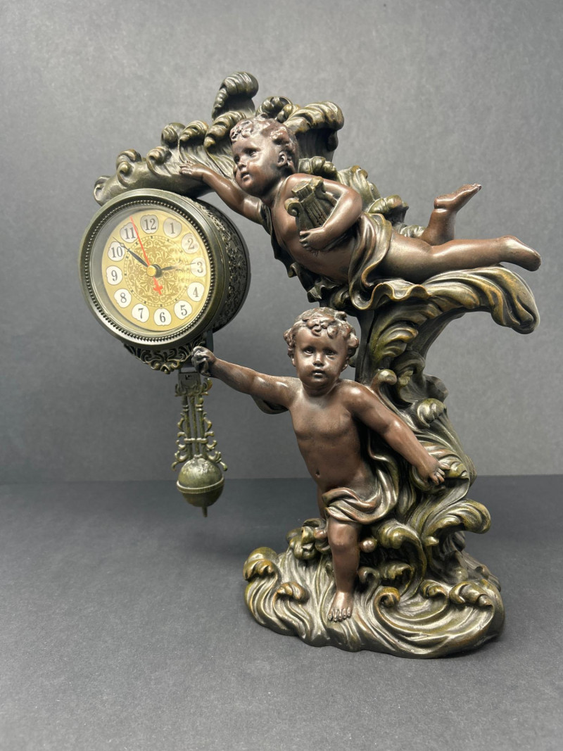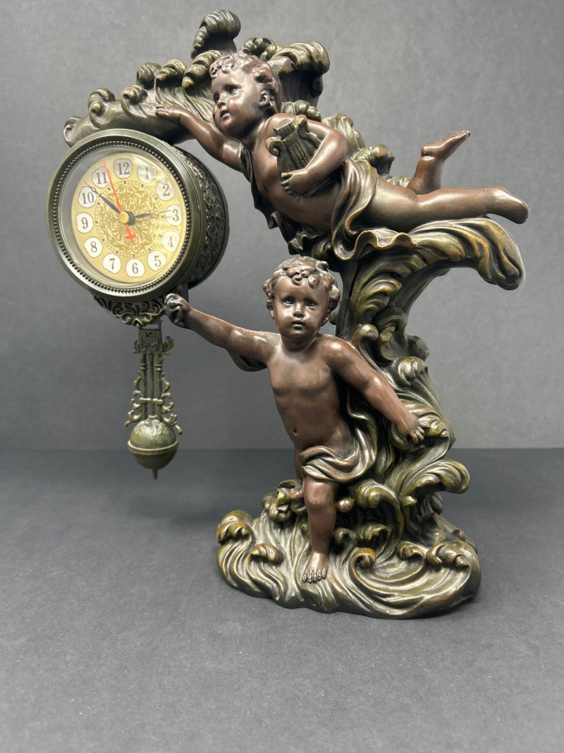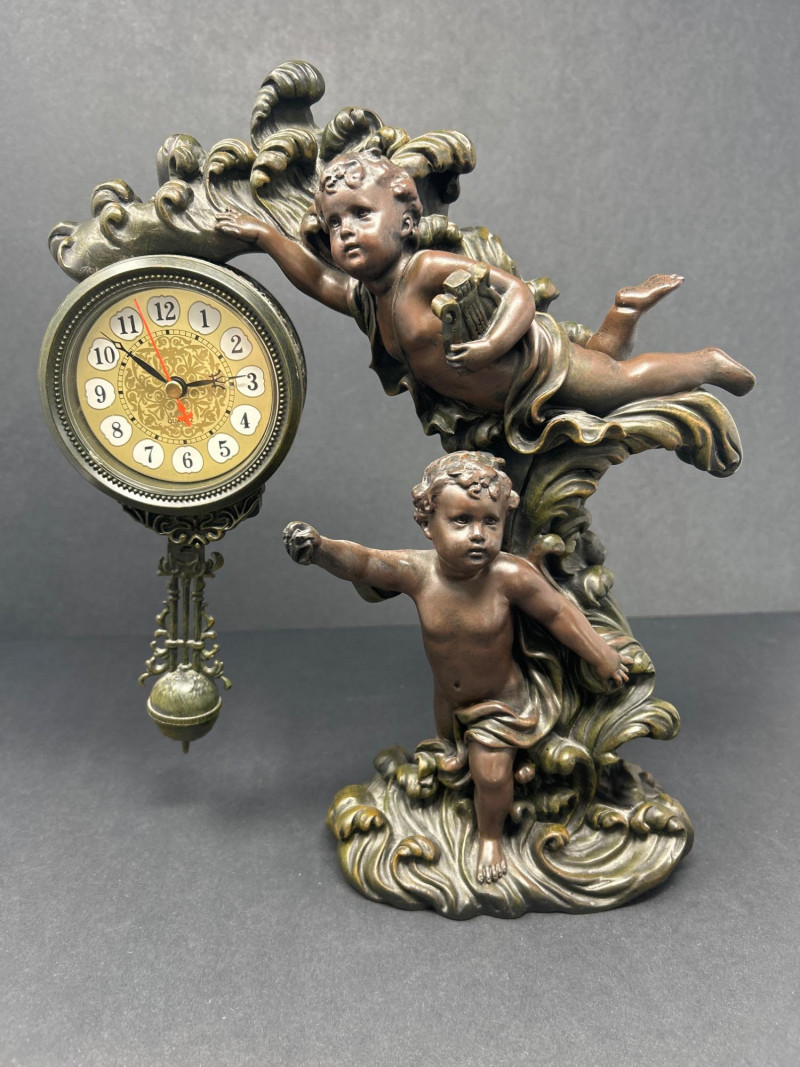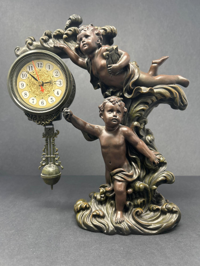 An ornate Crosa mantel clock featuring classical cherub figures and elaborate scrollwork. Crafted in a romantic Rococo revival style, this piece blends decorative opulence with functional charm. Likely cast in spelter or resin with a gilded finish, it evokes the elegance of 19th-century French design, though likely produced in the mid-to-late 20th century. Design Features: Maker: Crosa (Italy) Material: Gilded composite or spelter Motif: Cherubs, scrolls, and floral accents Dimensions: Approx. 12" L × 14.5" W × [Depth not listed] Era: Mid-20th century Condition: Not specified; assume light wear consistent with age Styling Notes: