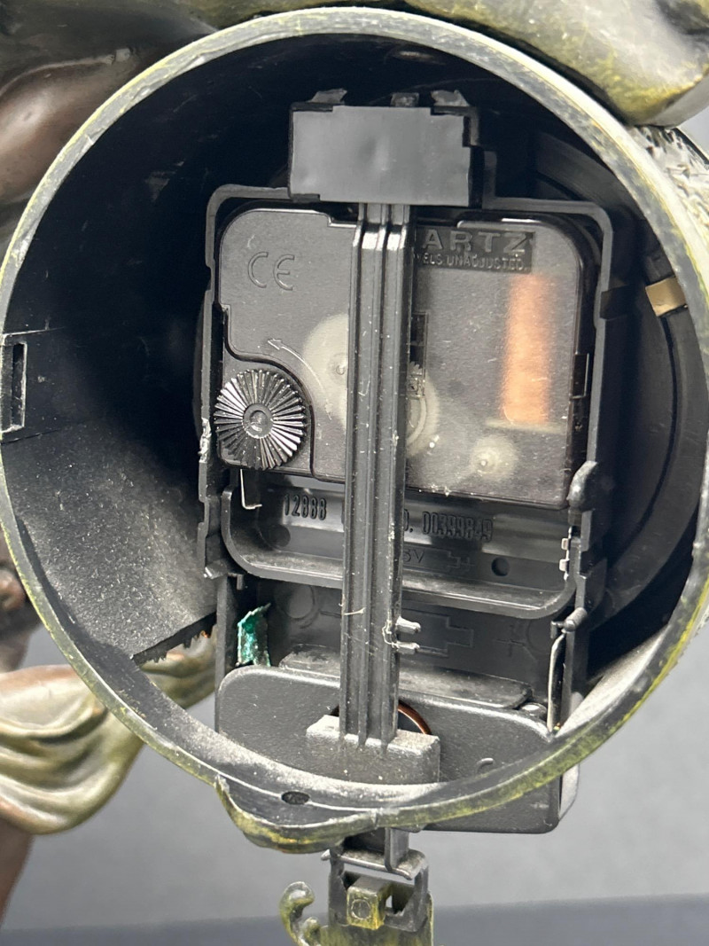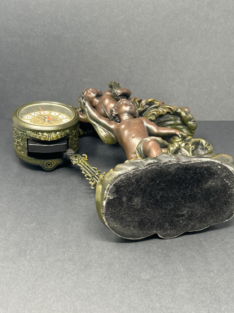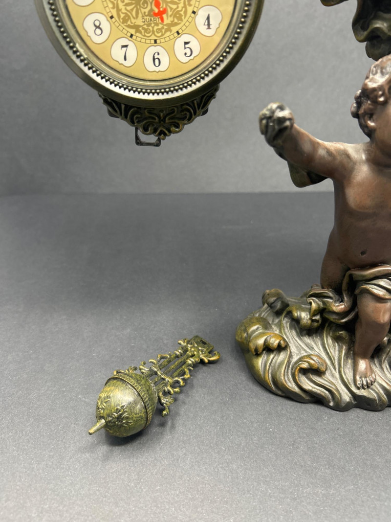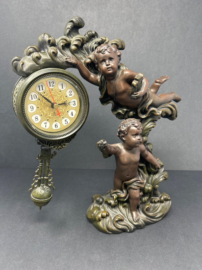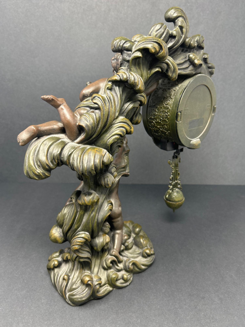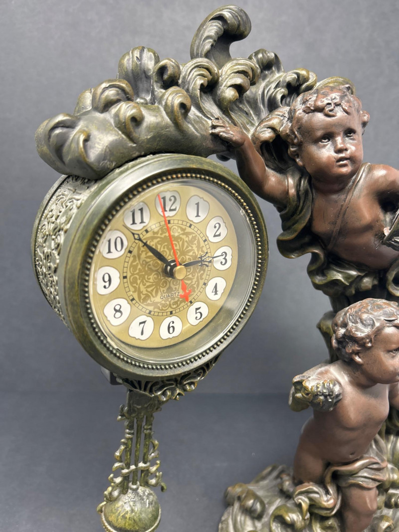 An ornate Crosa mantel clock featuring classical cherub figures and elaborate scrollwork. Crafted in a romantic Rococo revival style, this piece blends decorative opulence with functional charm. Likely cast in spelter or resin with a gilded finish, it evokes the elegance of 19th-century French design, though likely produced in the mid-to-late 20th century. Design Features: Maker: Crosa (Italy) Material: Gilded composite or spelter Motif: Cherubs, scrolls, and floral accents Dimensions: Approx. 12" L × 14.5" W × [Depth not listed] Era: Mid-20th century Condition: Not specified; assume light wear consistent with age Styling Notes: