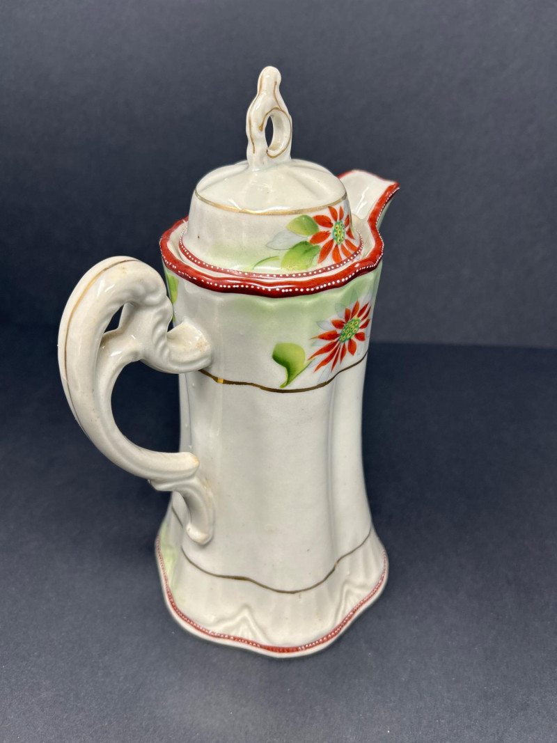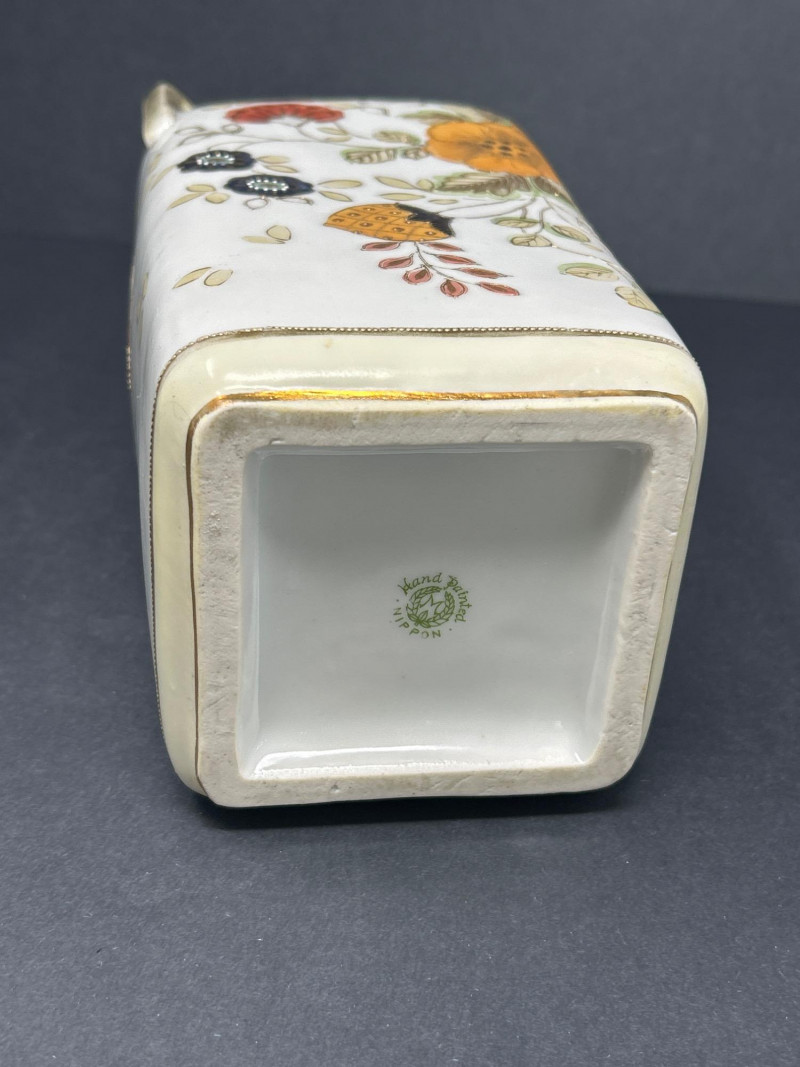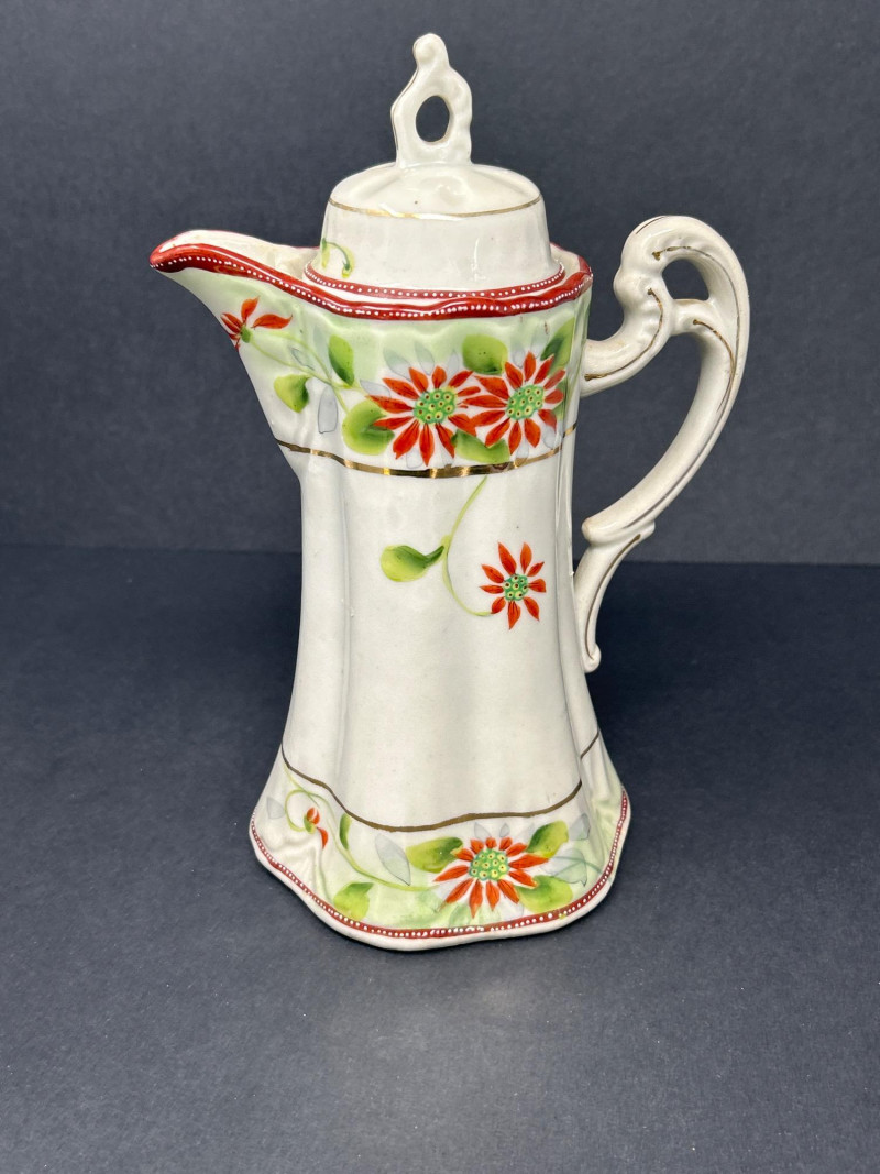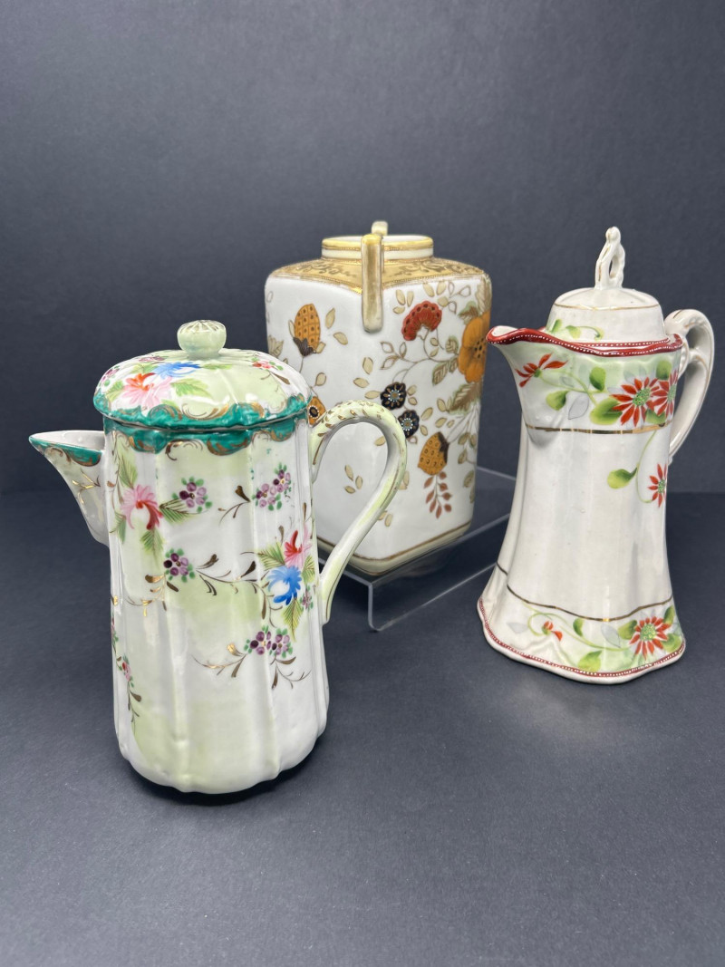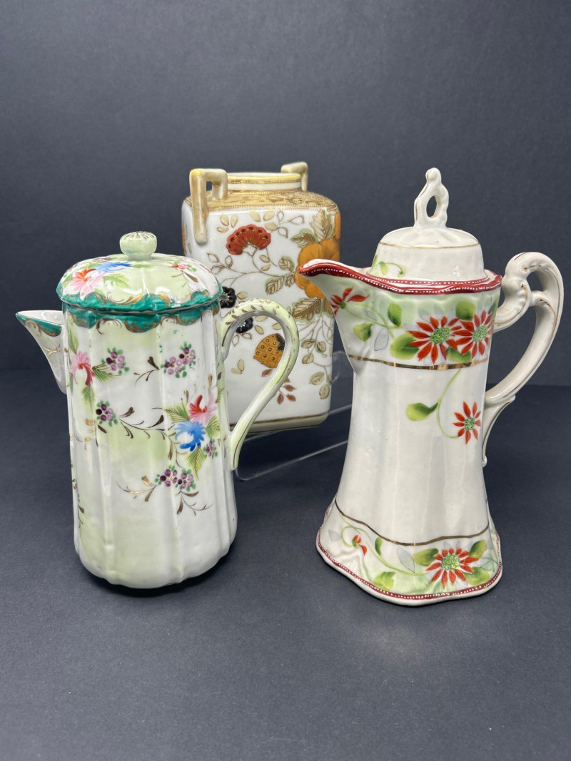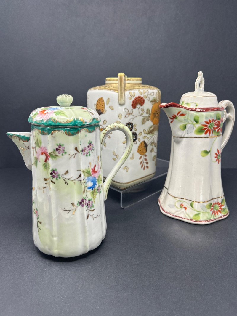 A charming ensemble of early Nippon porcelain, featuring: Two Chocolate Pots – One with a softly fluted body, hand-painted with pastel florals in pink, blue, and violet, and a scalloped green lid with teal trim. The other with a crisp white ground, red and green floral sprays, and a flared rim with red accenting. Both stand approx. 10" tall. One Ginger Jar – Rectangular form with stylized orange and black chrysanthemums and foliage. A rare silhouette with a flat lid and subtle gilt accents. Material: Porcelain with hand-painted enamel