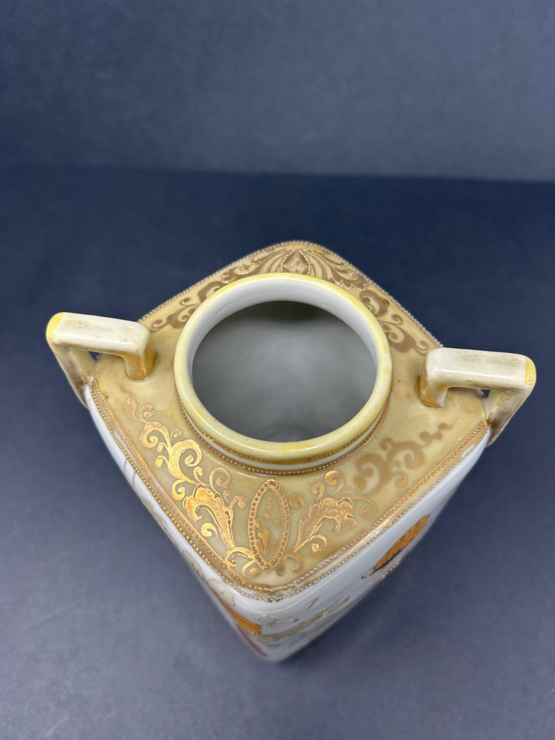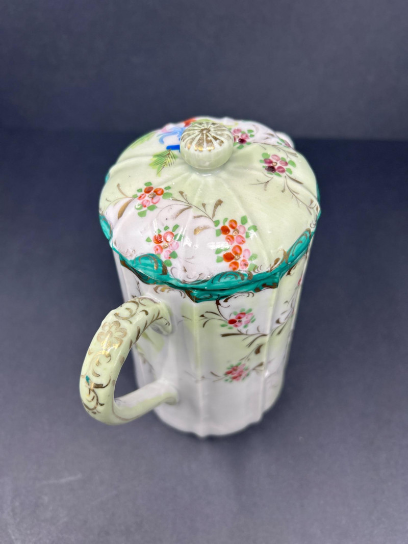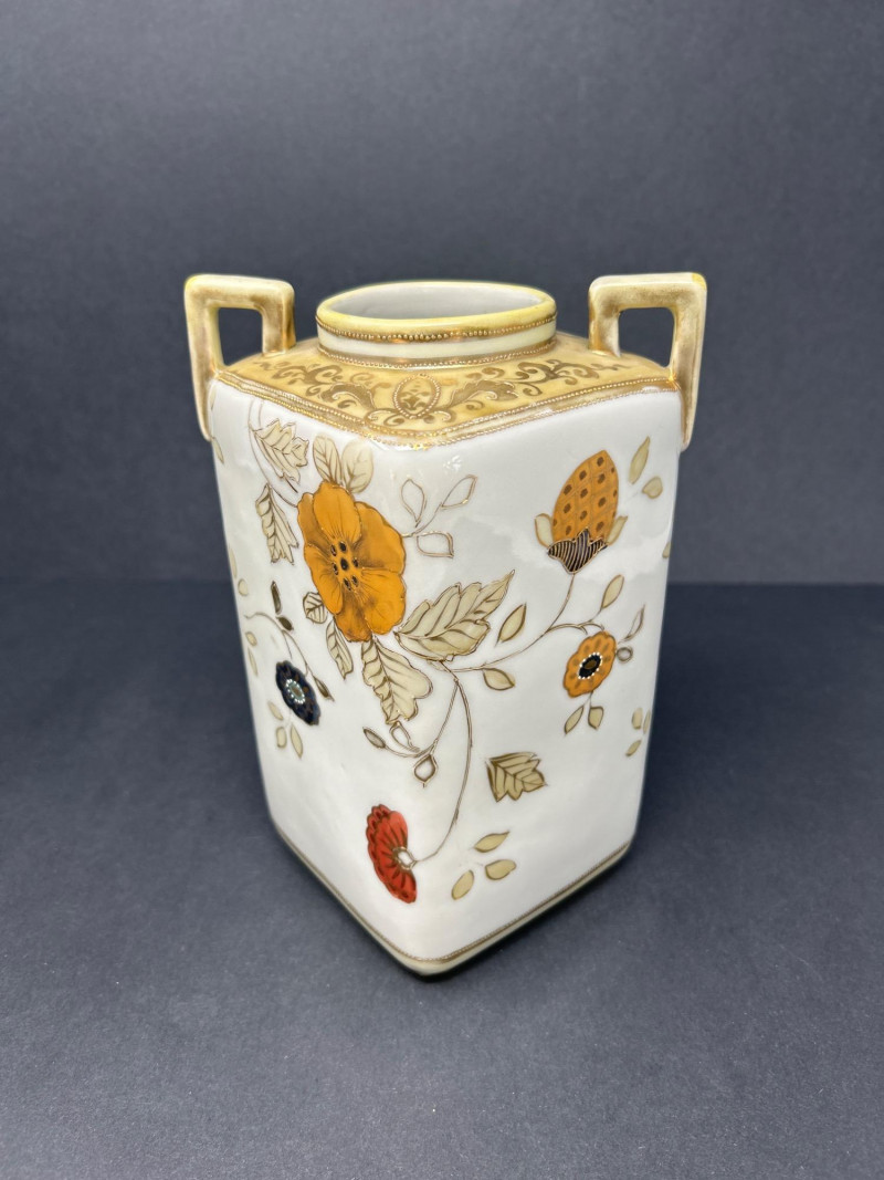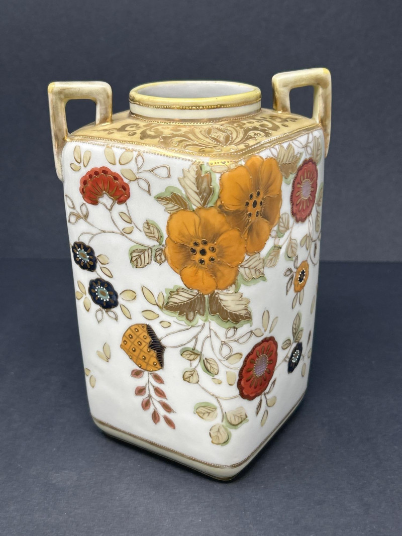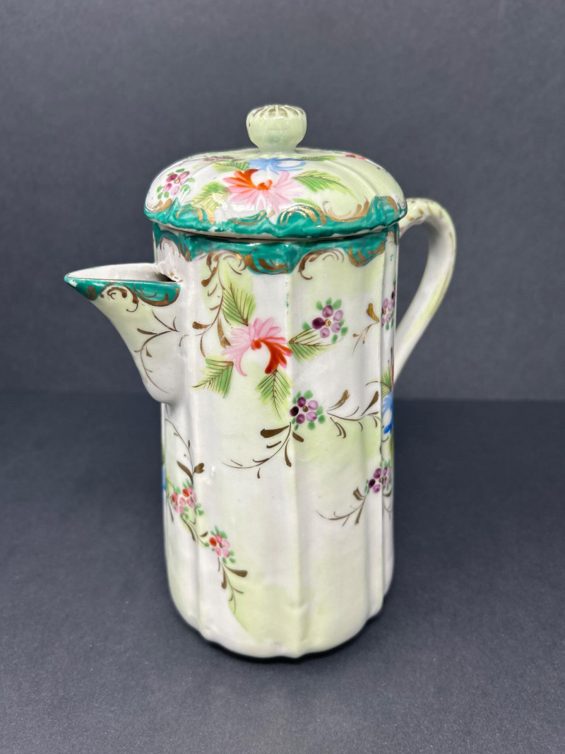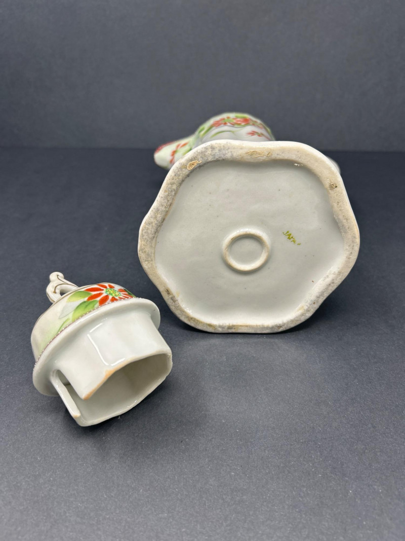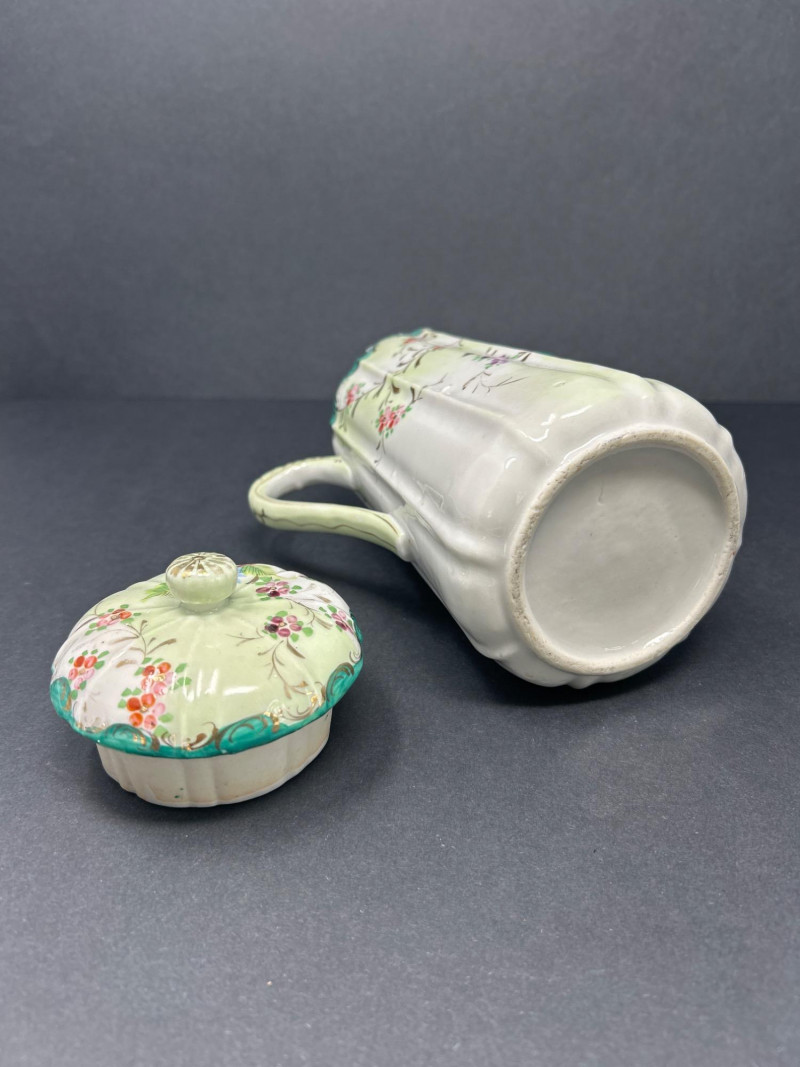 A charming ensemble of early Nippon porcelain, featuring: Two Chocolate Pots – One with a softly fluted body, hand-painted with pastel florals in pink, blue, and violet, and a scalloped green lid with teal trim. The other with a crisp white ground, red and green floral sprays, and a flared rim with red accenting. Both stand approx. 10" tall. One Ginger Jar – Rectangular form with stylized orange and black chrysanthemums and foliage. A rare silhouette with a flat lid and subtle gilt accents. Material: Porcelain with hand-painted enamel