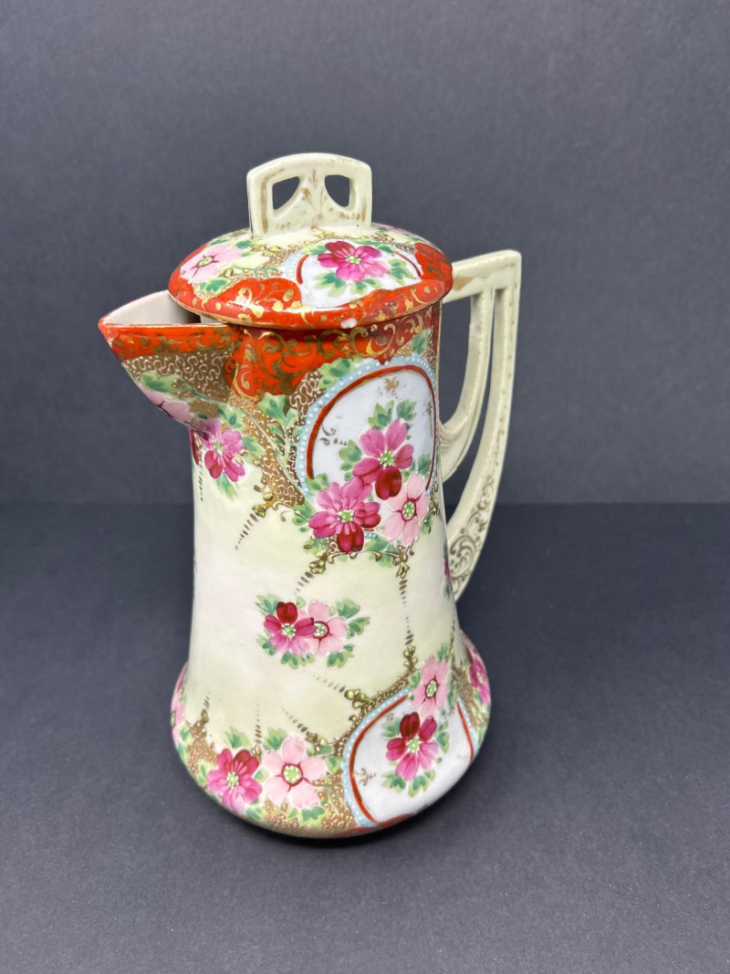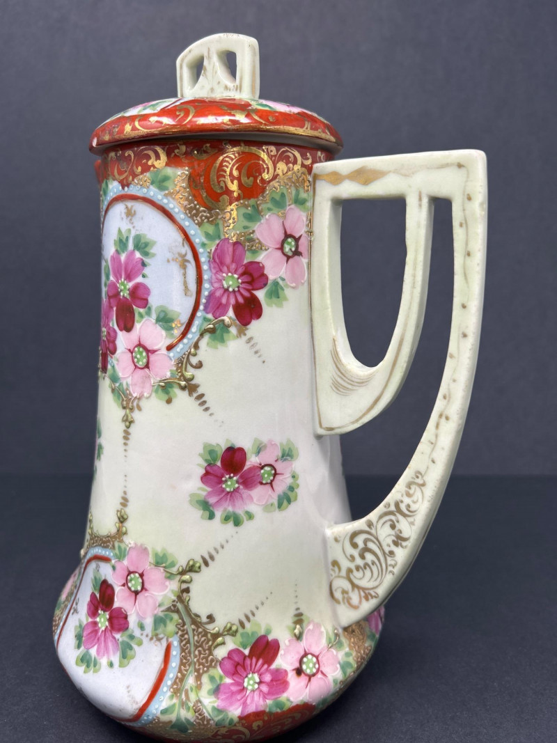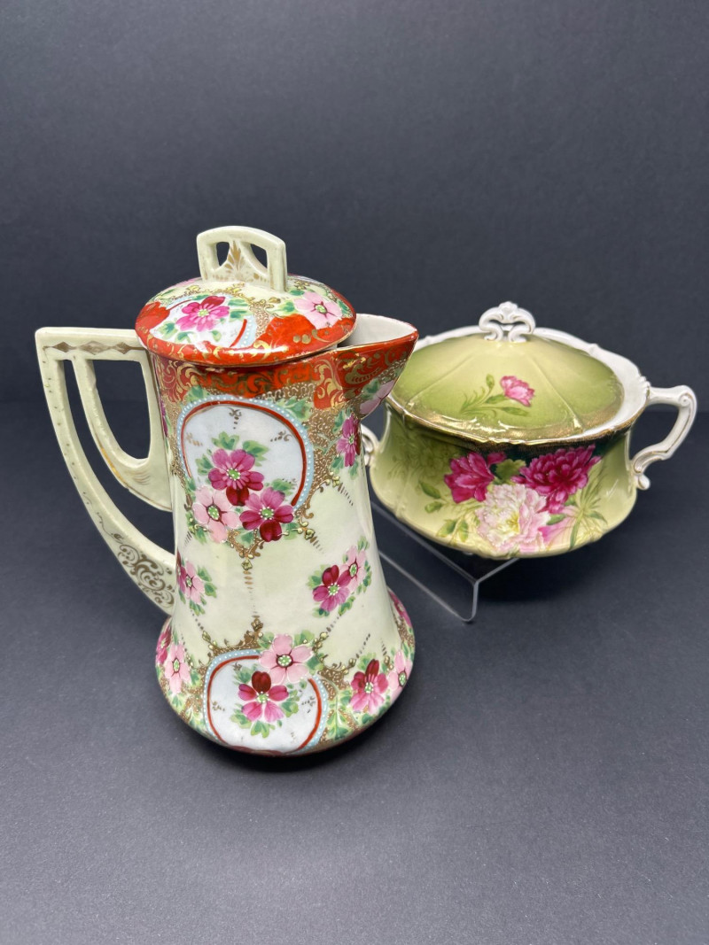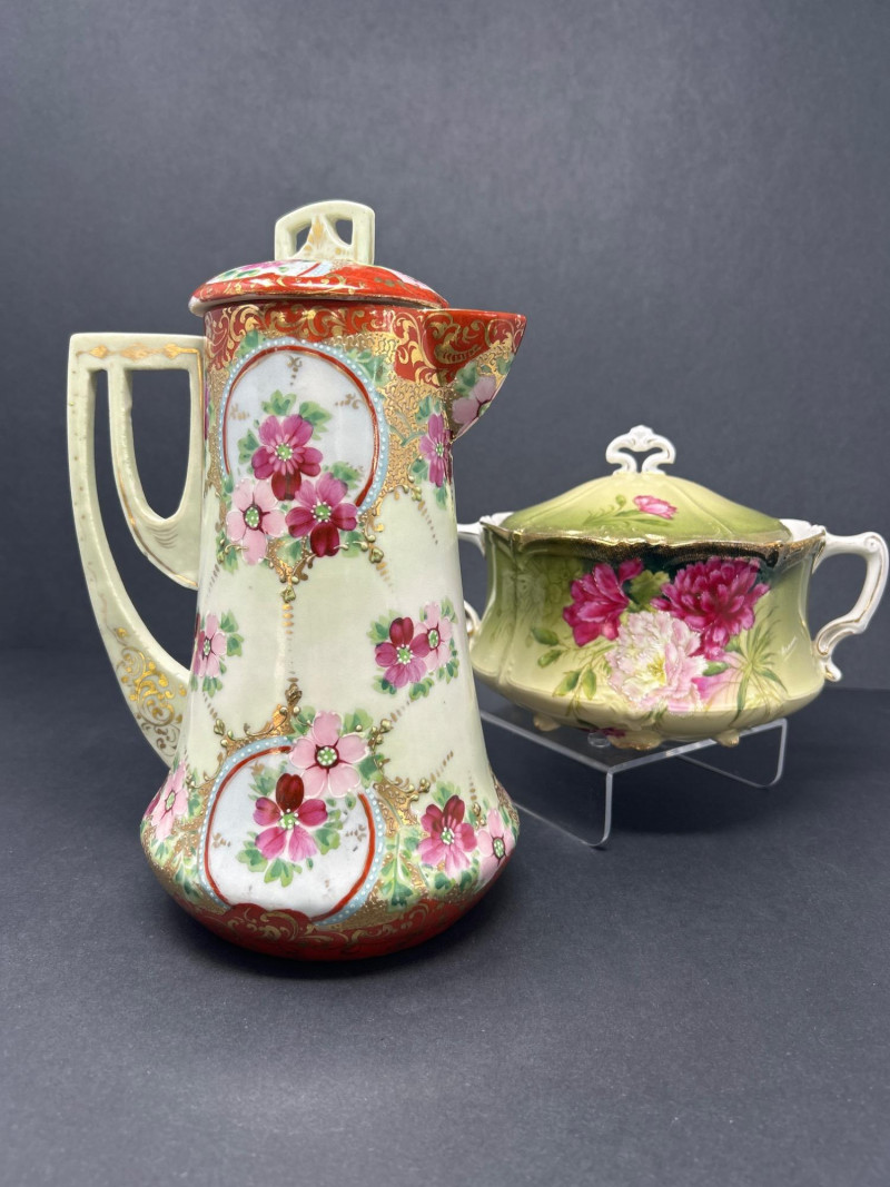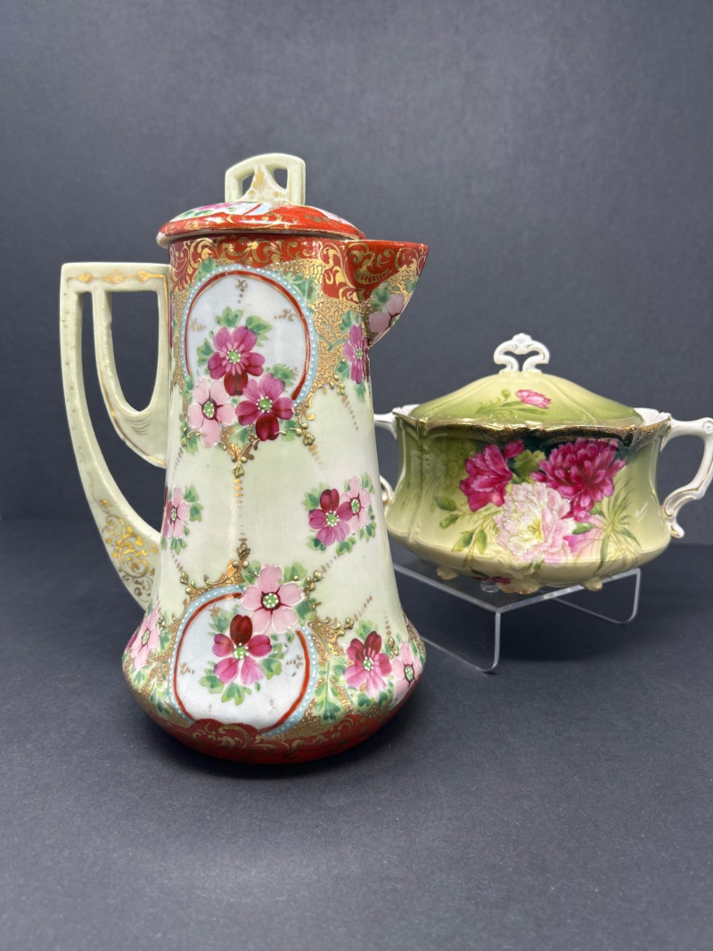 A charming duo of antique porcelain serving pieces: Chocolate Pot: Nippon origin, standing 10" tall. Features classic hand-painted detailing, likely floral or gilt, in the tradition of early 20th-century Japanese export ware. Sugar Dish: Bavarian-made, 6" tall and 7" wide. Typically adorned with romantic florals and gold accents, this piece complements the chocolate pot with European elegance.