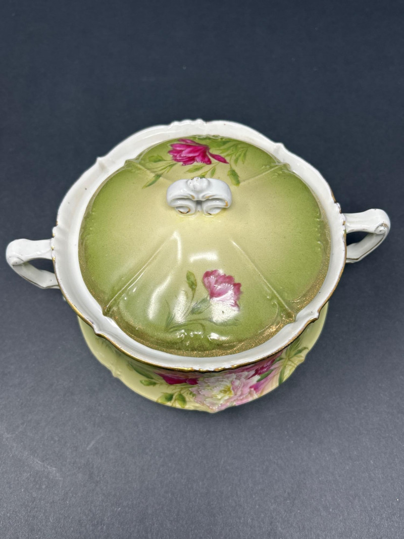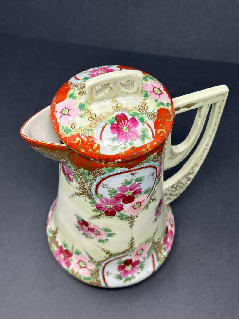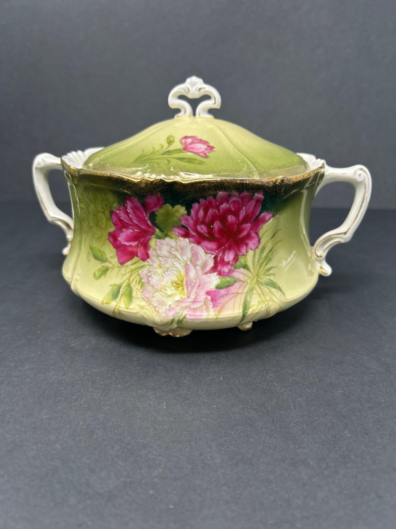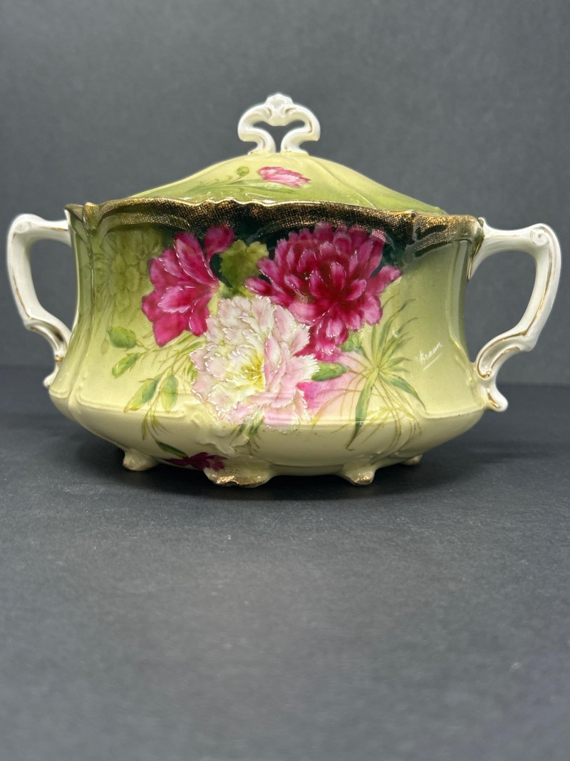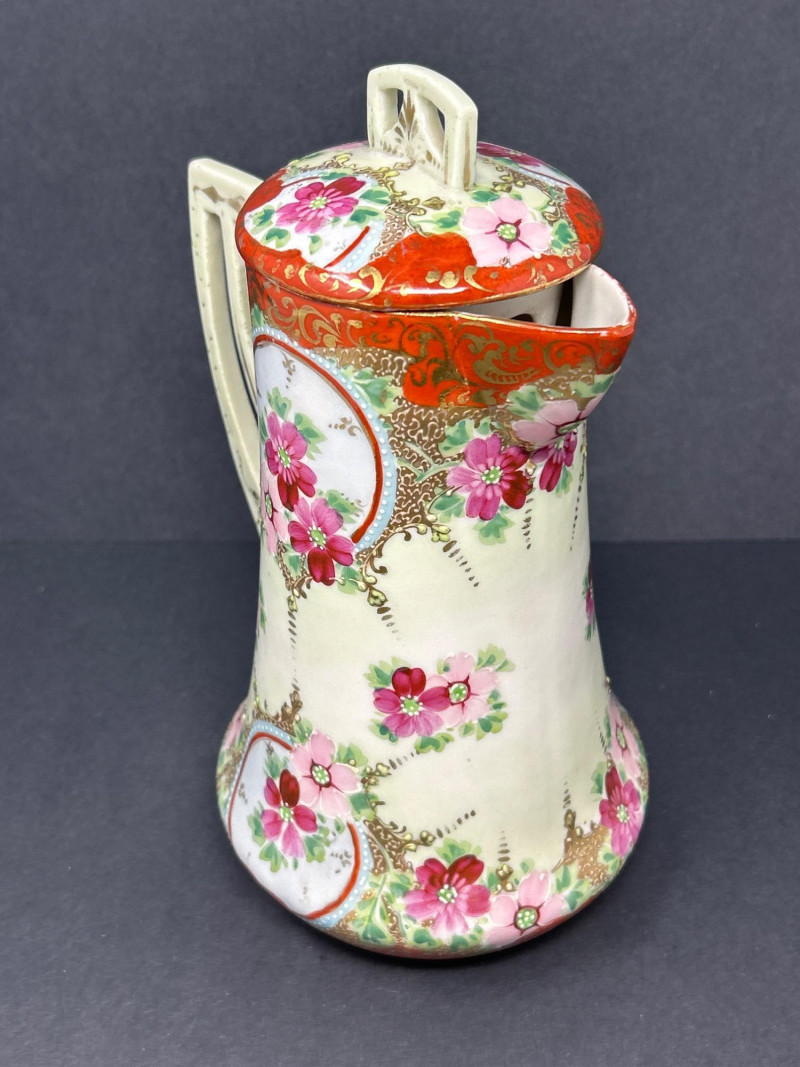 A charming duo of antique porcelain serving pieces: Chocolate Pot: Nippon origin, standing 10" tall. Features classic hand-painted detailing, likely floral or gilt, in the tradition of early 20th-century Japanese export ware. Sugar Dish: Bavarian-made, 6" tall and 7" wide. Typically adorned with romantic florals and gold accents, this piece complements the chocolate pot with European elegance.