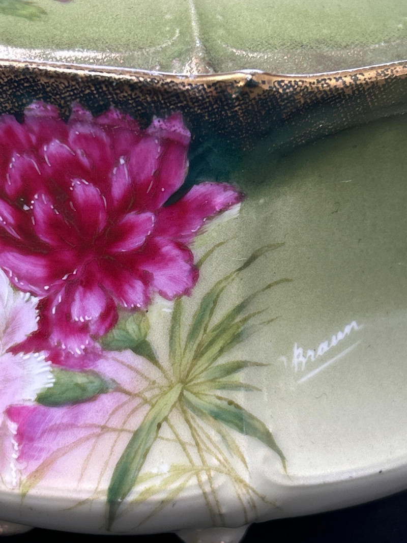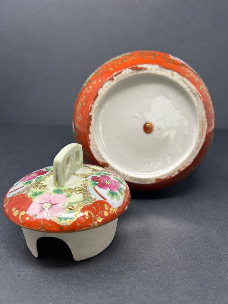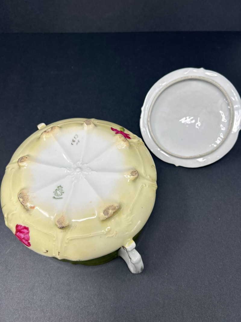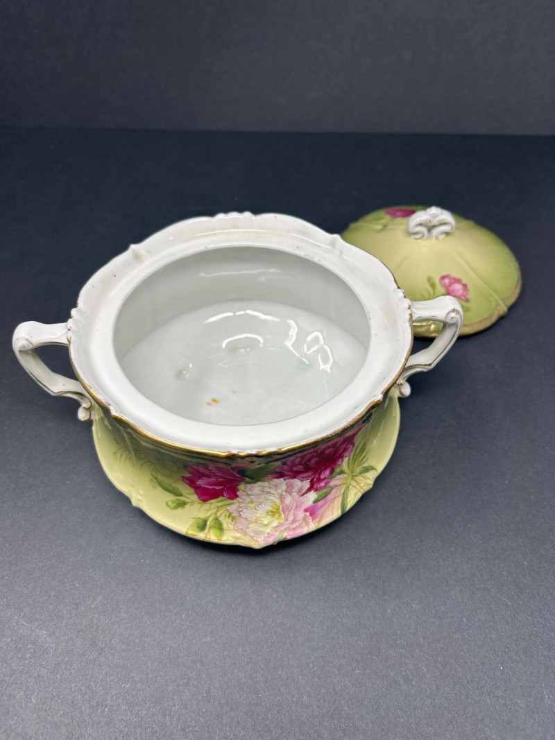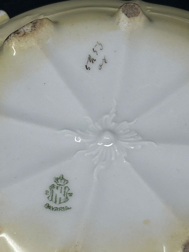 A charming duo of antique porcelain serving pieces: Chocolate Pot: Nippon origin, standing 10" tall. Features classic hand-painted detailing, likely floral or gilt, in the tradition of early 20th-century Japanese export ware. Sugar Dish: Bavarian-made, 6" tall and 7" wide. Typically adorned with romantic florals and gold accents, this piece complements the chocolate pot with European elegance.