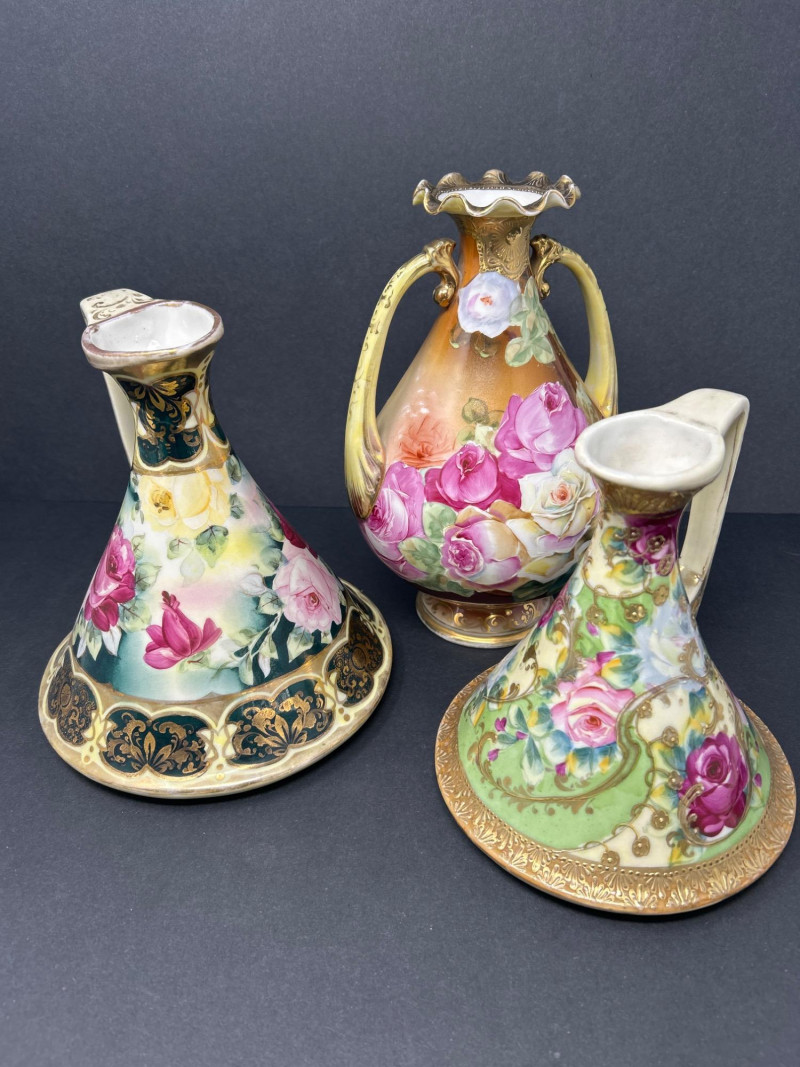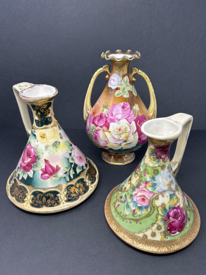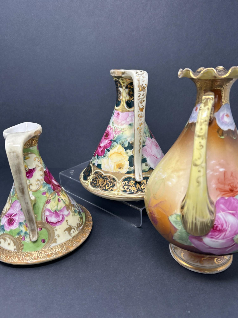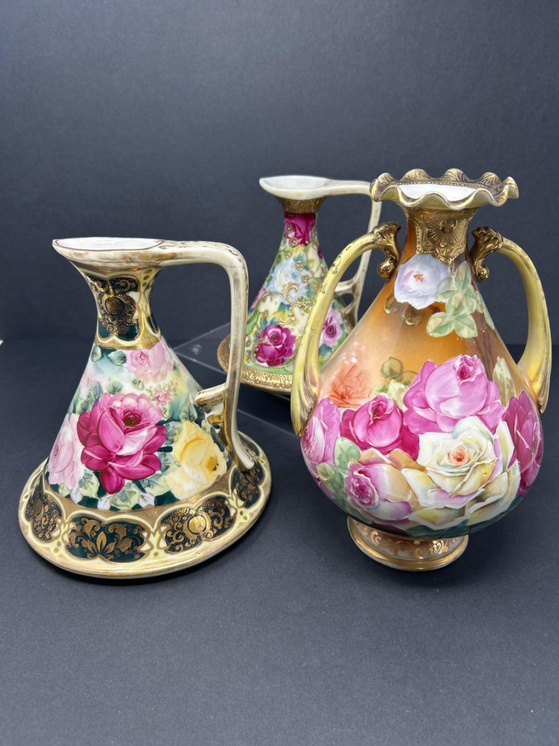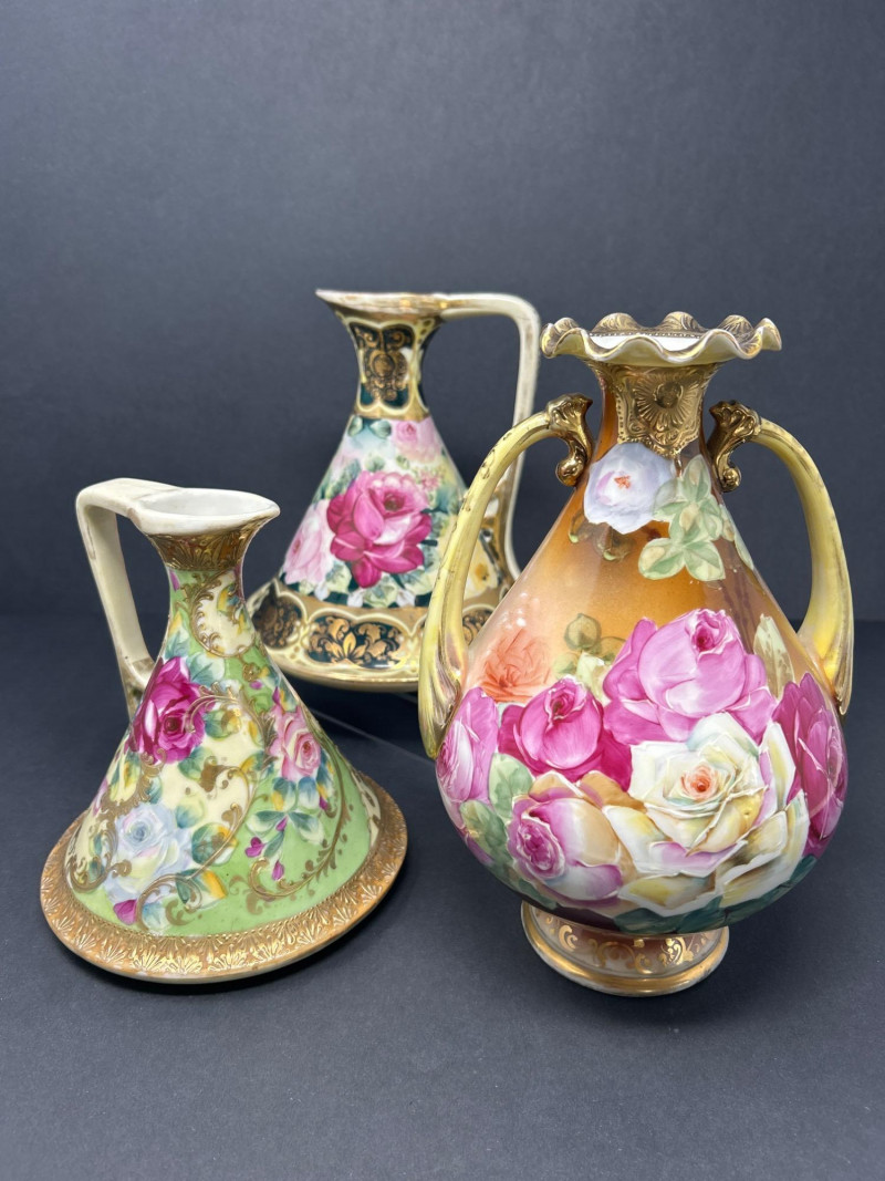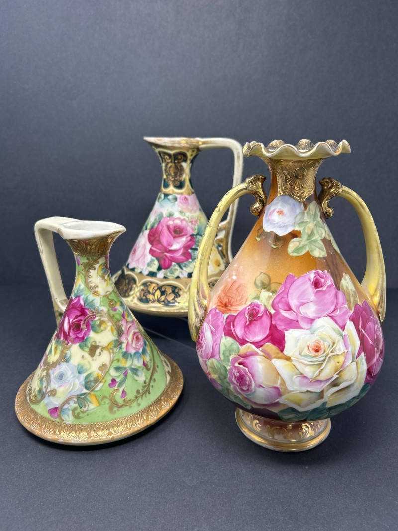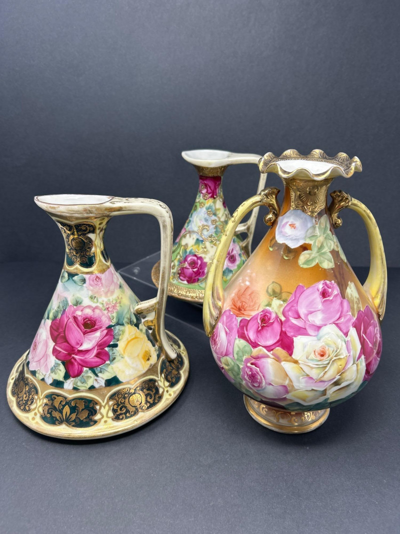 A radiant trio of hand-painted Nippon porcelain, each piece showcasing lush florals and ornate gilding in classic moriage style: Two Moriage Ewers: Each ewer features a flared base and slender neck, adorned with vibrant roses in pink, yellow, and white. The handles are elegantly curved, and the bases are trimmed in raised gold scrollwork. Double-Handled Vase: A richly colored vase with scalloped rim and twin handles, decorated with a profusion of roses in full bloom. The warm amber-to-cream gradient background enhances the depth of the floral palette, while raised gilt accents add texture and opulence. Dimensions: