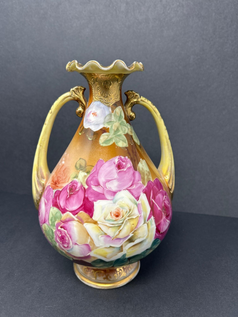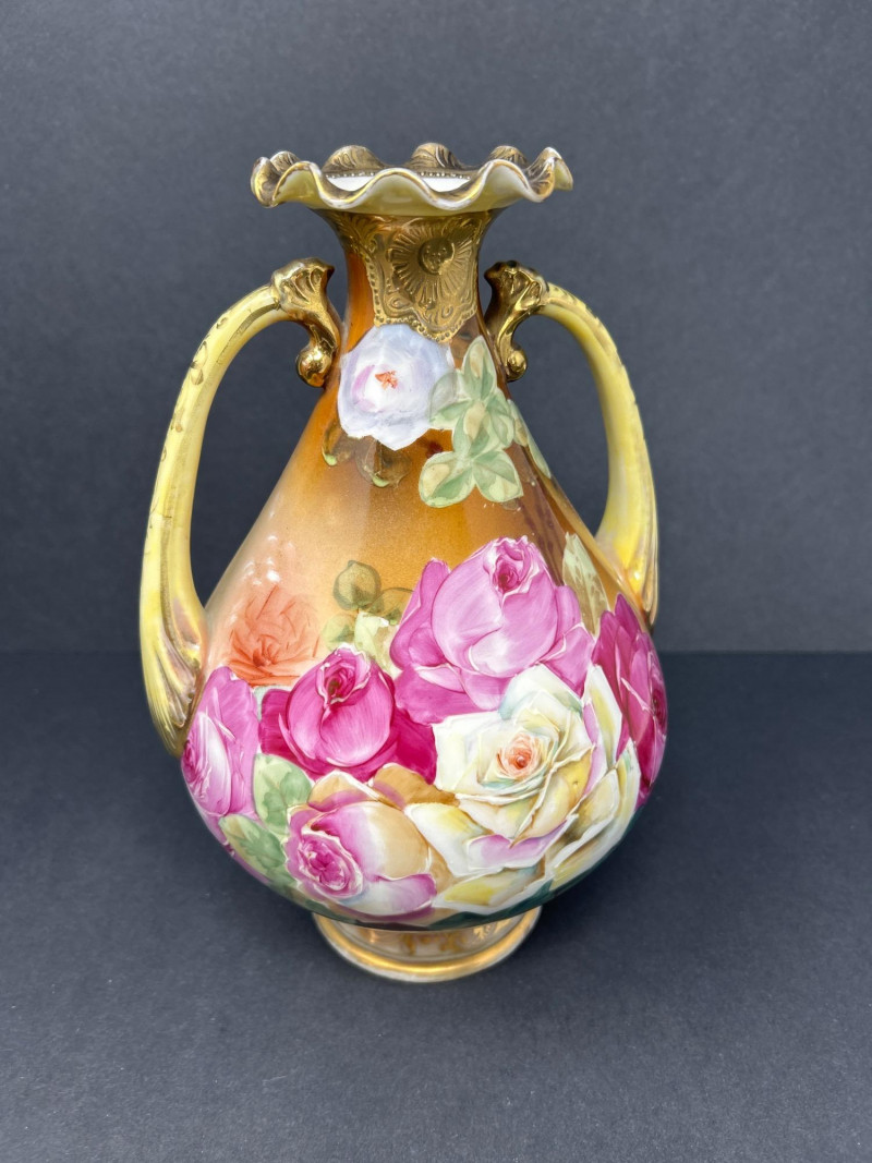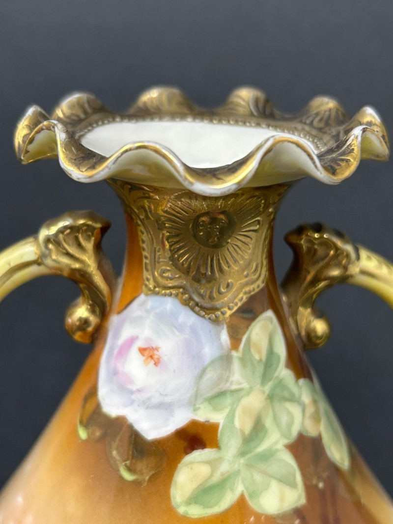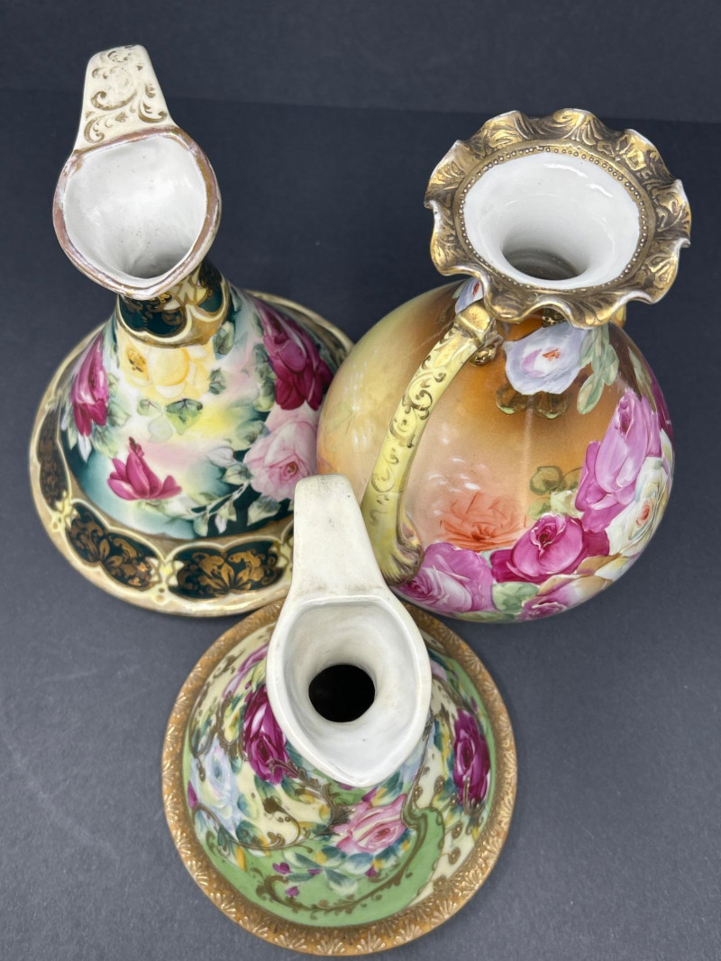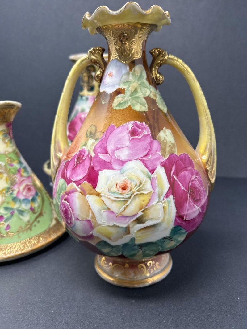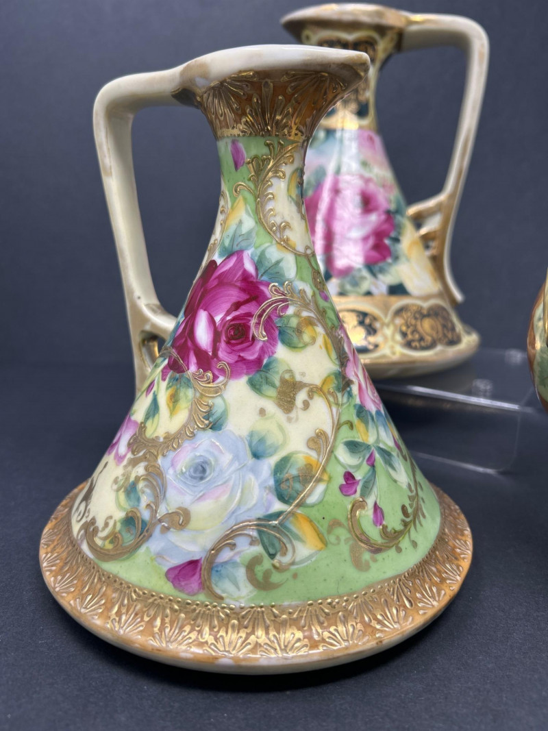 A radiant trio of hand-painted Nippon porcelain, each piece showcasing lush florals and ornate gilding in classic moriage style: Two Moriage Ewers: Each ewer features a flared base and slender neck, adorned with vibrant roses in pink, yellow, and white. The handles are elegantly curved, and the bases are trimmed in raised gold scrollwork. Double-Handled Vase: A richly colored vase with scalloped rim and twin handles, decorated with a profusion of roses in full bloom. The warm amber-to-cream gradient background enhances the depth of the floral palette, while raised gilt accents add texture and opulence. Dimensions: