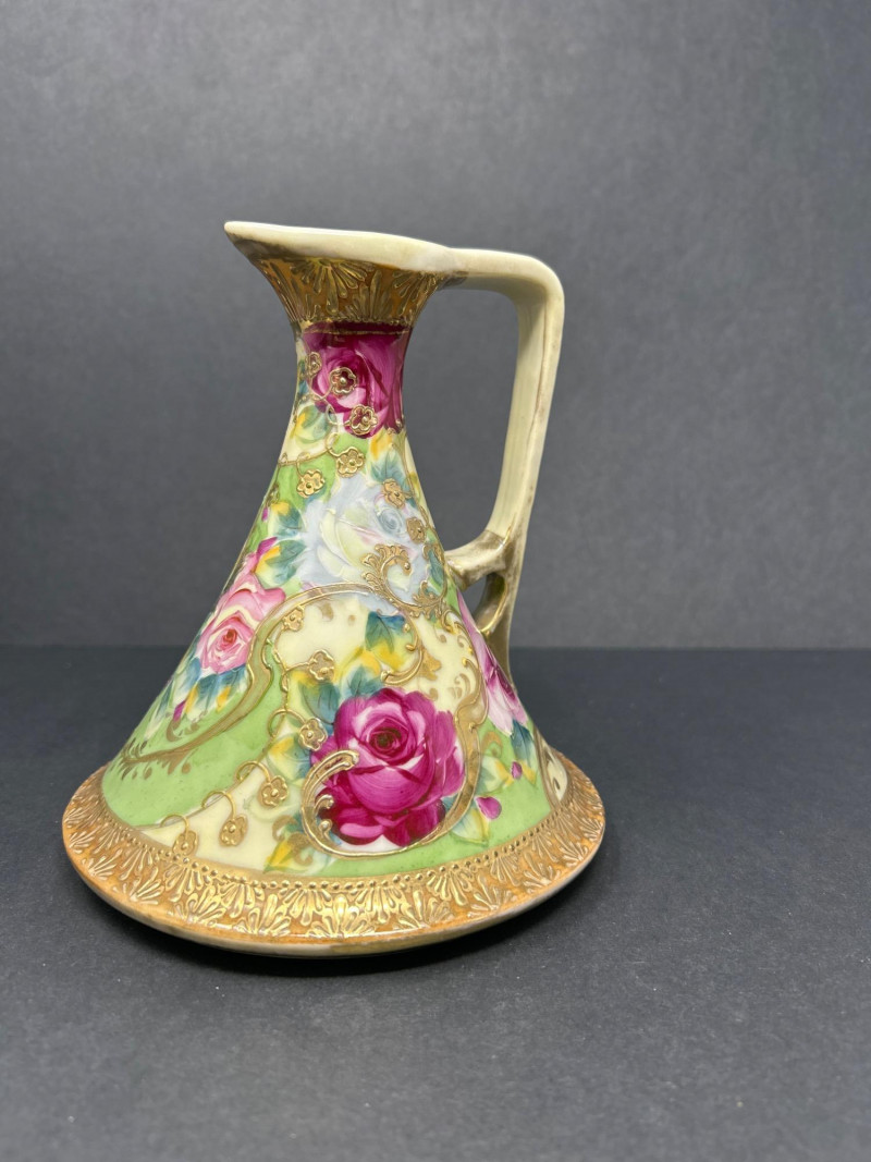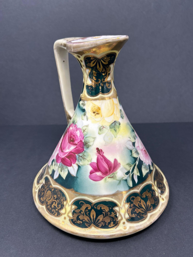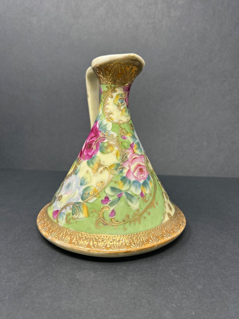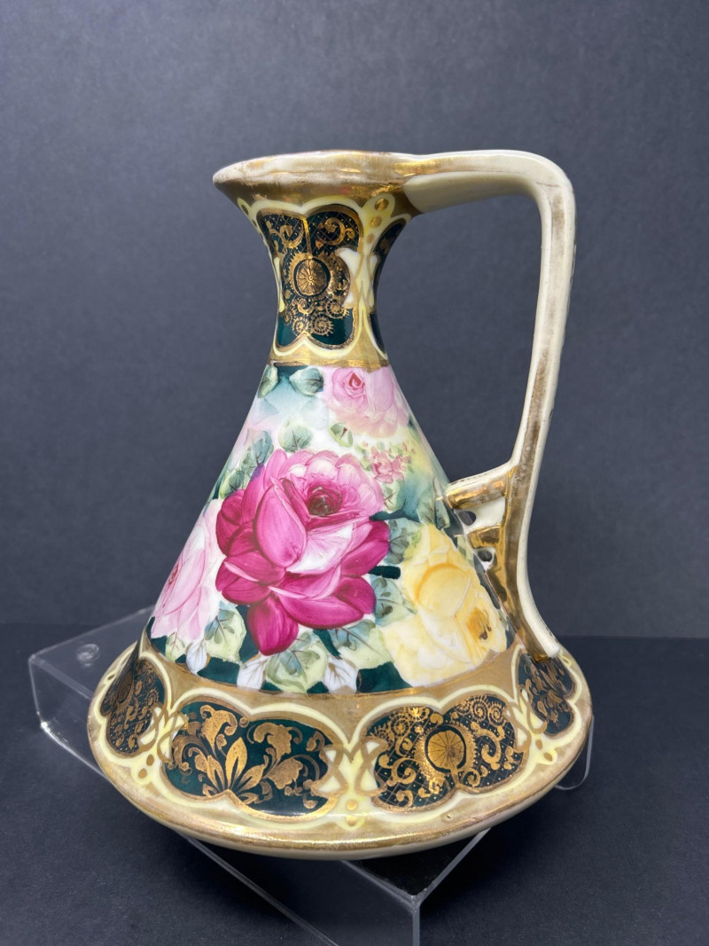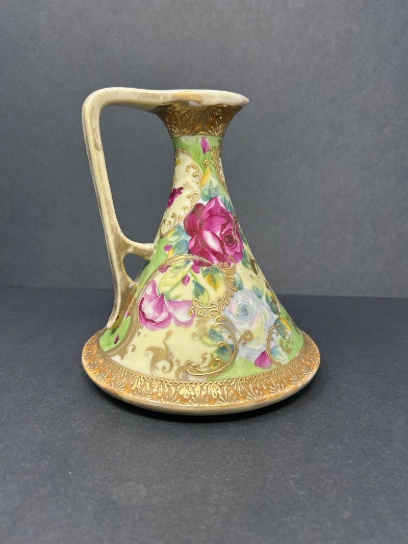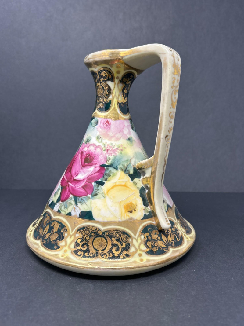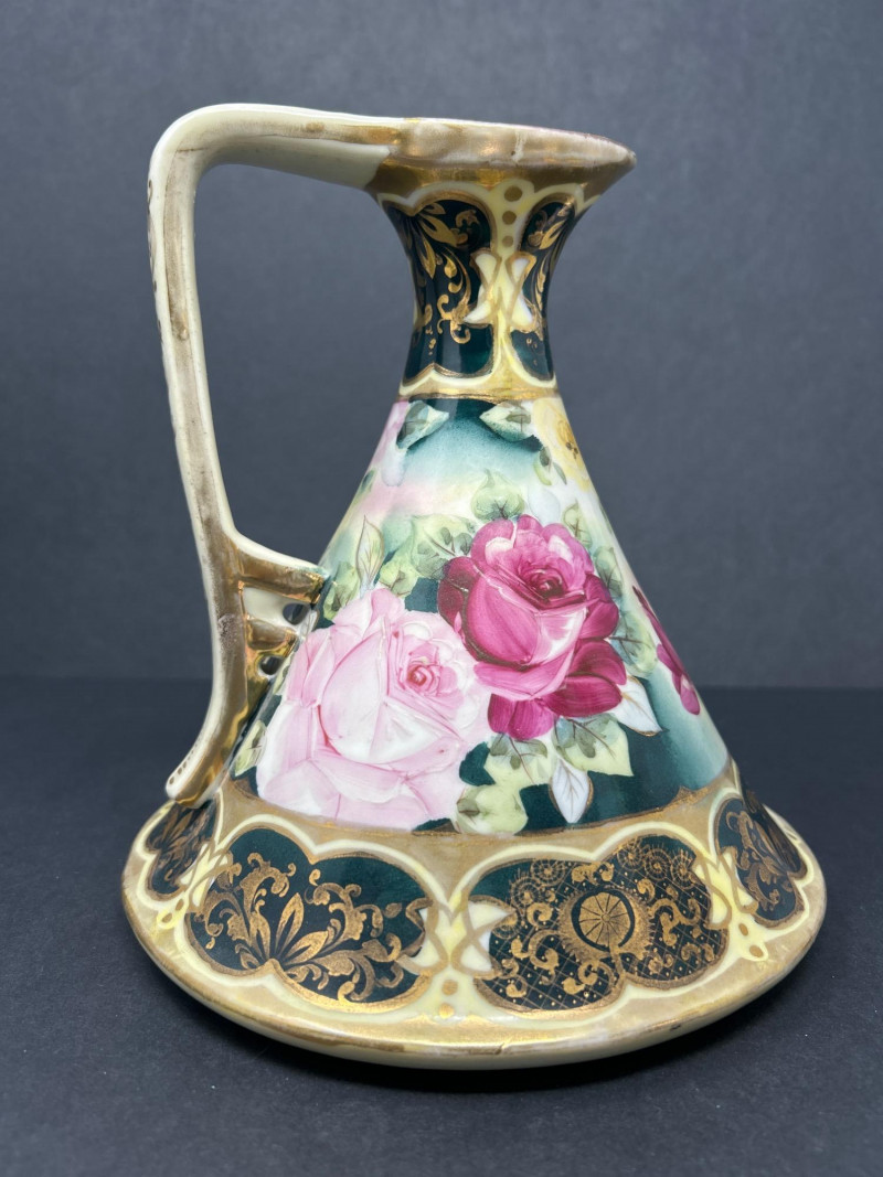 A radiant trio of hand-painted Nippon porcelain, each piece showcasing lush florals and ornate gilding in classic moriage style: Two Moriage Ewers: Each ewer features a flared base and slender neck, adorned with vibrant roses in pink, yellow, and white. The handles are elegantly curved, and the bases are trimmed in raised gold scrollwork. Double-Handled Vase: A richly colored vase with scalloped rim and twin handles, decorated with a profusion of roses in full bloom. The warm amber-to-cream gradient background enhances the depth of the floral palette, while raised gilt accents add texture and opulence. Dimensions: