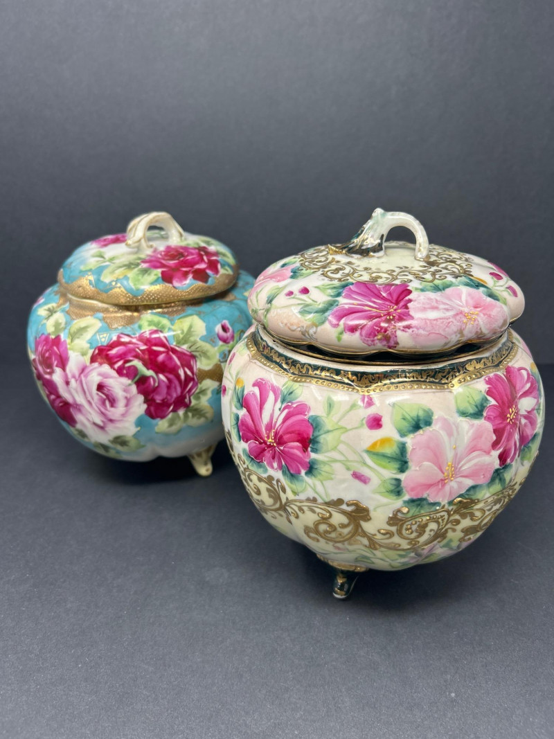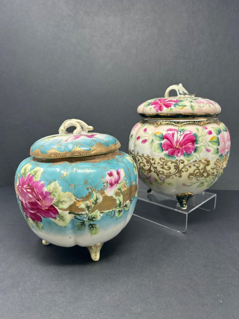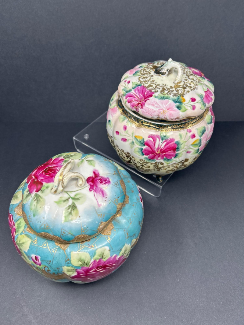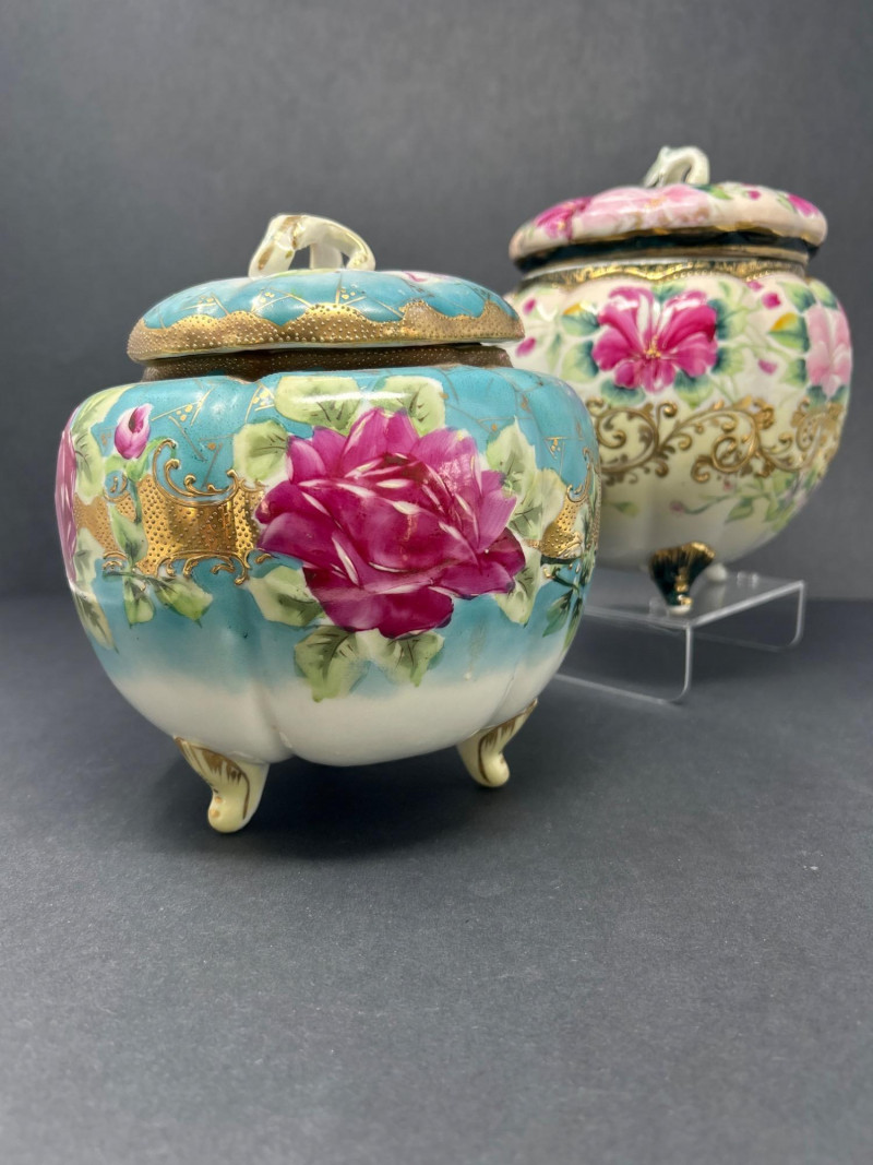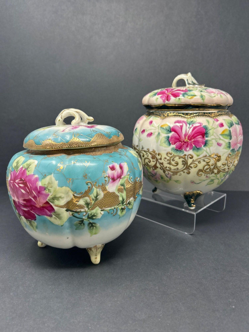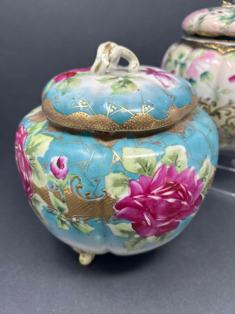 Highly collectible for lovers of Nippon porcelain and Victorian tableware. These jars serve beautifully as decorative accents or functional storage for confections or keepsakes.