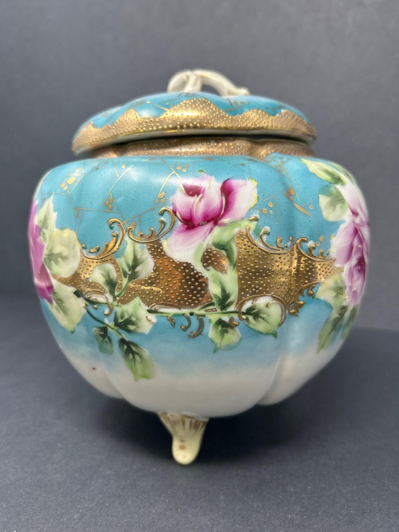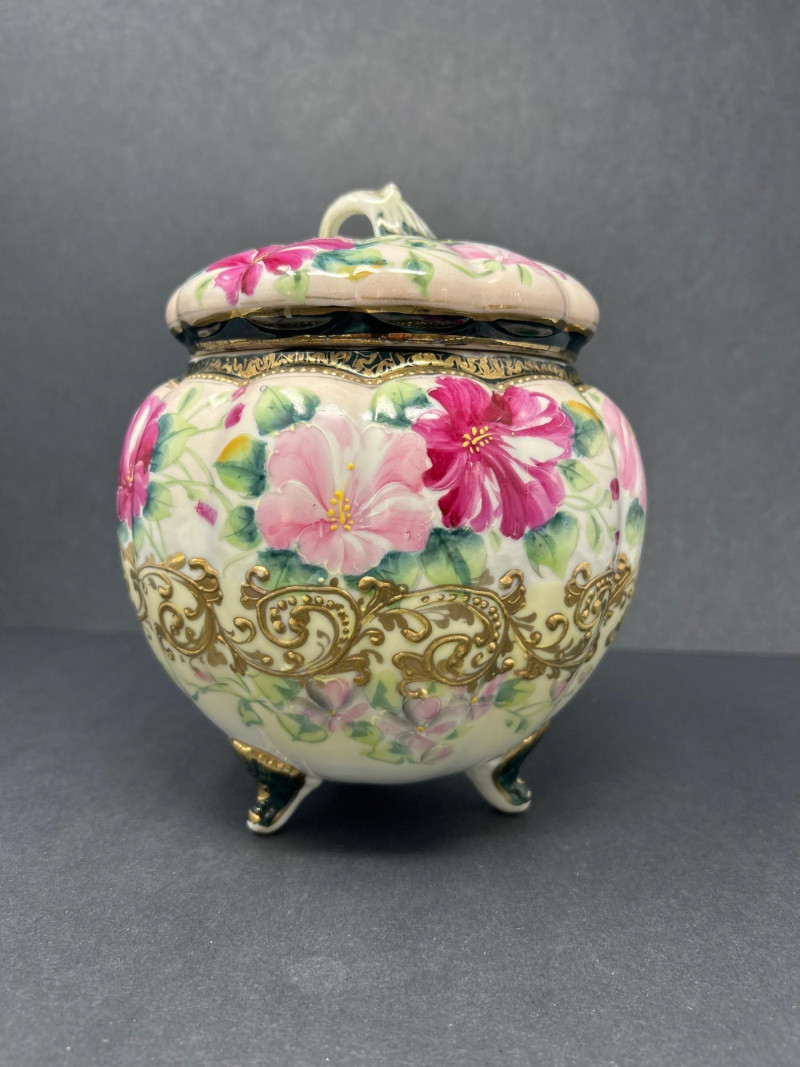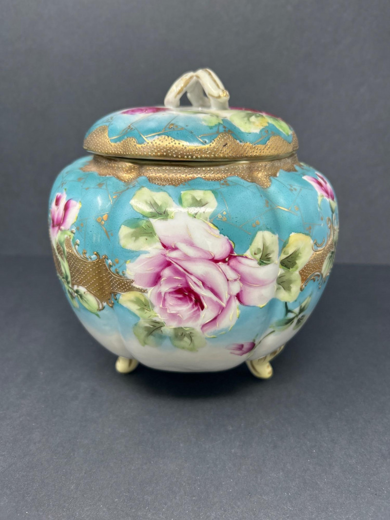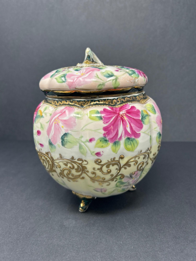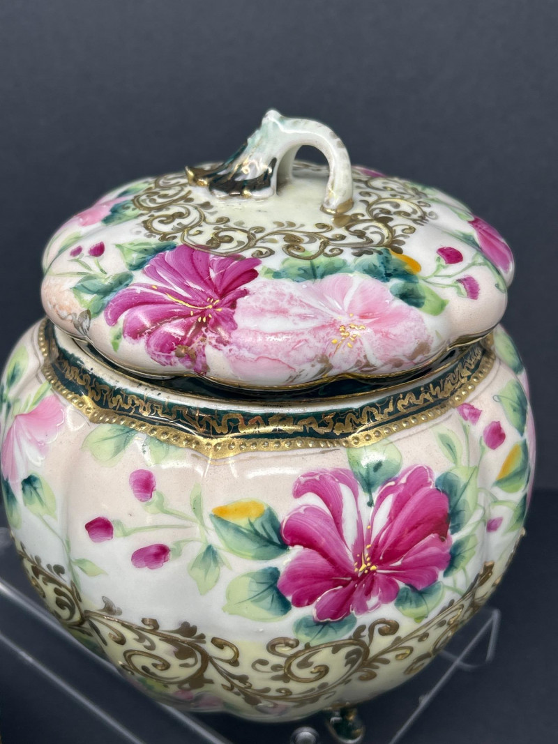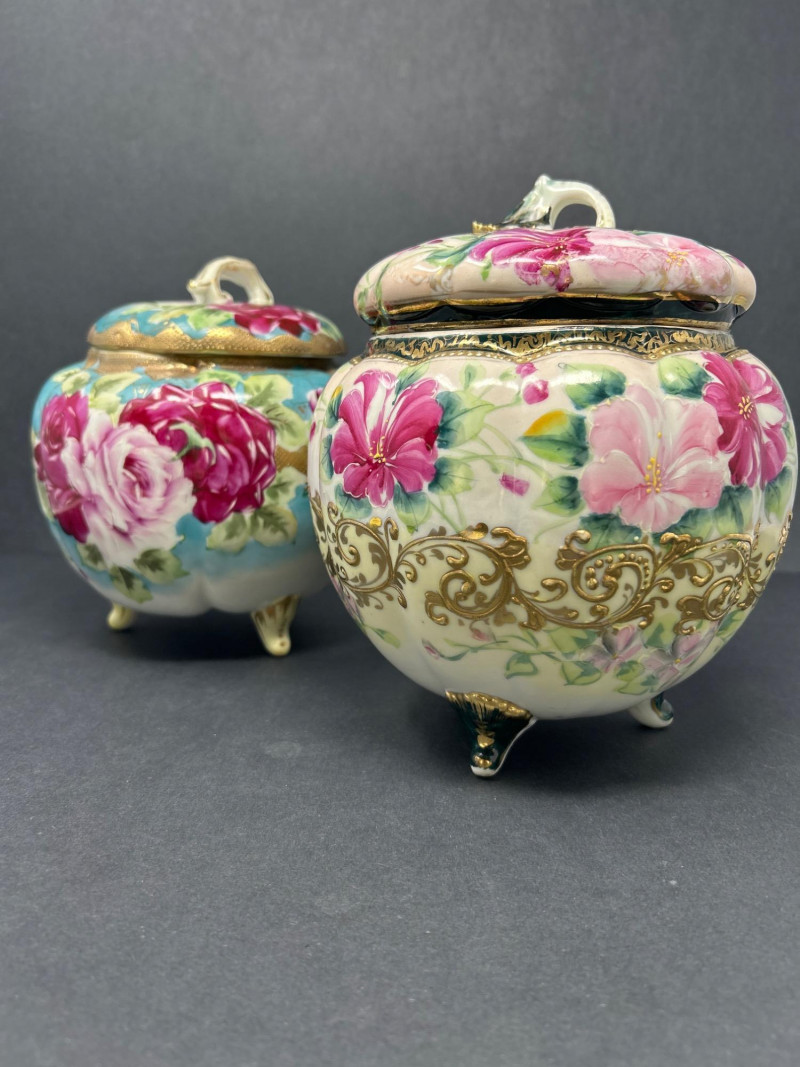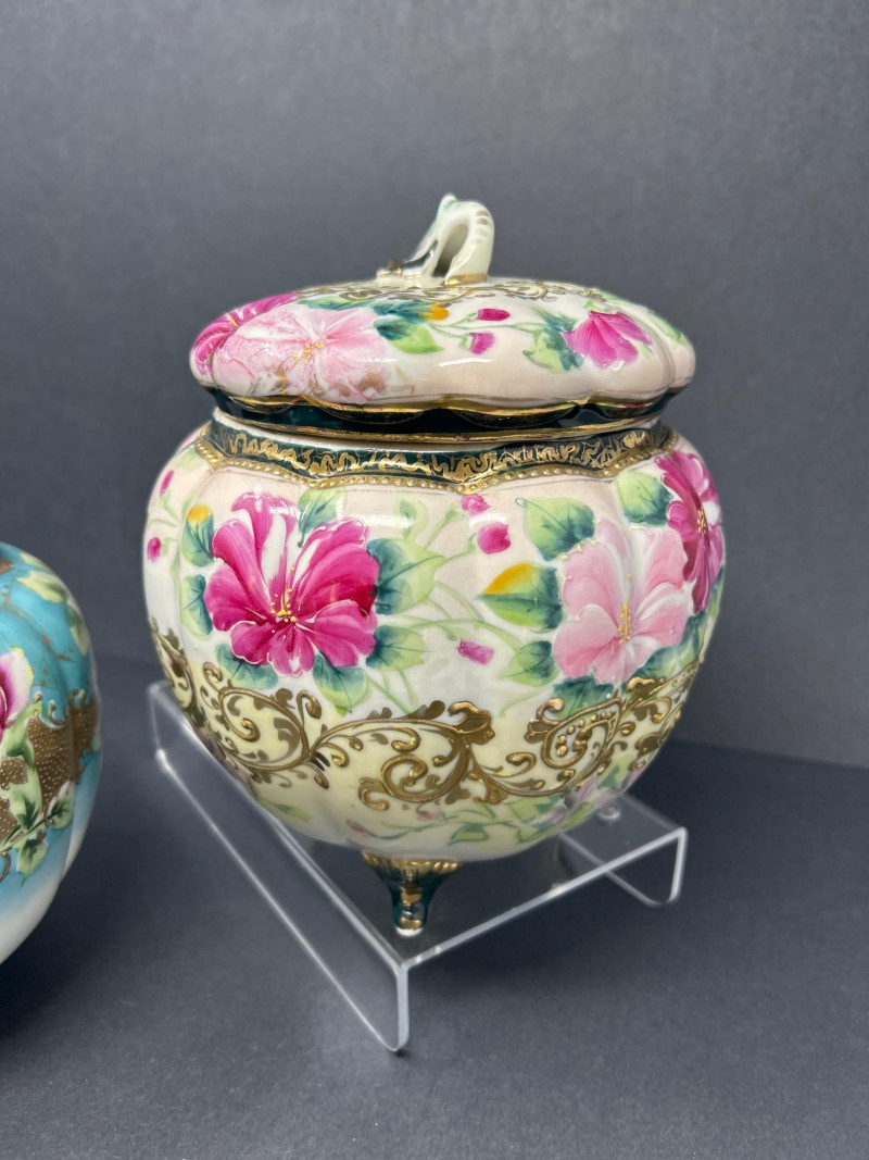 Highly collectible for lovers of Nippon porcelain and Victorian tableware. These jars serve beautifully as decorative accents or functional storage for confections or keepsakes.