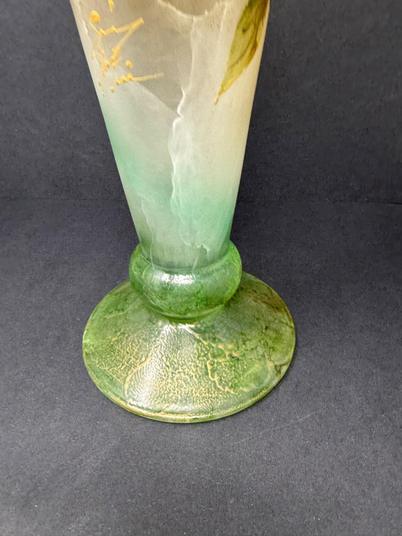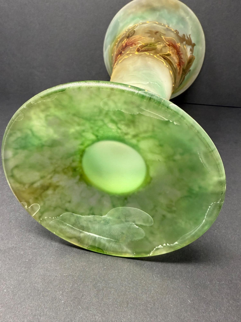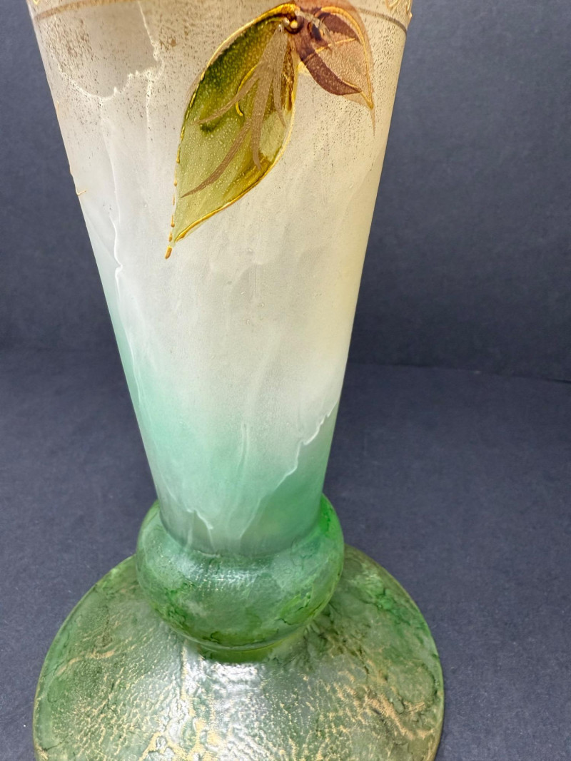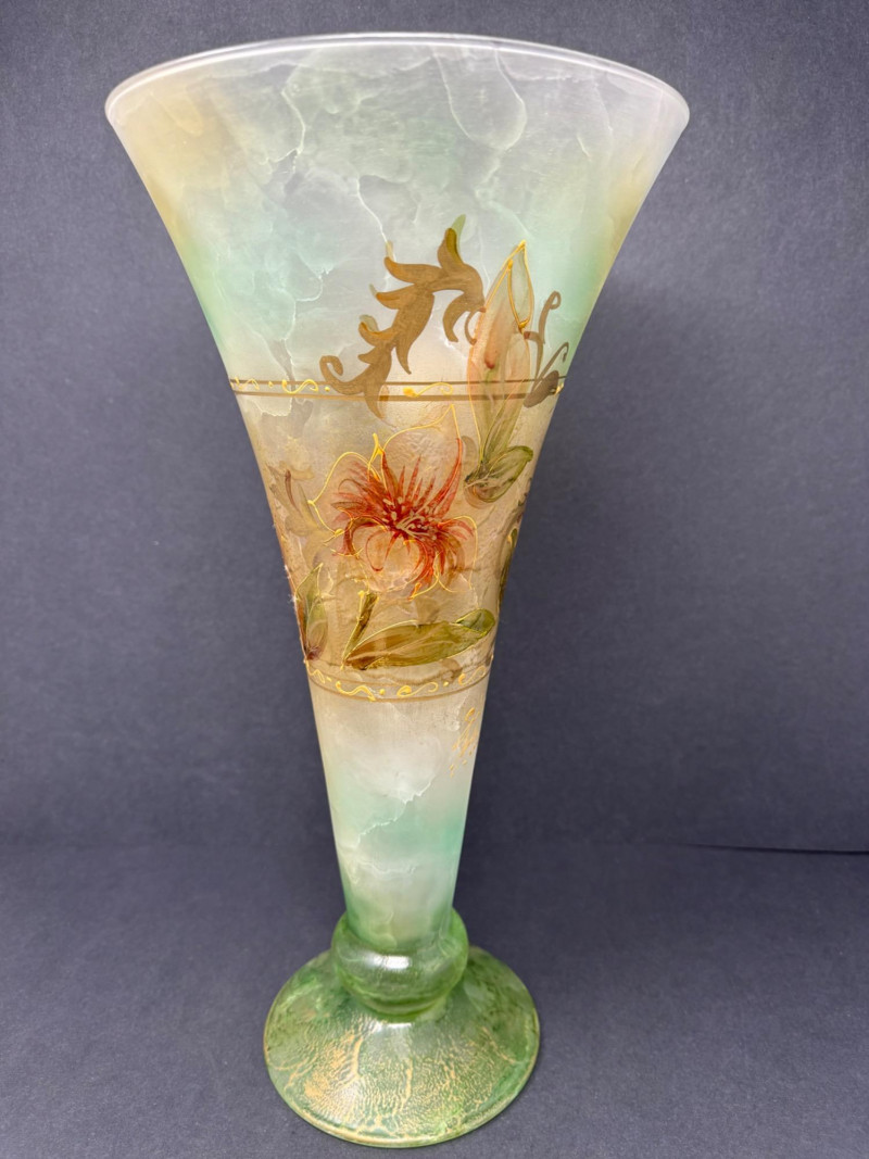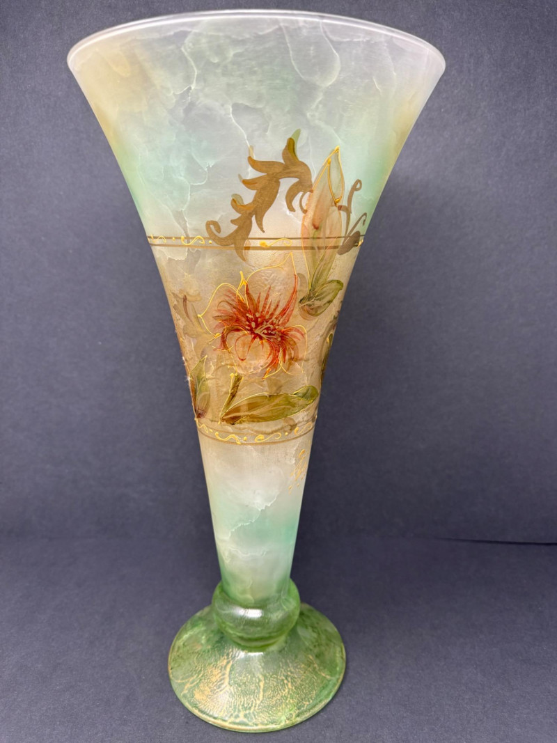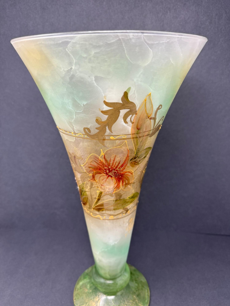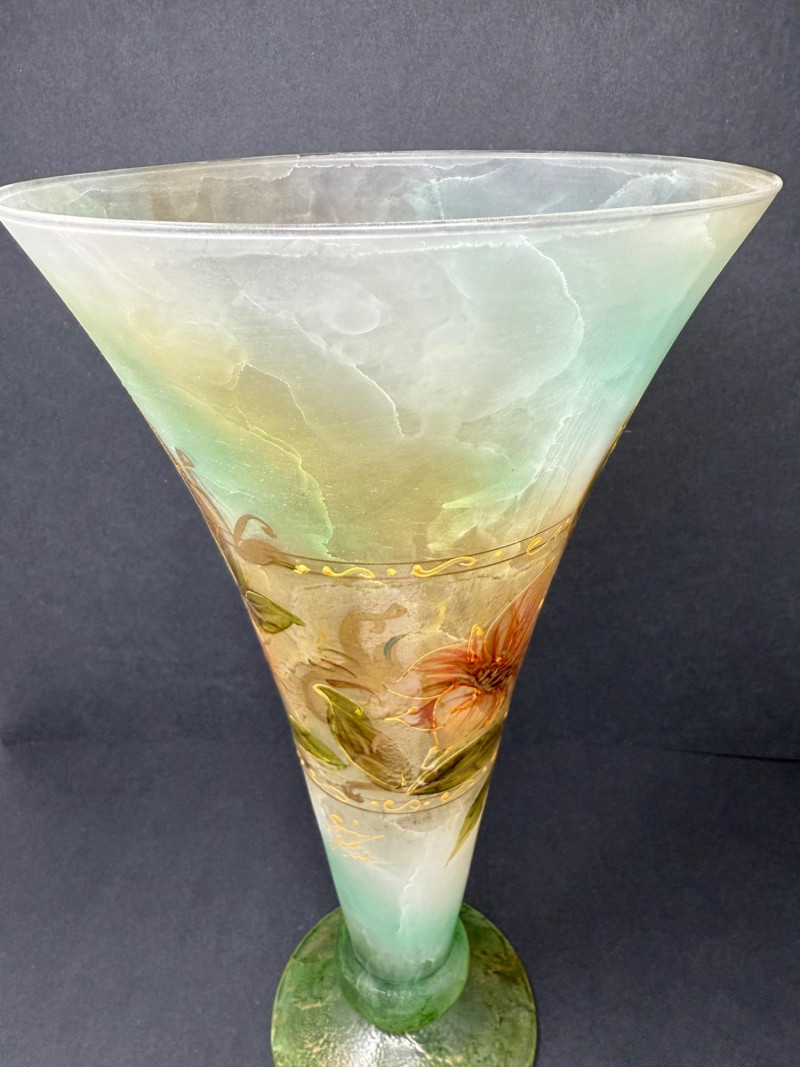 Flora in Flame: A Murano Ode to Color and Craft A radiant example of Murano glass artistry, this hand-blown vase by Gipar features a dramatic gradient from emerald green at the base to a translucent ivory at the rim, evoking the shift from forest floor to morning mist. The surface is adorned with a vivid red-orange flower, its petals unfurling in high relief, surrounded by lush green leaves and gilded accents that shimmer like sunlight on dew. The marbled texture and flared silhouette add movement and depth, while the gold detailing around the midsection lends a regal finish. At 16.5" tall, it commands attention without overwhelming, making it a perfect centerpiece or collector’s display. Measures- 16.5T x 8.5W