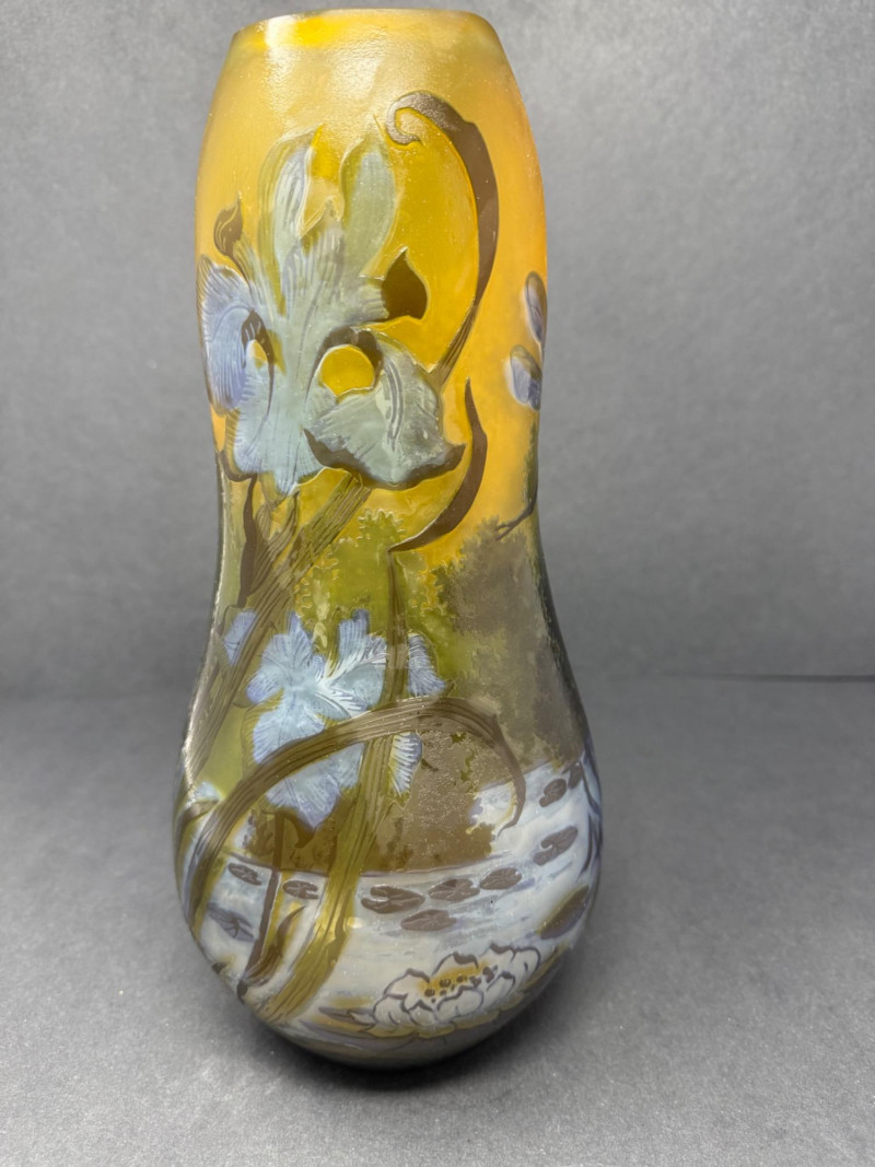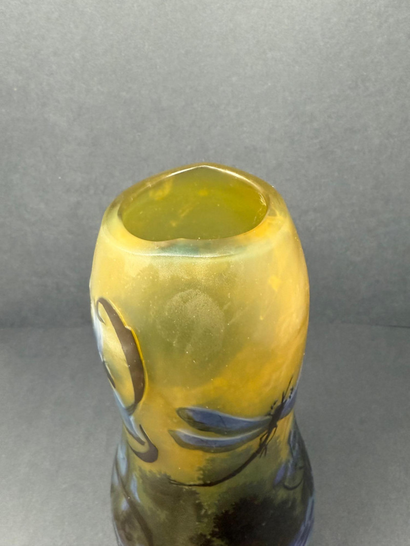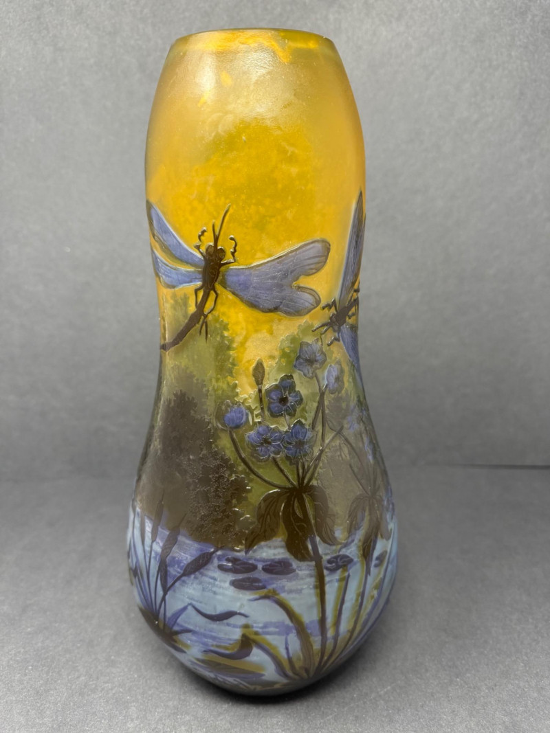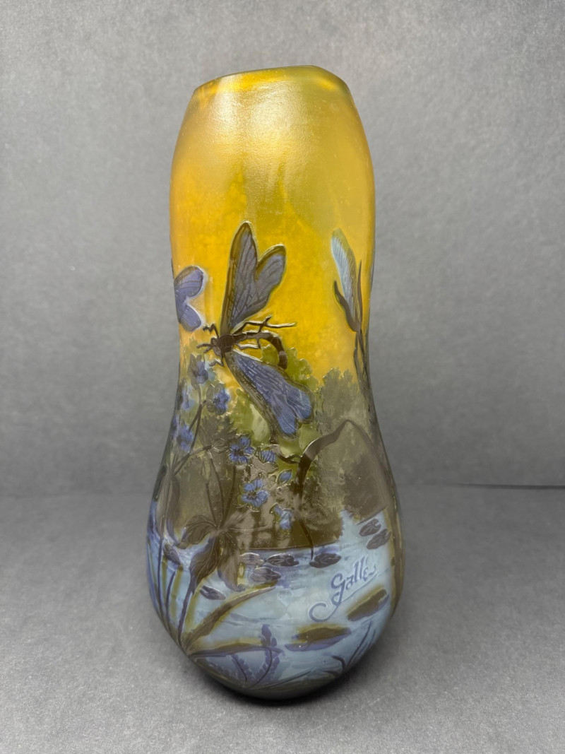 This striking vase evokes the spirit of Émile Gallé’s celebrated Art Nouveau glasswork, with a richly layered cameo design featuring dragonflies, wildflowers, and foliage in full poetic flight. The color gradient—deep cobalt blue rising into warm amber—sets a moody twilight scene, while the etched and enameled details bring the natural motif to life. The bulbous base and slender neck echo classic Gallé forms, and the “Gallé” signature near the base suggests homage to the master’s legacy. While the origin of this piece remains unverified, its craftsmanship and visual impact make it a compelling addition for collectors who appreciate the style and symbolism of turn-of-the-century French glass. 12.5T x 5W