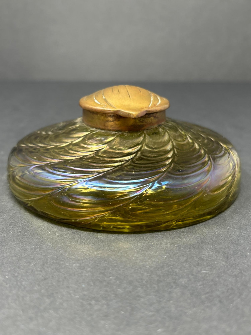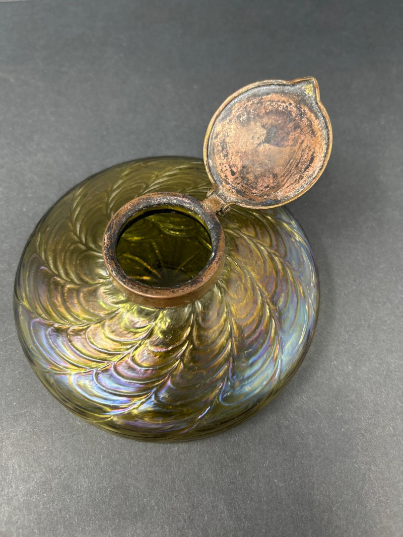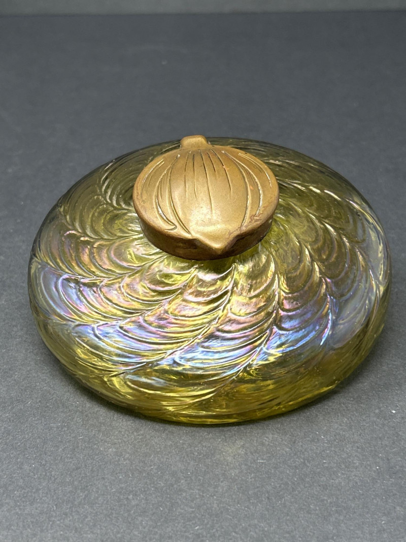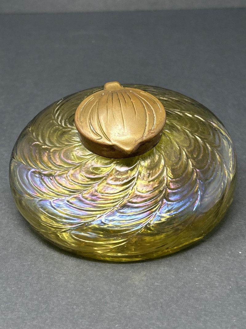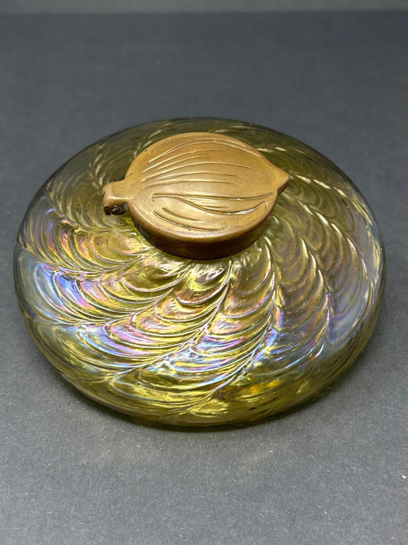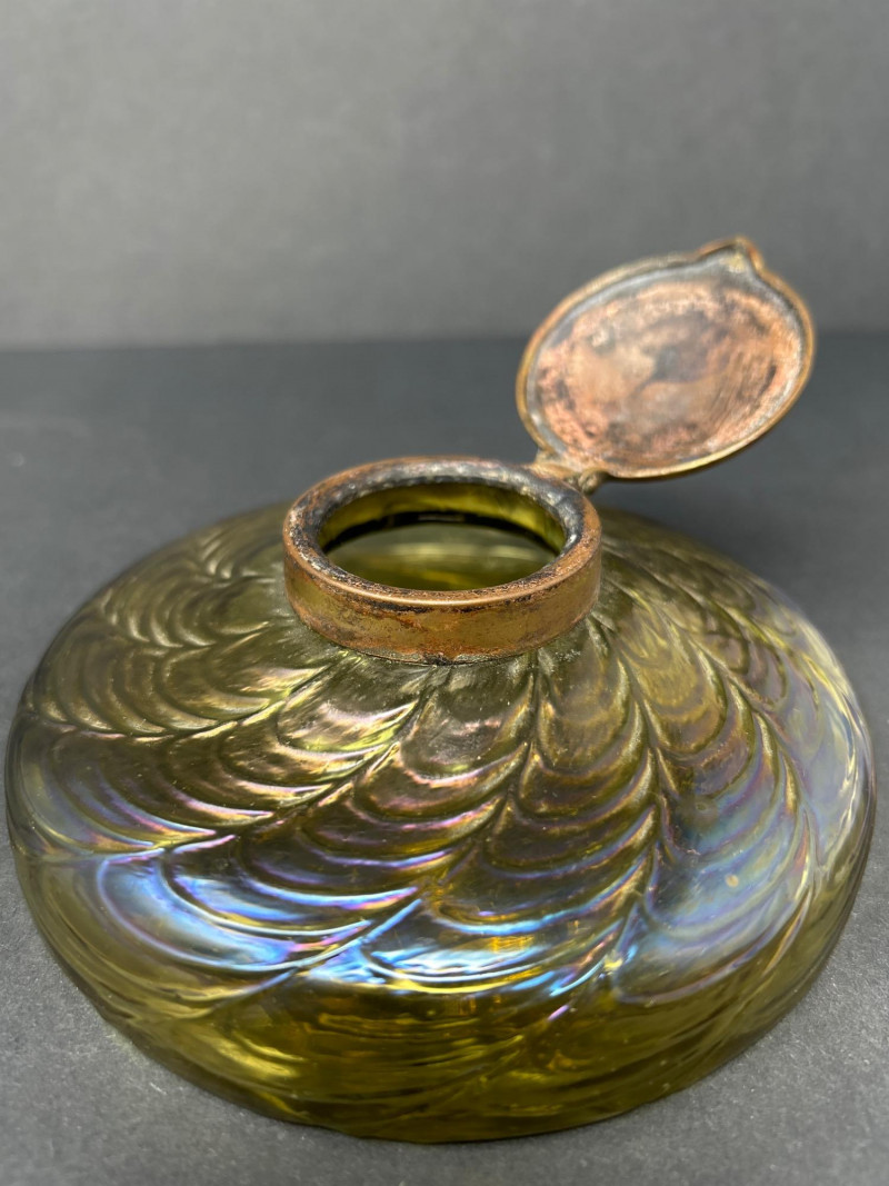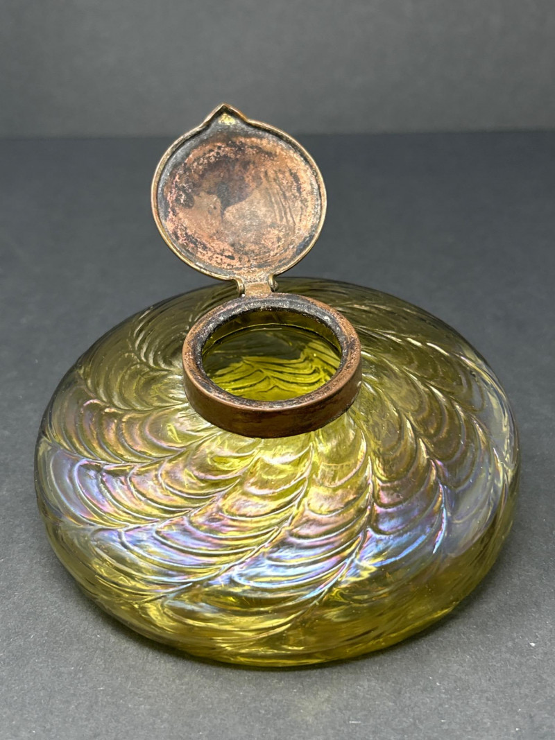 Lot # 89 - Art Nouveau Iridescent Glass Inkwell with Brass Lid