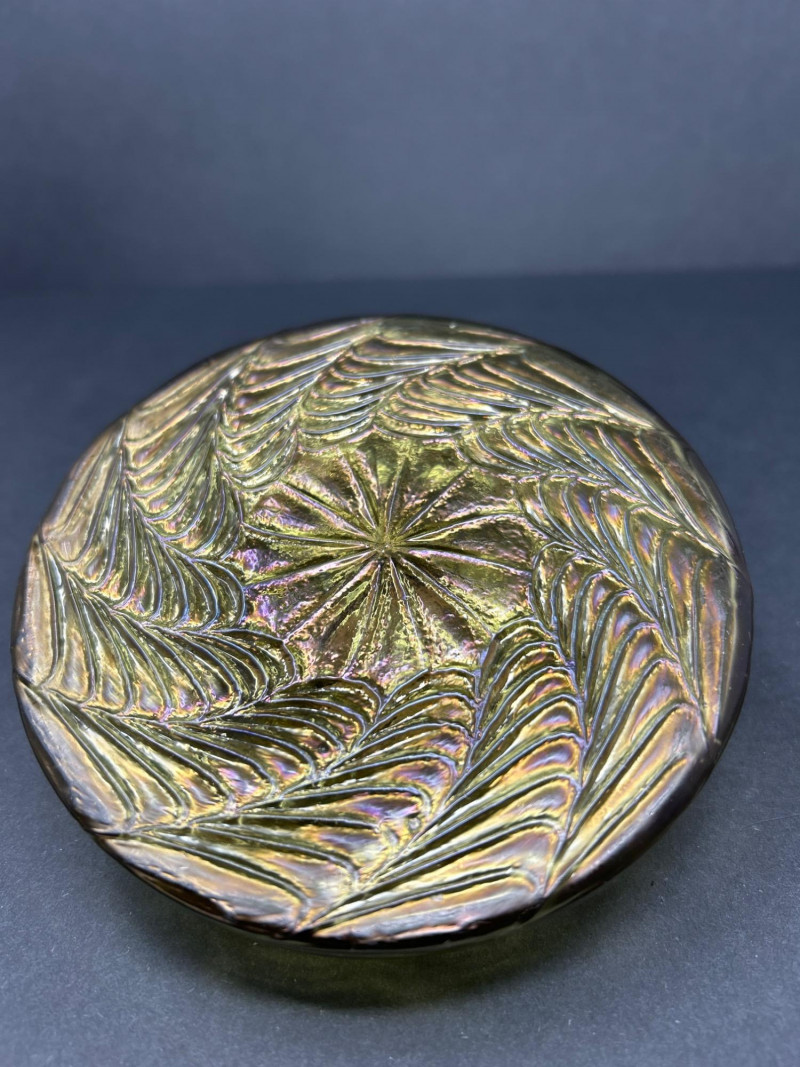 A luminous Art Nouveau inkwell featuring iridescent glass with a “threaded” surface effect, paired with a fitted brass lid. The glass shimmers in tones of green and violet, typical of Loetz or Kralik-style Bohemian craftsmanship from the early 20th century. The lid is hinged and likely original, adding a warm metallic contrast to the fluid glass form. Design Features: Style: Art Nouveau Material: Iridescent art glass with brass lid Surface: Threaded effect pattern Era: Circa 1900–1915 Styling Notes: