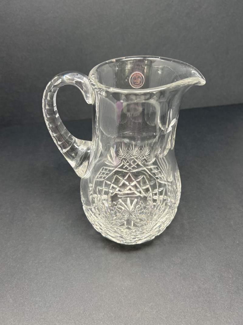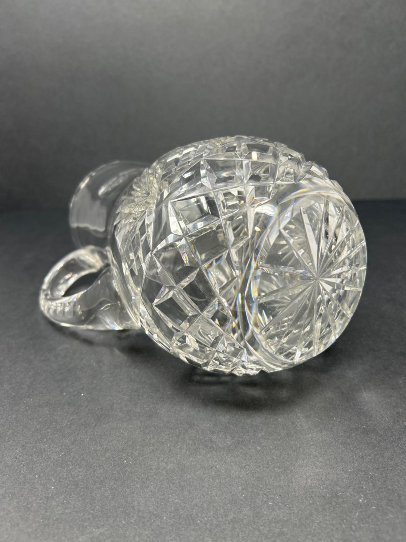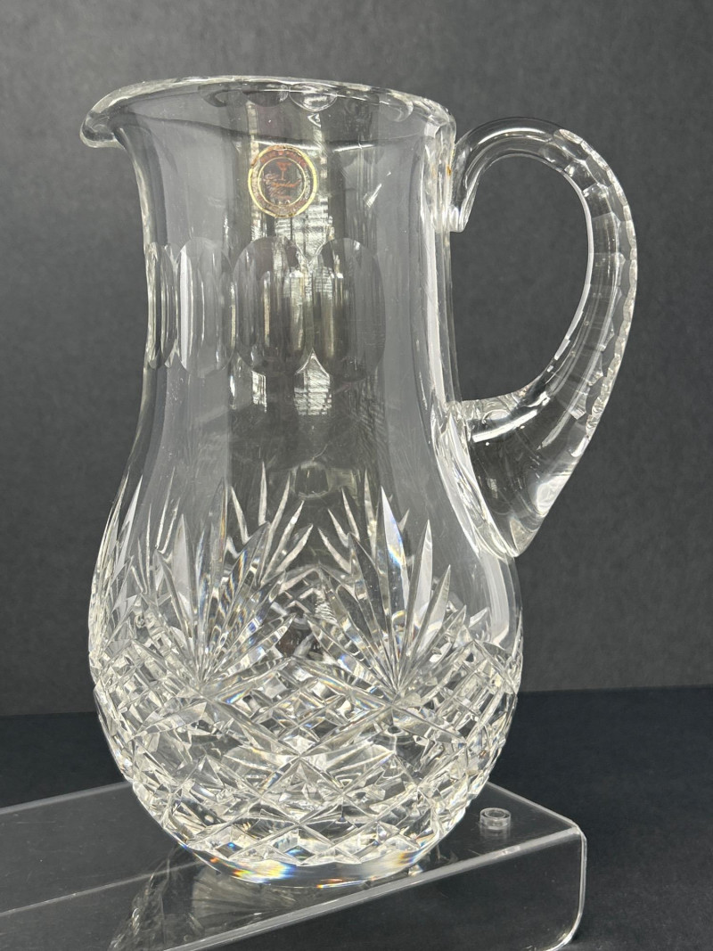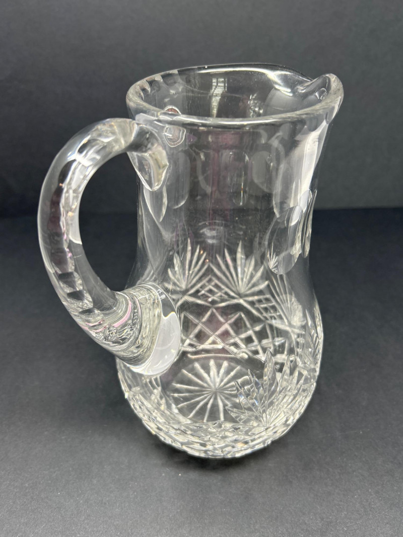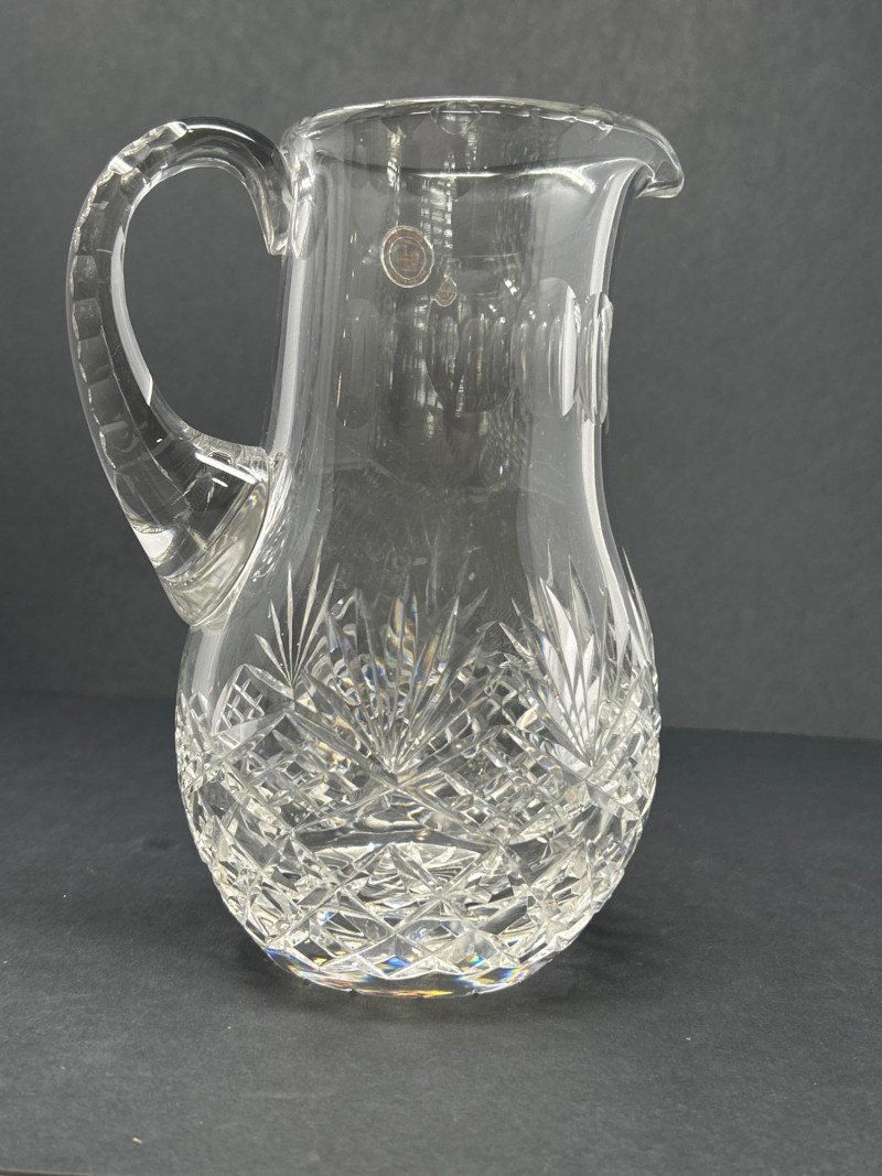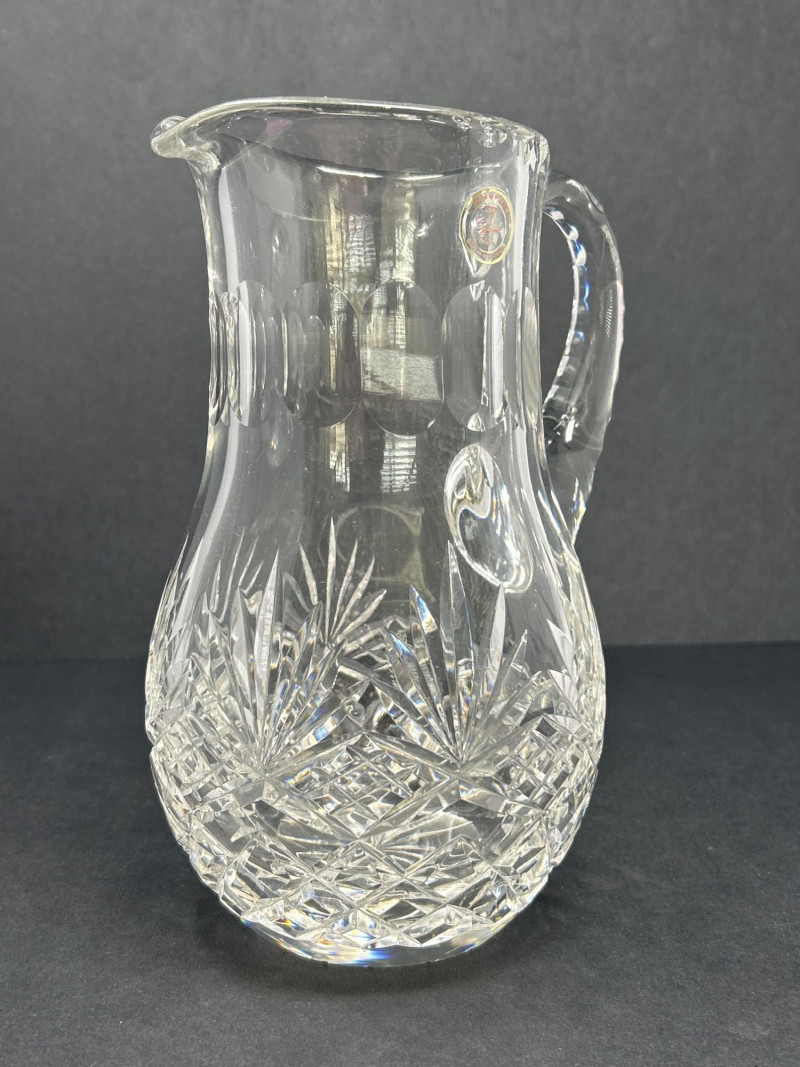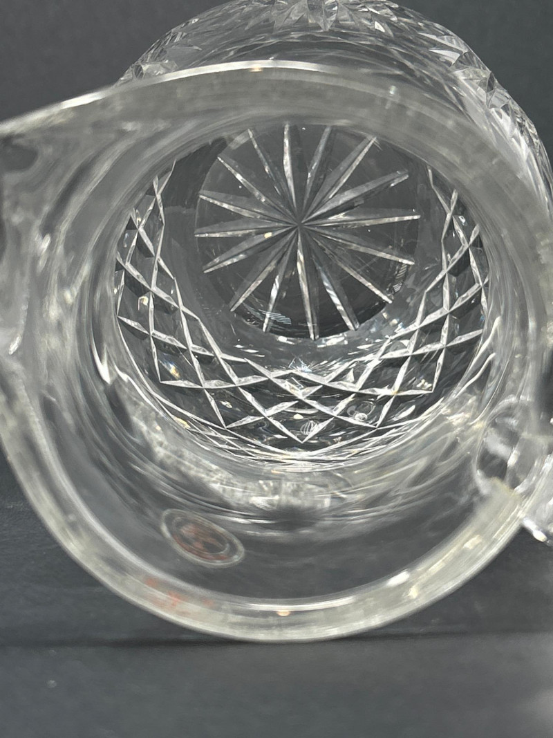 A brilliant Waterford crystal pitcher, standing 9 inches tall and showcasing the brand’s signature deep-cut patterns in clear leaded glass. The design features geometric crosshatching and radiant starbursts that catch and refract light beautifully. The handle is faceted for grip and elegance, and a small foil label near the rim confirms its authenticity. Design Features: Maker: Waterford Crystal Pattern: Likely “Lismore” or similar classic cut Material: Hand-cut leaded crystal Dimensions: 9" H Era: Late 20th century Condition: Excellent; no chips or cracks noted Styling Notes: