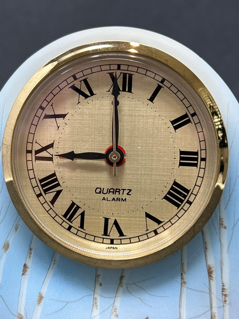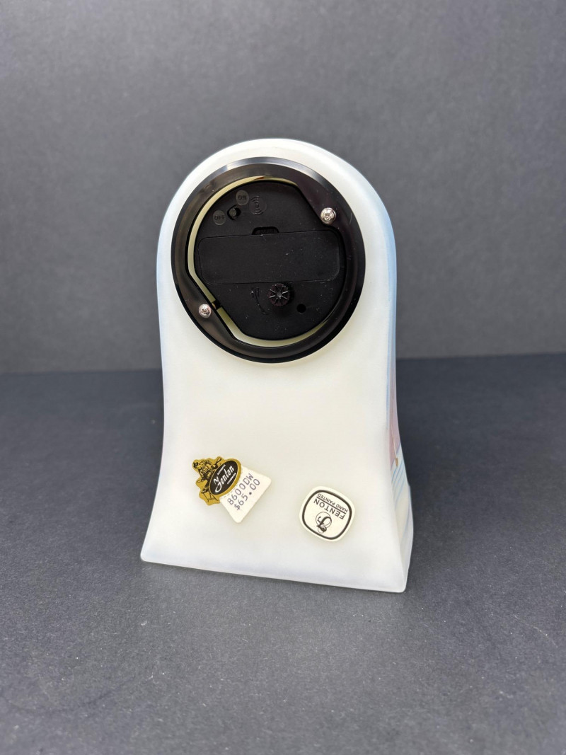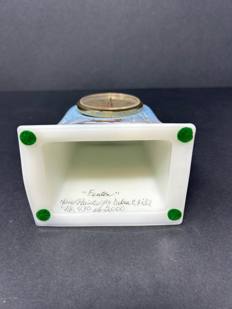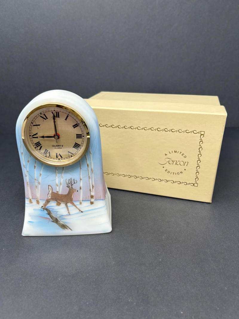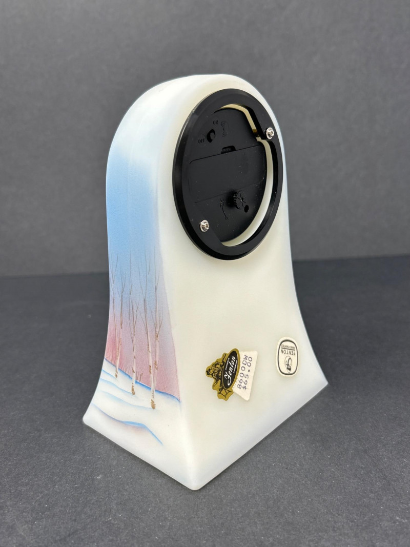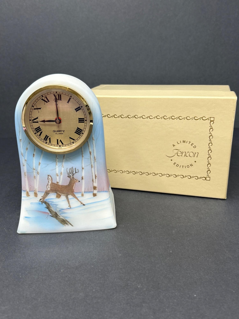 A beautiful Fenton hand-painted glass mantel clock featuring a winter deer scene, meticulously crafted and signed by artist Debra Hill. This limited edition piece is No. 389 of 2000 and showcases a serene snowy forest with a running deer, delicately painted on white opalescent glass. The clock is quartz-operated with a gold-tone rim, Roman numerals, and an alarm function. The back retains the original Fenton stickers and pricing label, and it comes in its original Fenton Limited Edition box.Features:Brand: FentonMaterial: Hand-painted opalescent glassDesign: Winter deer scene with birch trees Clock Type: Quartz alarm clock with Roman numerals Artist: Signed by Debra HillLimited Edition: No. 389 of 2000 Size: 6” tall x 3.5” wide Includes: Original box and labels Styling Notes: