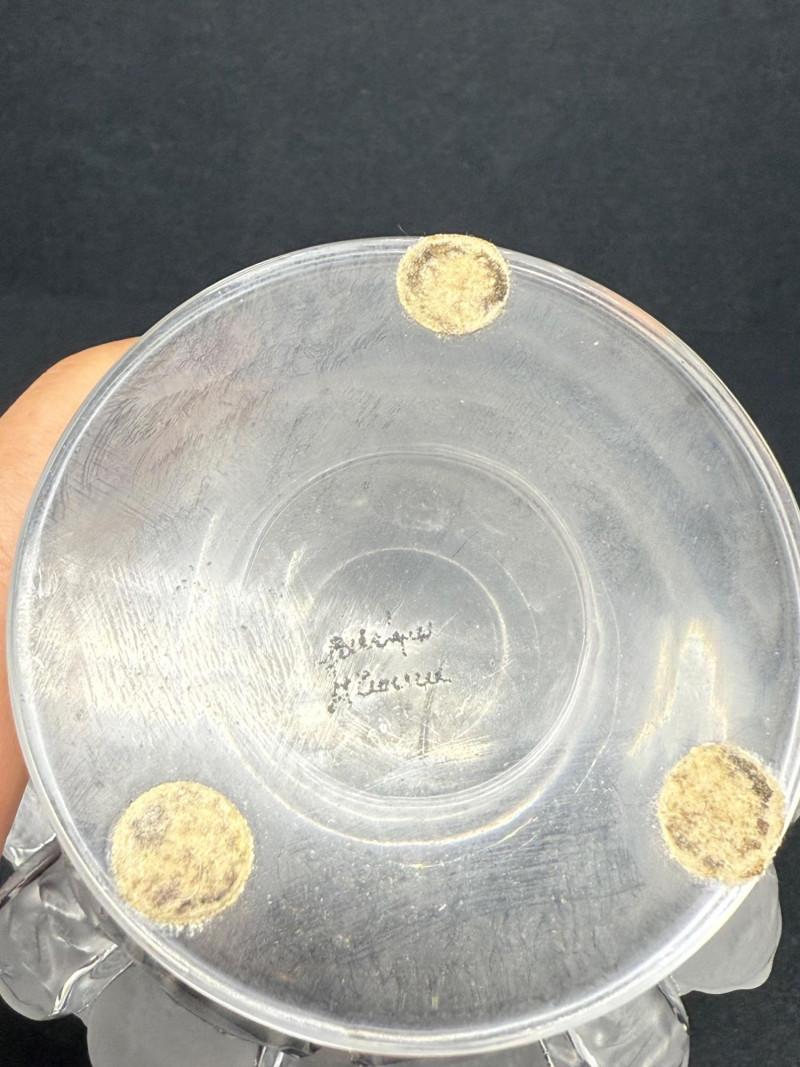 Where Wings Whisper: A Symphony in Glass Designed by Marc Lalique in 1948, the “Dampierre” vase is a masterclass in French crystal artistry. This signed piece features a ring of nine frosted birds in flight, sculpted in satin-finished relief around a clear crystal body. The birds—stylized sparrows—appear mid-song, encircling the vase like a gentle chorus of nature. Compact yet commanding, the vase stands on a short pedestal base and flares gently at the rim, creating a harmonious silhouette. The “LALIQUE FRANCE” signature etched on the rim confirms its authenticity and pedigree.