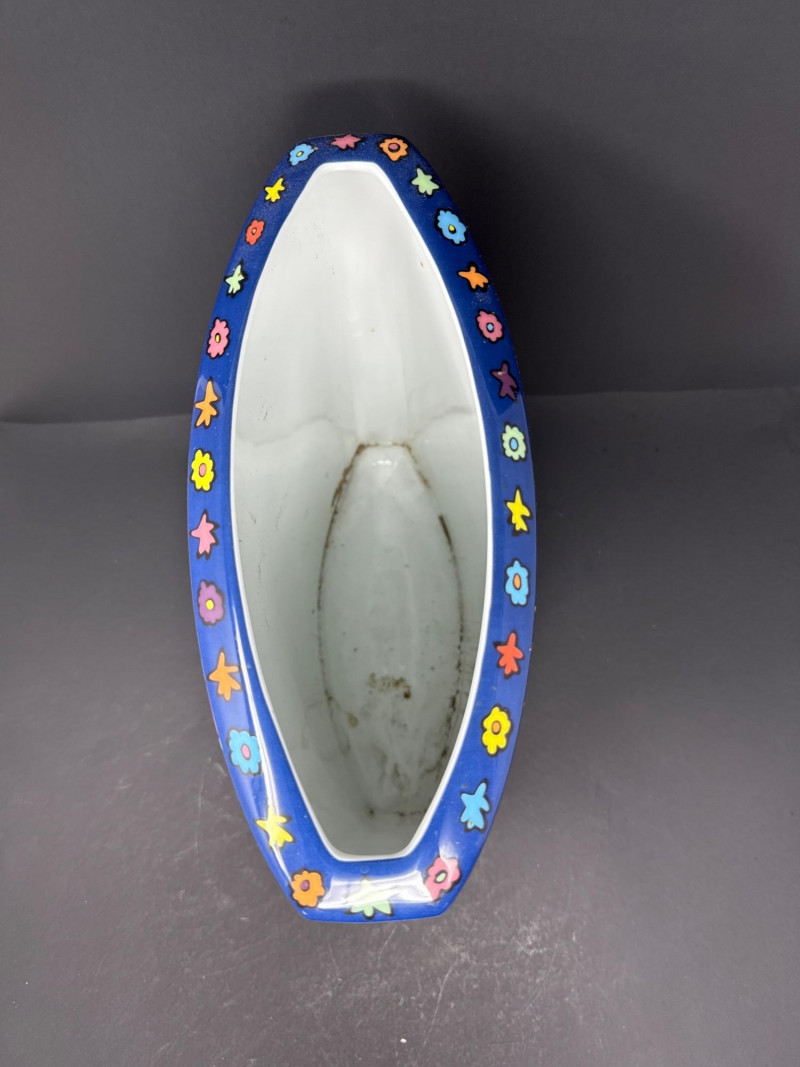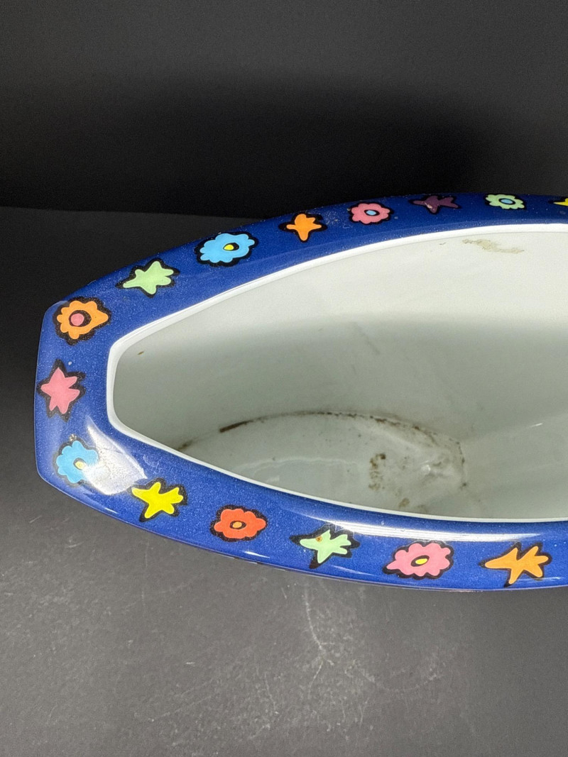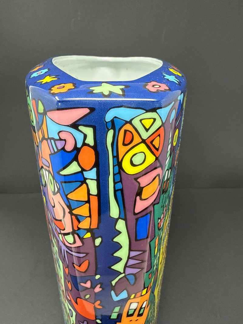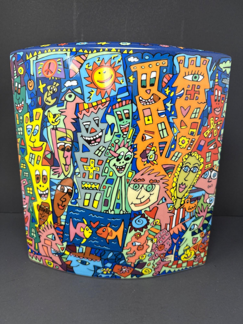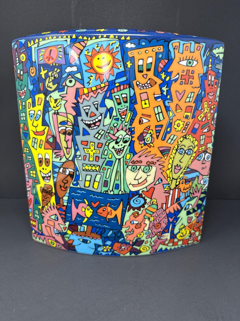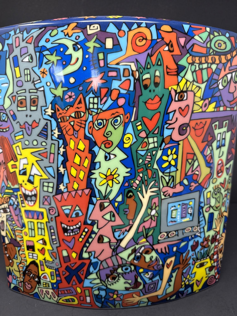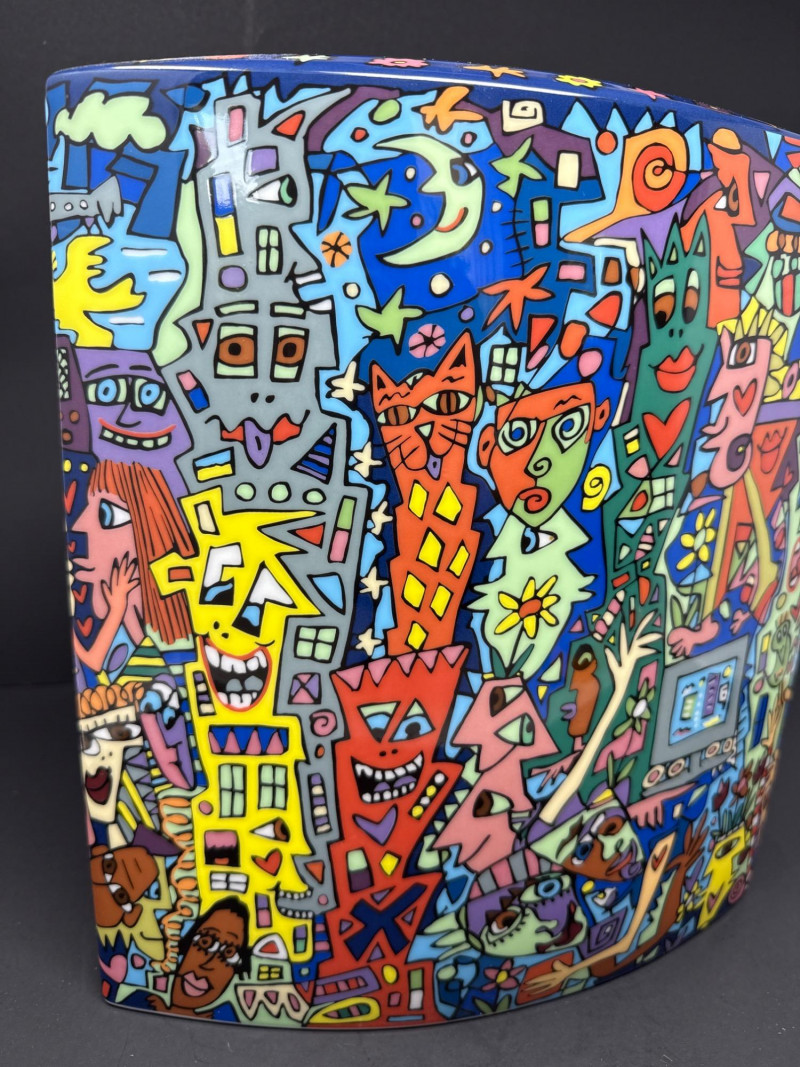 This is no wallflower vase; it’s James Rizzi meets porcelain extravaganza. Channeling his trademark cartoon‑meets‑street‑energy style, Rizzi covers the oval‑rectangular form with happy, eyes‑wide‑open faces, sunbursts, and abstract city‑heartbeats in bright primary hues. It’s the sort of design that might make you break out into spontaneous jazz hands. The pieces feel alive, with each smiling figure seeming ready to pop into your living room and start a conga line.