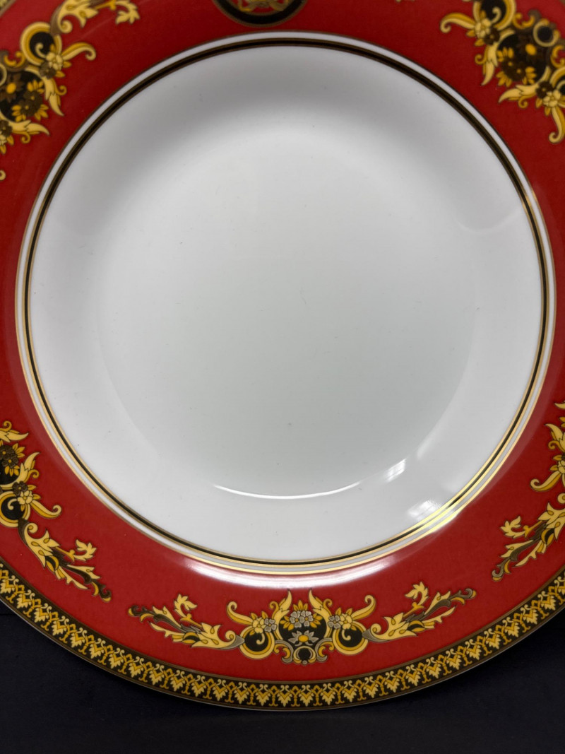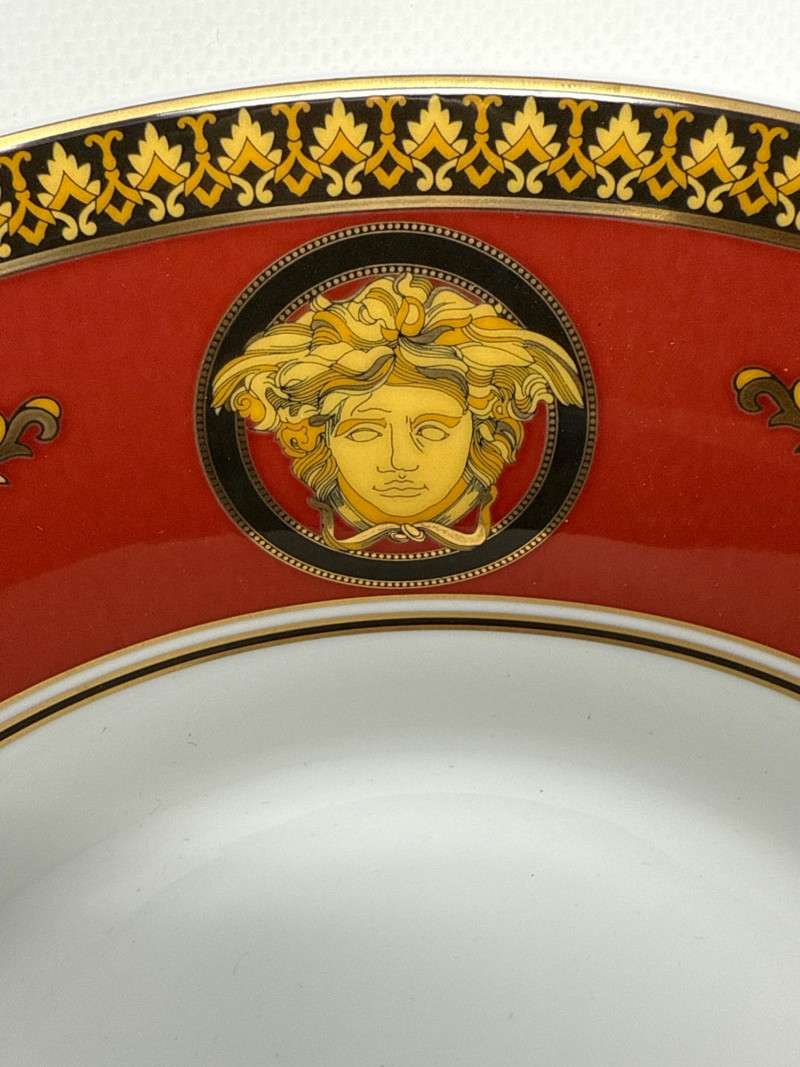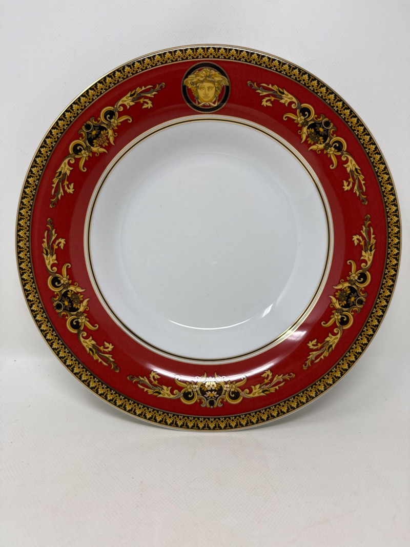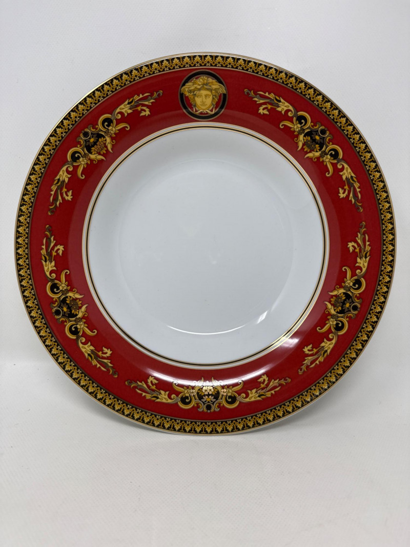 Striking Versace “Medusa Red” porcelain bowl, crafted in collaboration with Rosenthal. This 12" service bowl showcases the iconic Medusa head motif in vivid red and gold detailing, emblematic of Versace’s opulent design language. Design Features Produced by Rosenthal under the “Meets Versace” collection Bold red background with intricate gold accents and central Medusa emblem Made in Germany; fine porcelain construction Diameter: 12 inches Condition