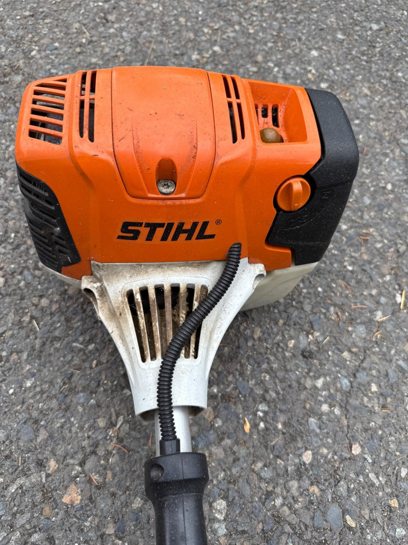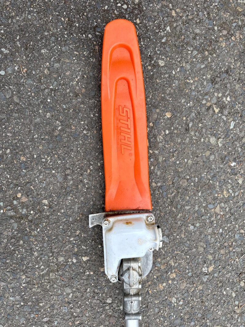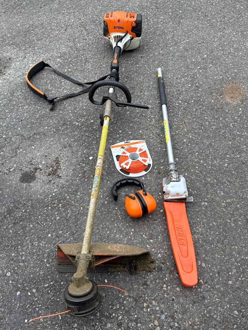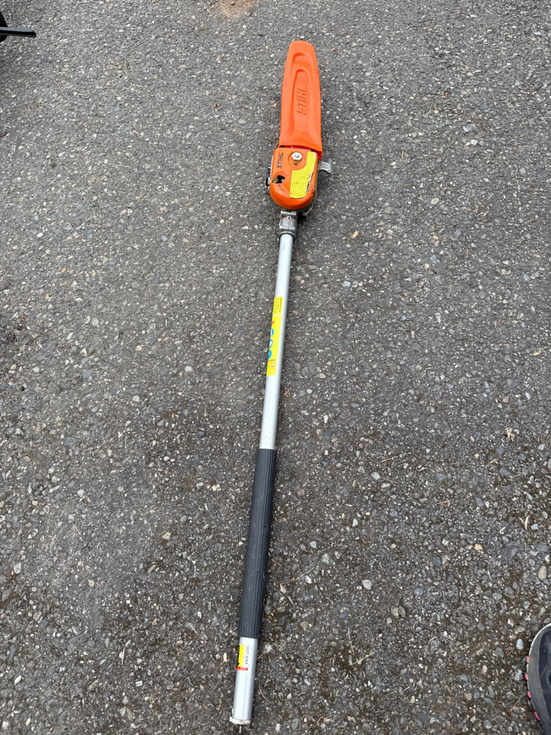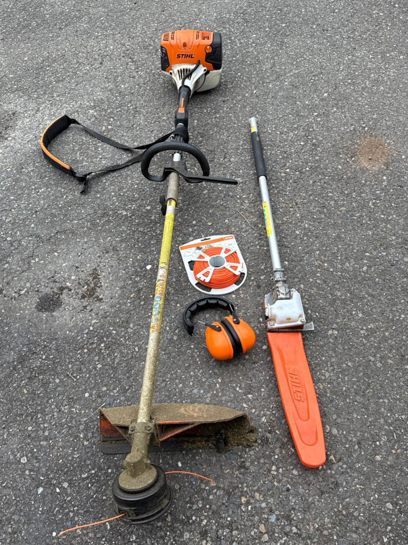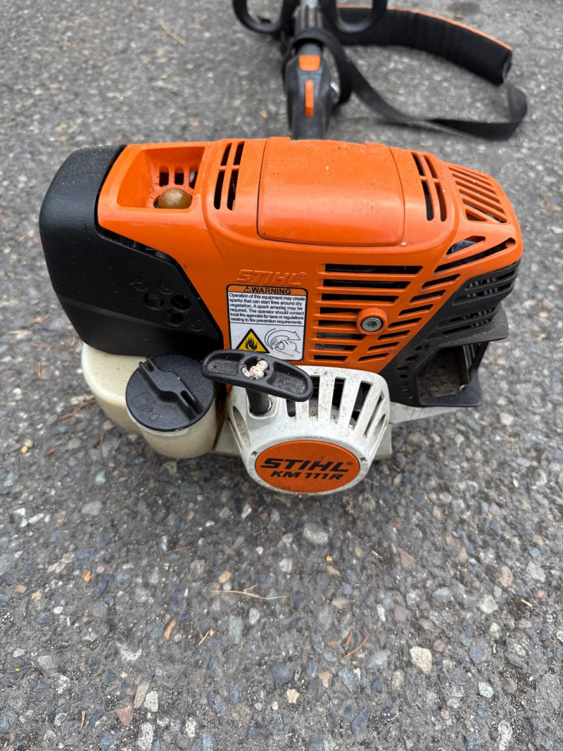 Stihl Gas Powered Trimmer Model KM111R Hedge Trimmer Attachment Hearing Protection Gear New Pack of Trimmer Cable Extra extension pole added Powers up very easily, indicating good working condition. Comes with essential accessories for safe and effective use. Several chains, grinder tools, repair kit, chaps, eye protection and more have been added. Included Items: