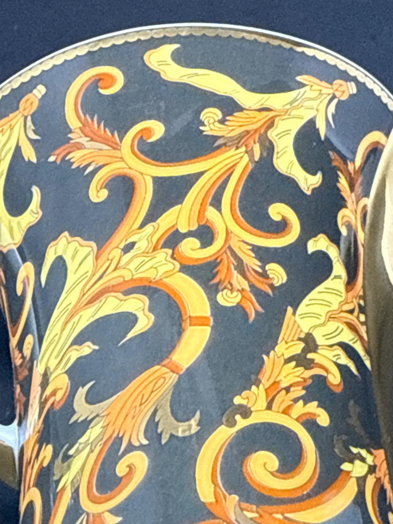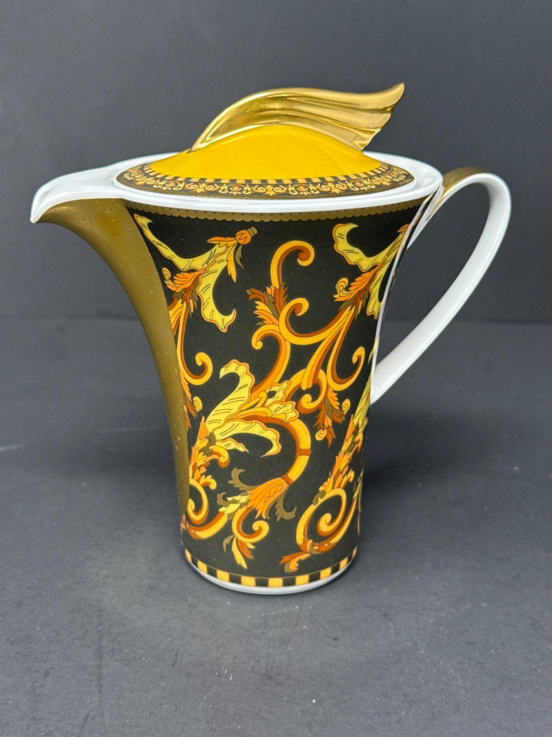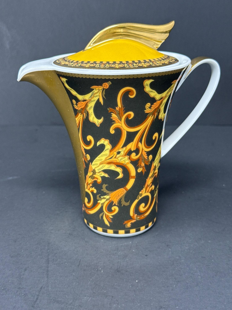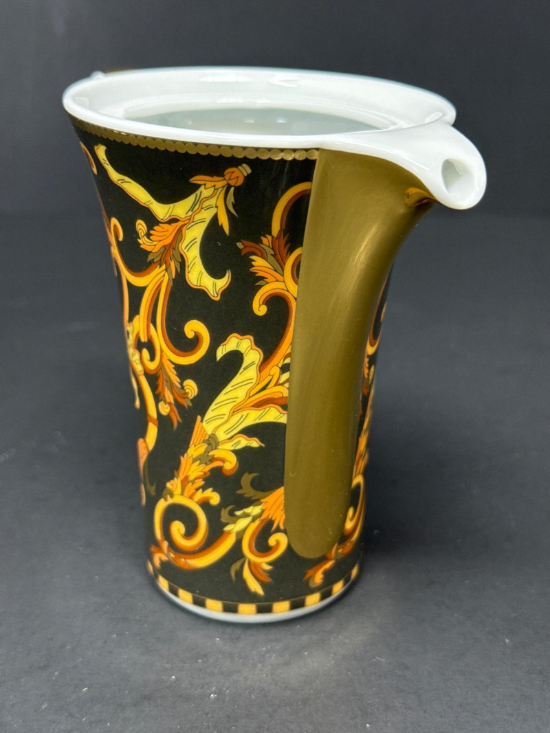 Rosenthal: A prestigious German porcelain manufacturer known for its high-quality craftsmanship and collaborations with luxury brands. Versace Barroco Collection: This piece is part of the iconic Barroco line, which features ornate, classical motifs synonymous with the Versace aesthetic. Length: 5 inches Width: 3 inches Height: 5.5 inches Excellent or near-mint conditionVersace Barroco Creamer with Lid by Rosenthal