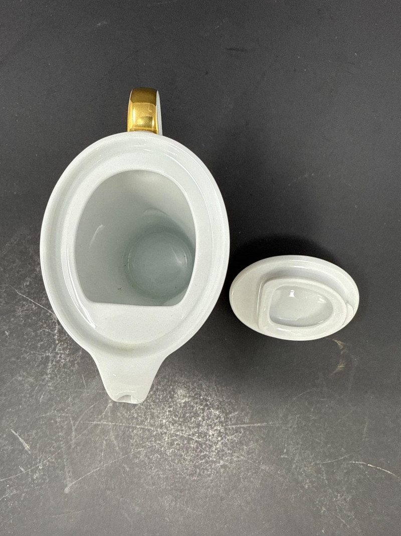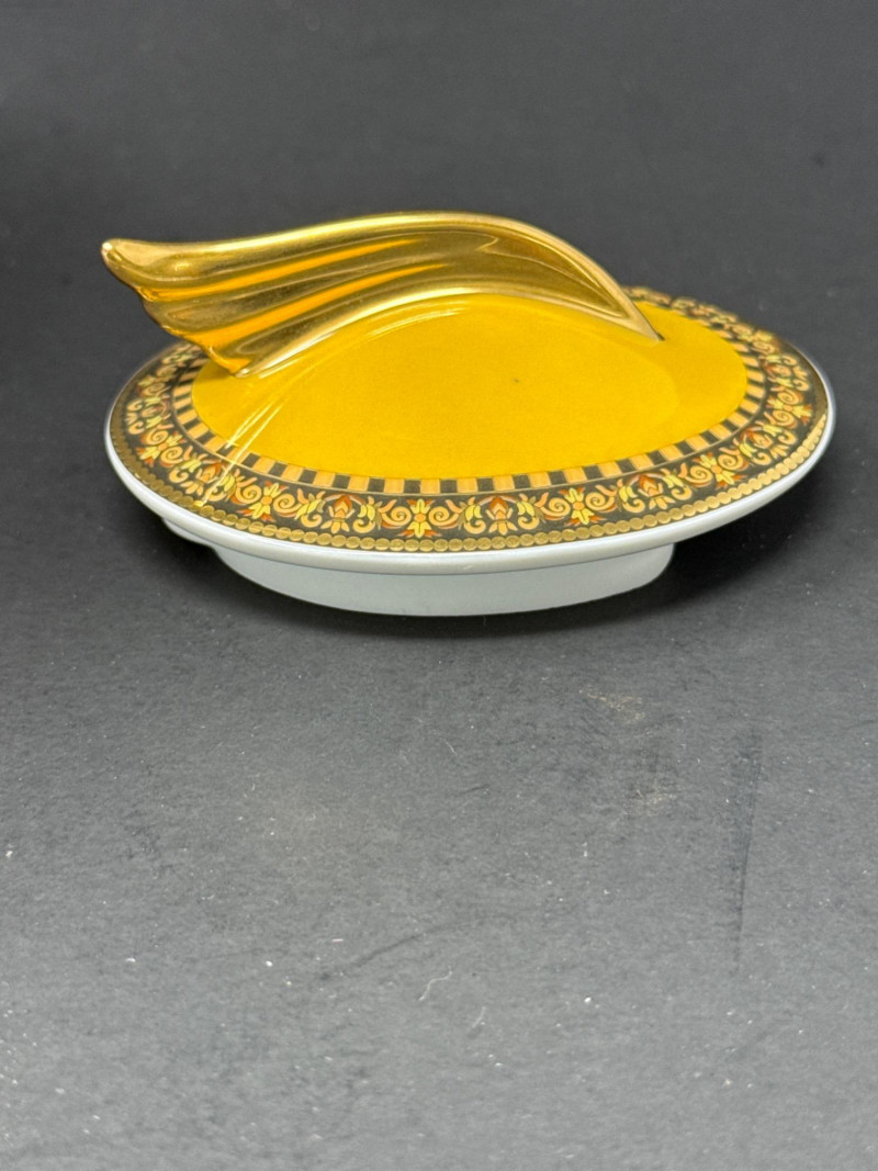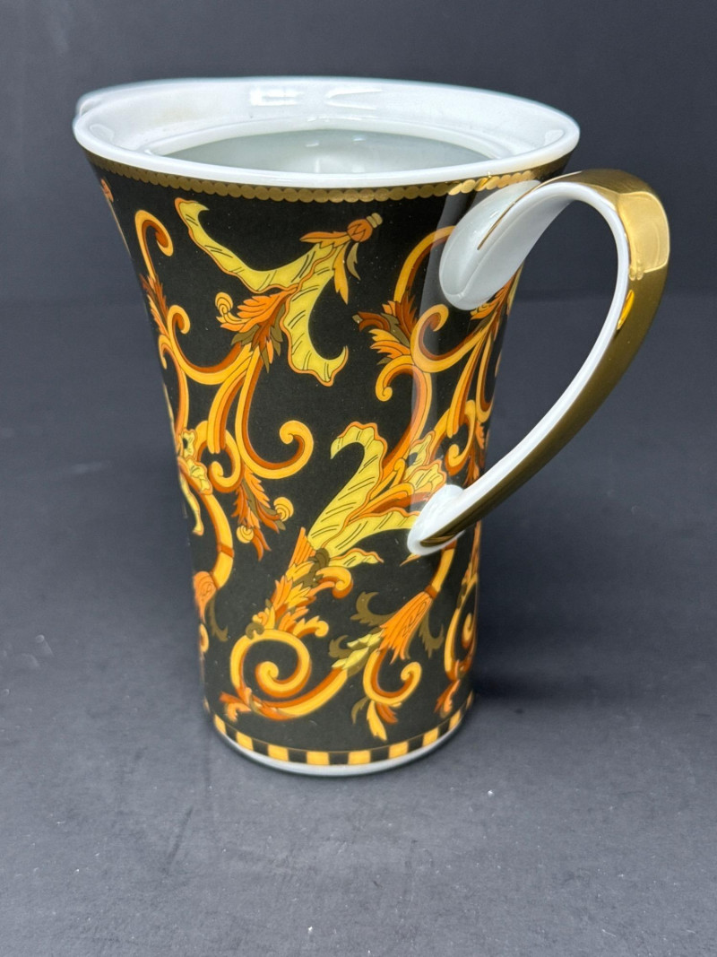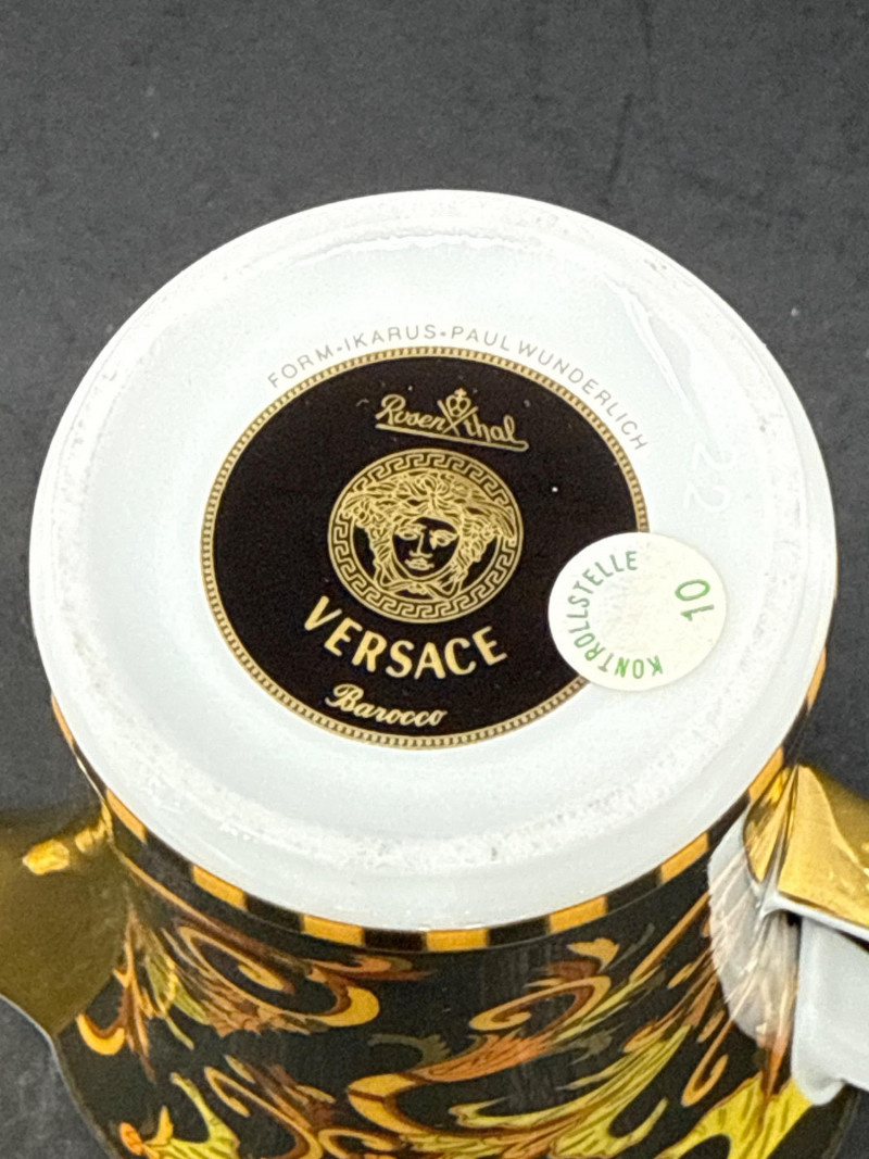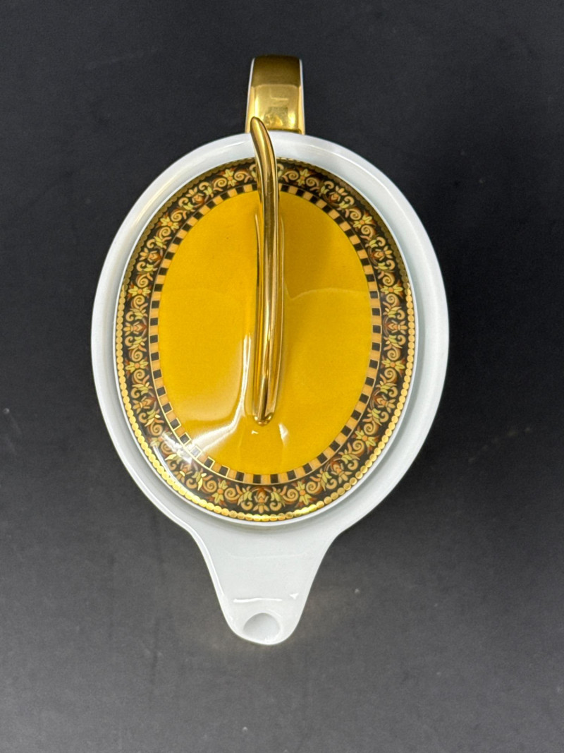 Rosenthal: A prestigious German porcelain manufacturer known for its high-quality craftsmanship and collaborations with luxury brands. Versace Barroco Collection: This piece is part of the iconic Barroco line, which features ornate, classical motifs synonymous with the Versace aesthetic. Length: 5 inches Width: 3 inches Height: 5.5 inches Excellent or near-mint conditionVersace Barroco Creamer with Lid by Rosenthal
