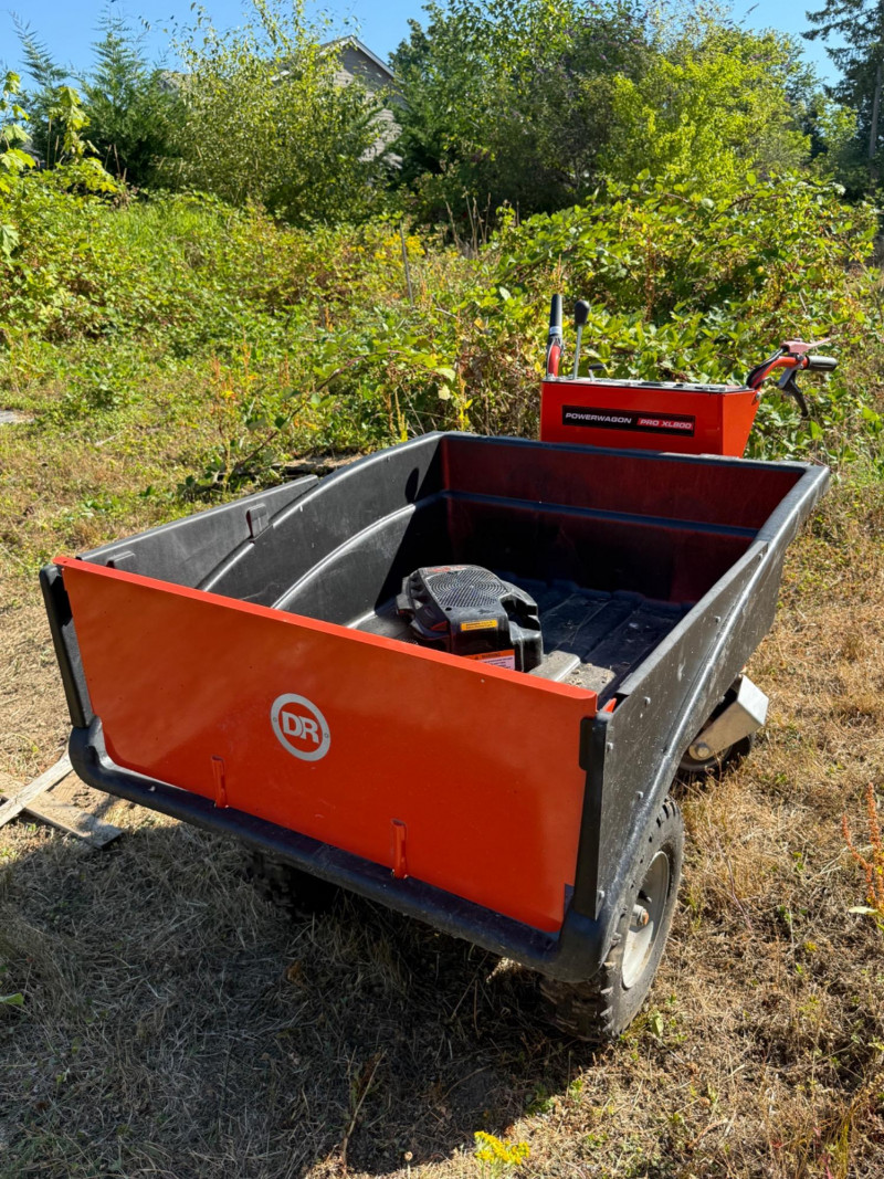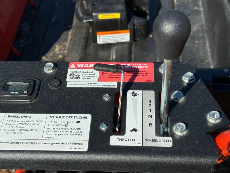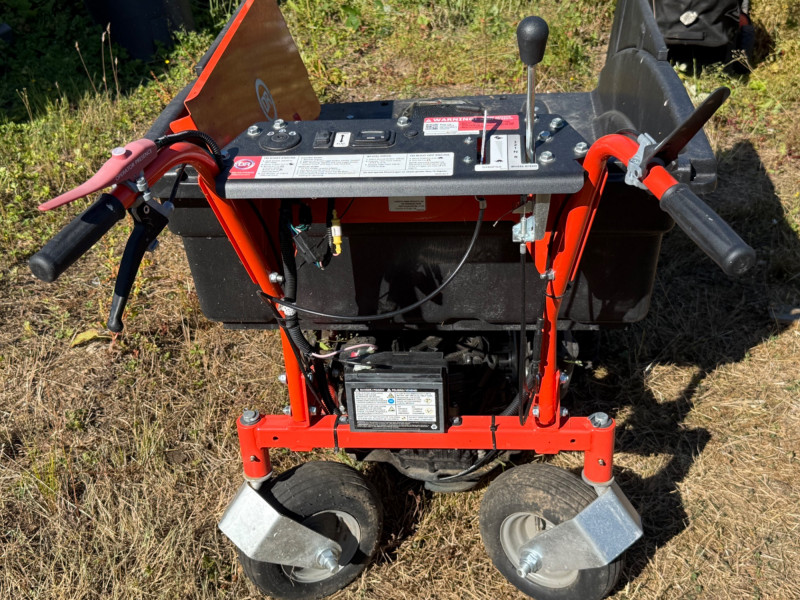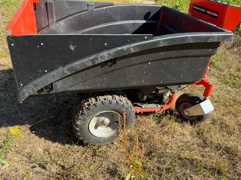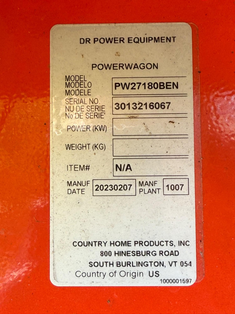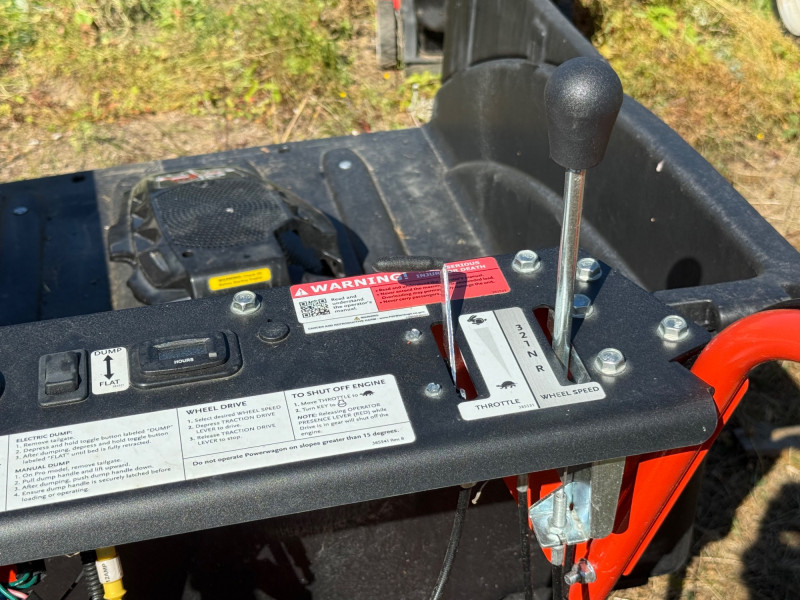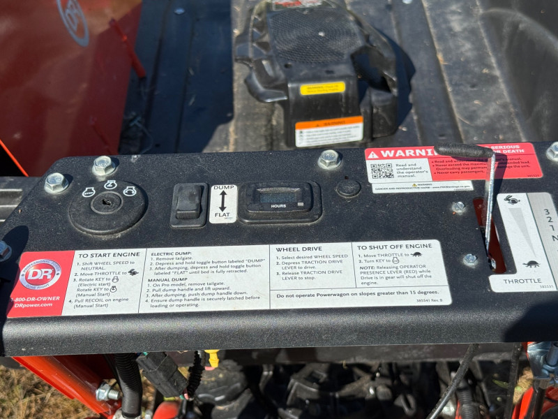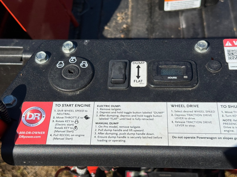 The DR Motorized Utility Cart EXi875 – Model PW27180BEN is a heavy-duty, self-propelled cart designed for hauling and dumping up to 800lb of materials. Powered by a 190cc Briggs & Stratton 875 Series engine, it features electric start, three forward speeds, one reverse, and ReadyStart® technology for easy operation. A push-button powered actuator lifts the bed to a 60° angle for quick, hands-free unloading. Its polyethylene cargo bed holds 8 cubic feet and can convert to a flatbed in minutes for hauling bulky items. Built with a rugged steel frame and pneumatic tires, it offers tight maneuverability with rear caster wheels that rotate 360°, making it ideal for tight spaces and rough terrain. A hand-activated disc brake ensures safe control during loading and on sloped terrain Reliable and versatile, this cart is suited for landscaping, property maintenance, and light construction, combining power, convenience, and durability in one compact machine. *Note: Does work, currently missing key. Moves well when not on. Tires may need some air. Limited use: .9 hours