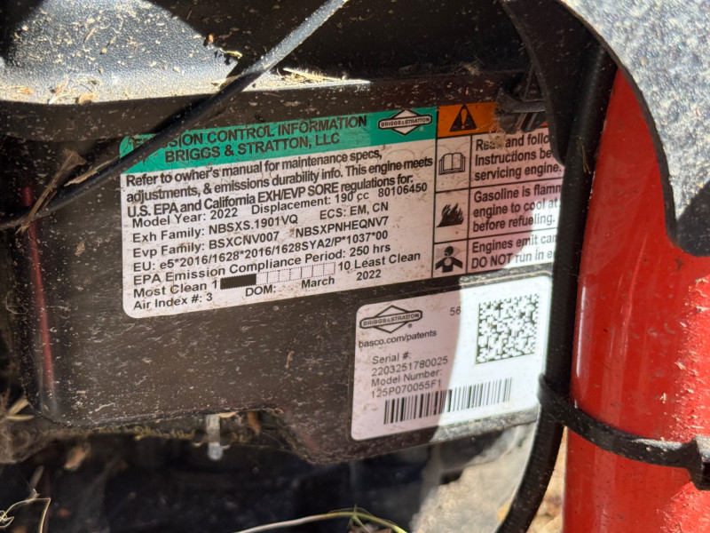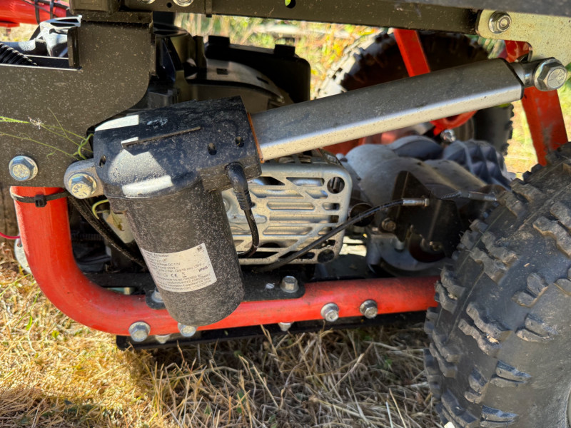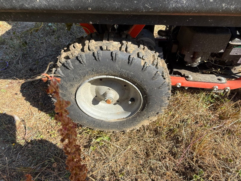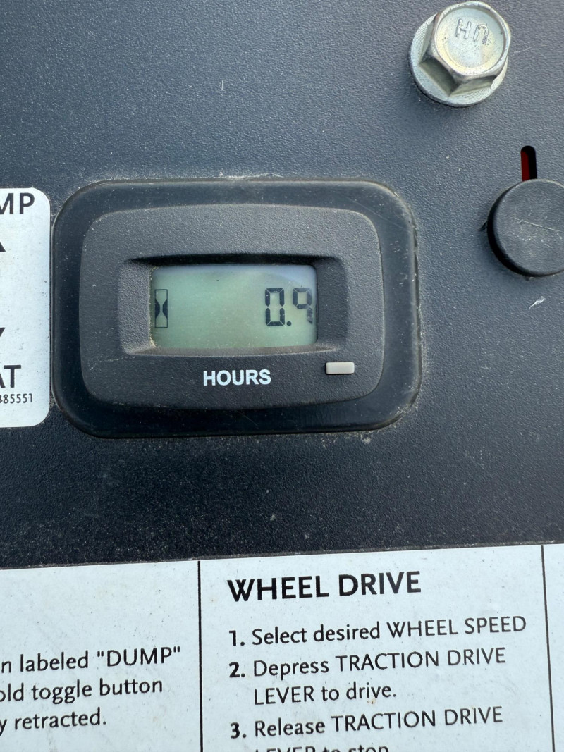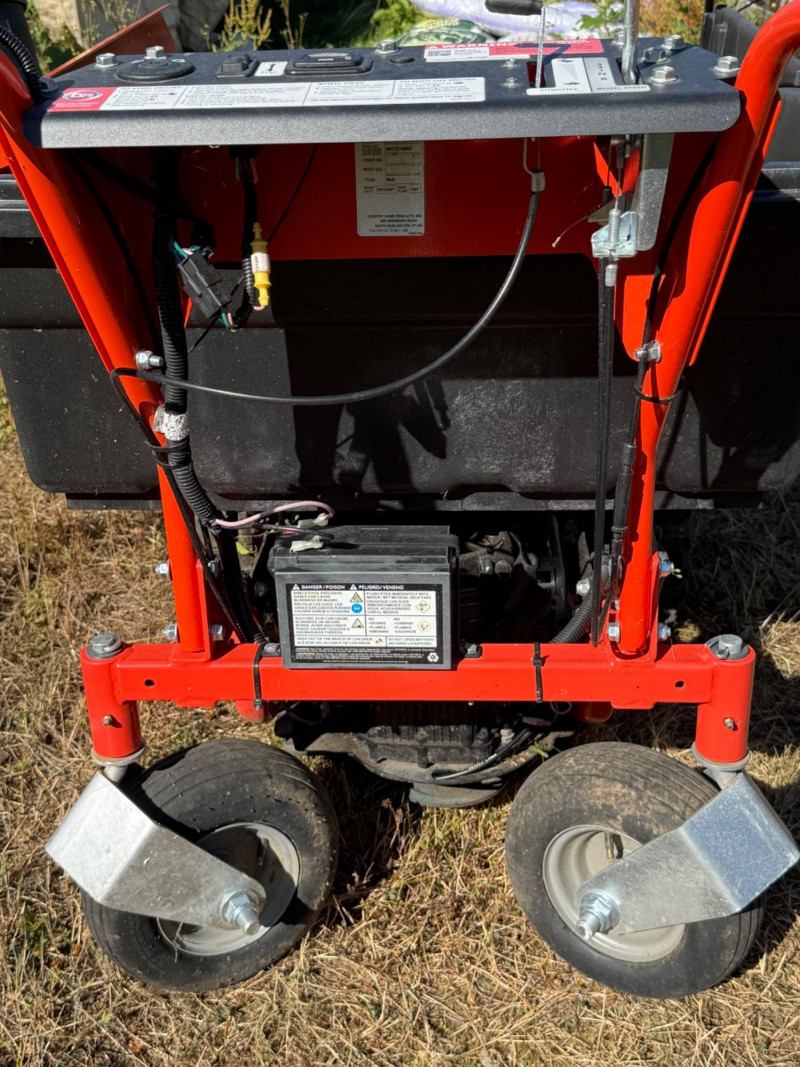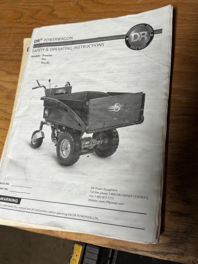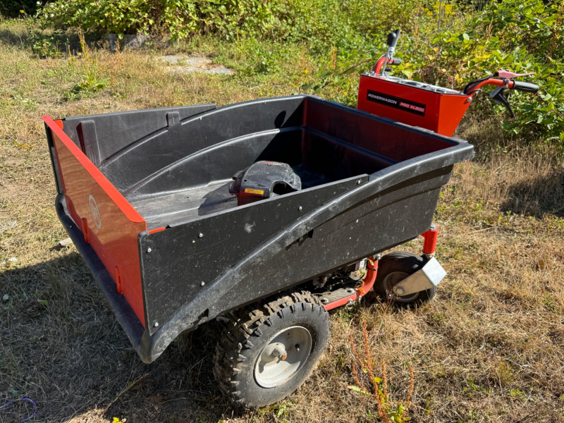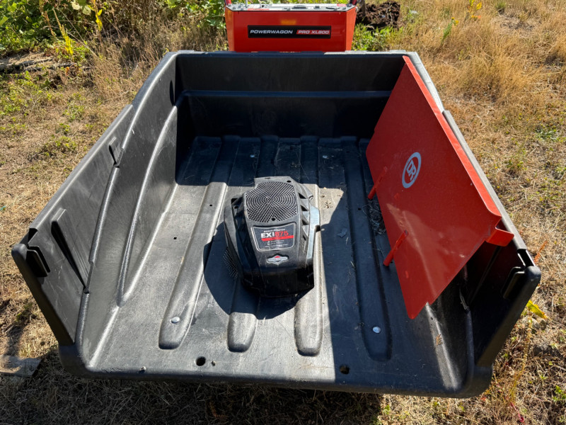 The DR Motorized Utility Cart EXi875 – Model PW27180BEN is a heavy-duty, self-propelled cart designed for hauling and dumping up to 800lb of materials. Powered by a 190cc Briggs & Stratton 875 Series engine, it features electric start, three forward speeds, one reverse, and ReadyStart® technology for easy operation. A push-button powered actuator lifts the bed to a 60° angle for quick, hands-free unloading. Its polyethylene cargo bed holds 8 cubic feet and can convert to a flatbed in minutes for hauling bulky items. Built with a rugged steel frame and pneumatic tires, it offers tight maneuverability with rear caster wheels that rotate 360°, making it ideal for tight spaces and rough terrain. A hand-activated disc brake ensures safe control during loading and on sloped terrain Reliable and versatile, this cart is suited for landscaping, property maintenance, and light construction, combining power, convenience, and durability in one compact machine. *Note: Does work, currently missing key. Moves well when not on. Tires may need some air. Limited use: .9 hours