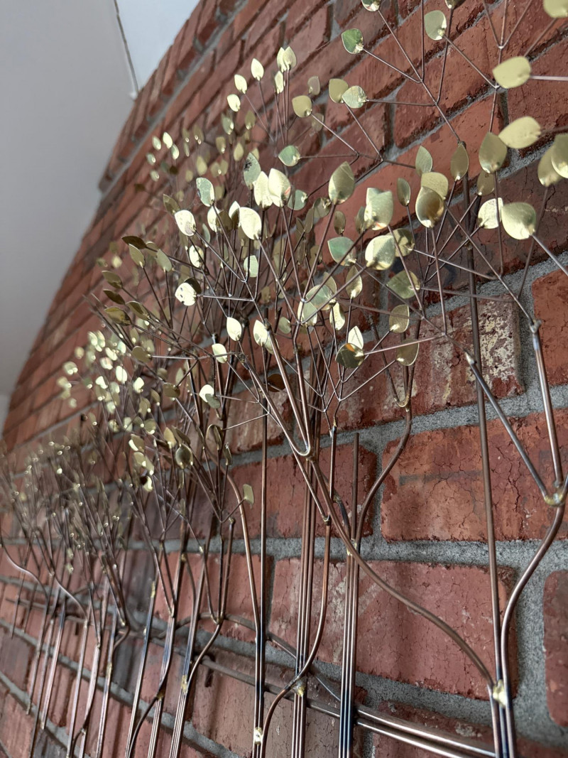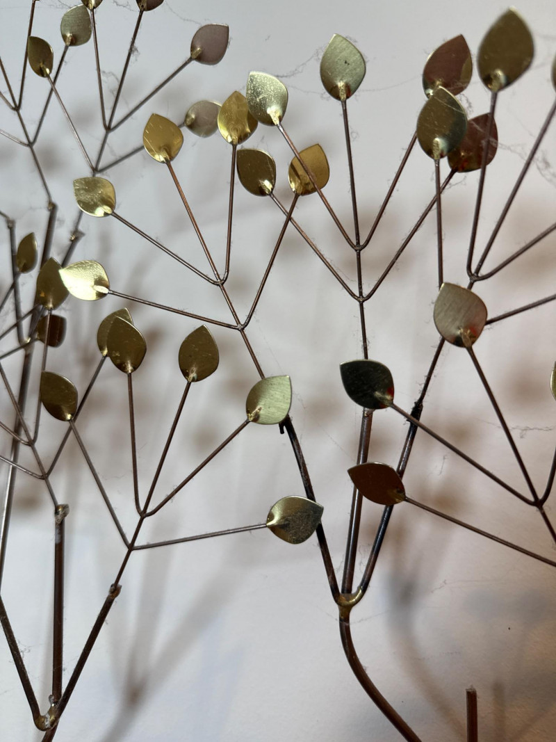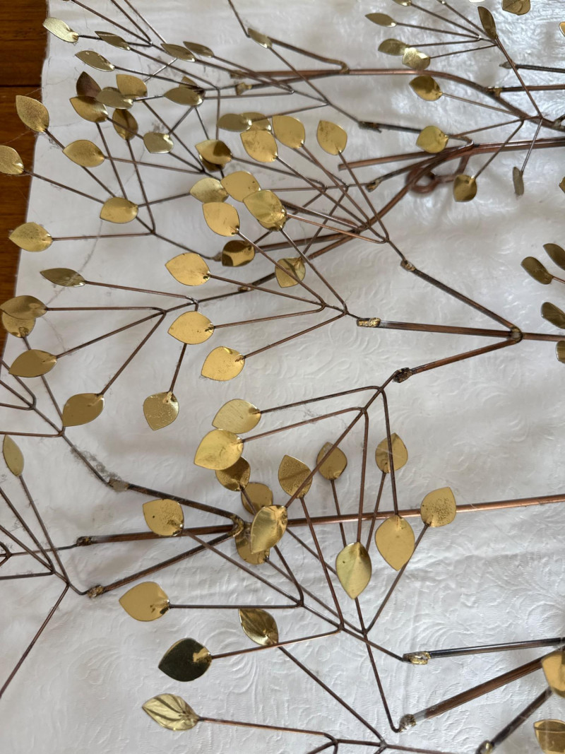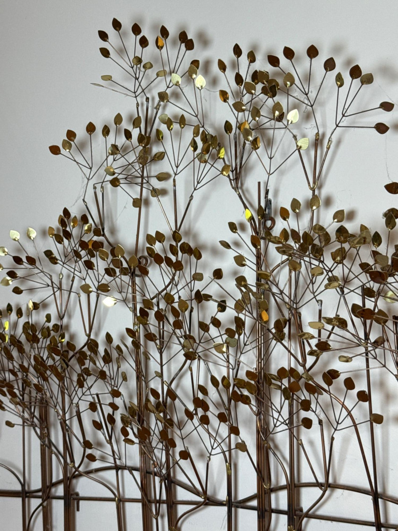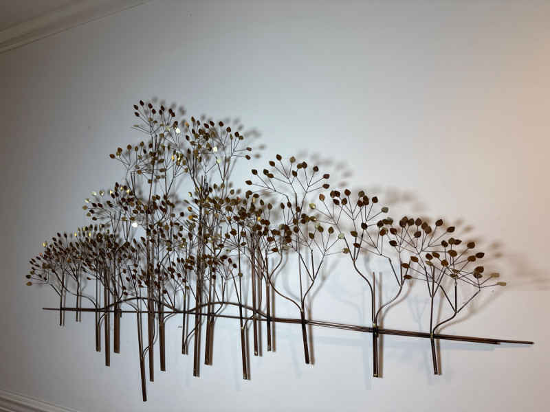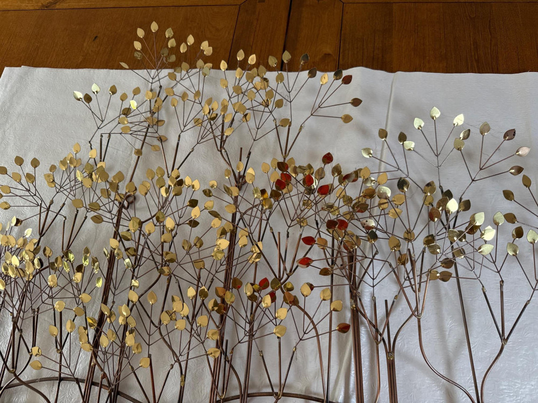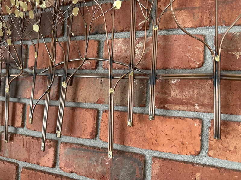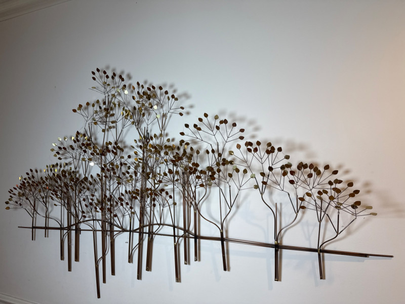 Striking mid-century modern wall sculpture by Curtis Jere, titled “The Elms.” This handcrafted piece features a stylized brass rendering of elm trees with sweeping, abstract branches, embodying the organic elegance and industrial artistry of the MCM era. Design Features Signed Curtis Jere; circa 1970s Constructed in solid brass with natural patina and warm golden tones Abstract tree motif with layered branches and textured surfaces Dimensions: 60" Length x 36" Height approximately Designed to hang horizontally; includes integrated loop hangers Condition