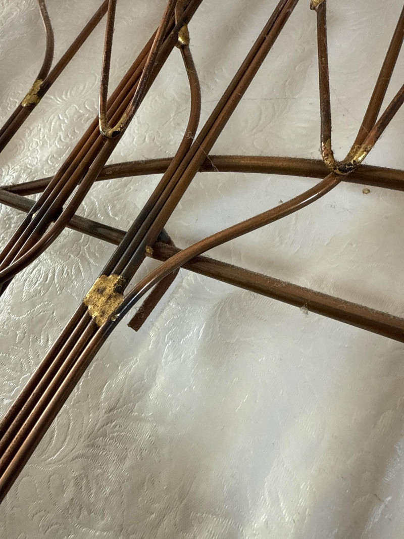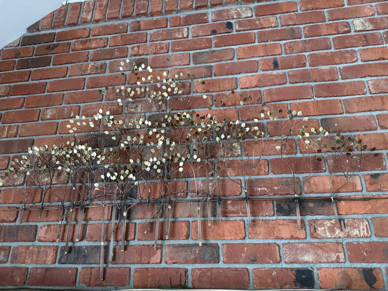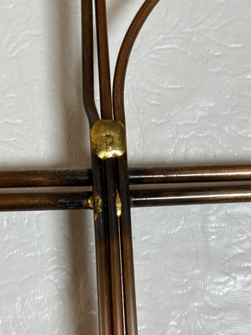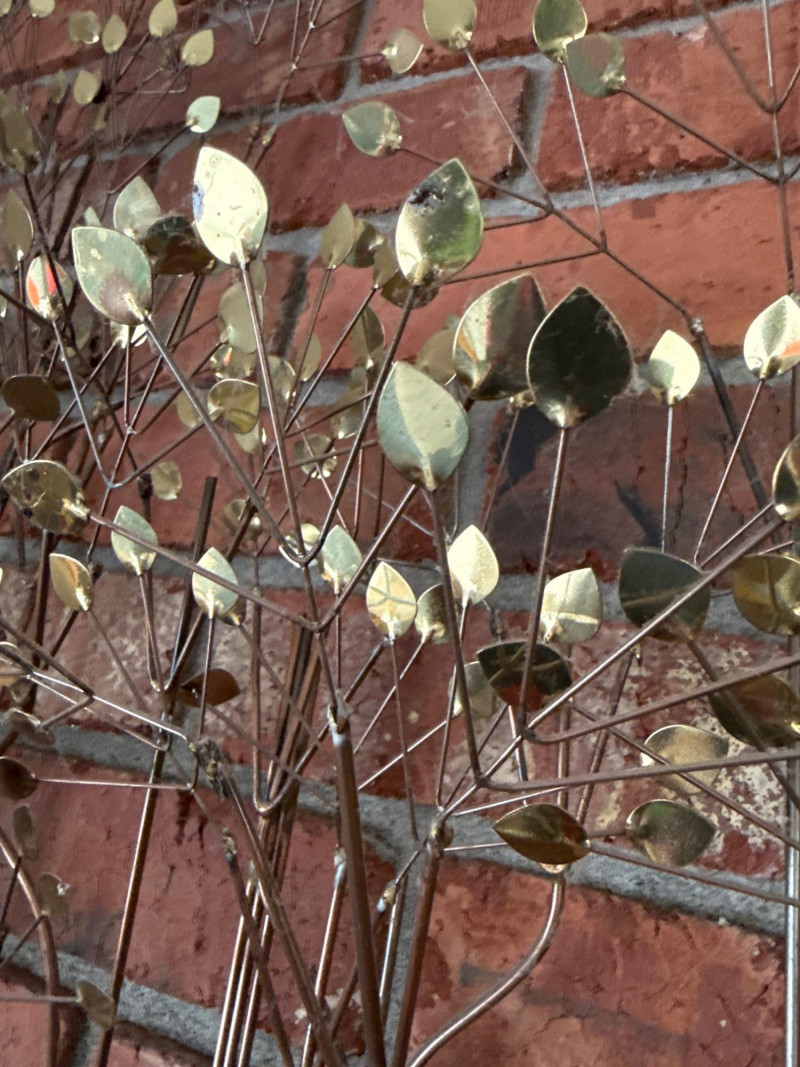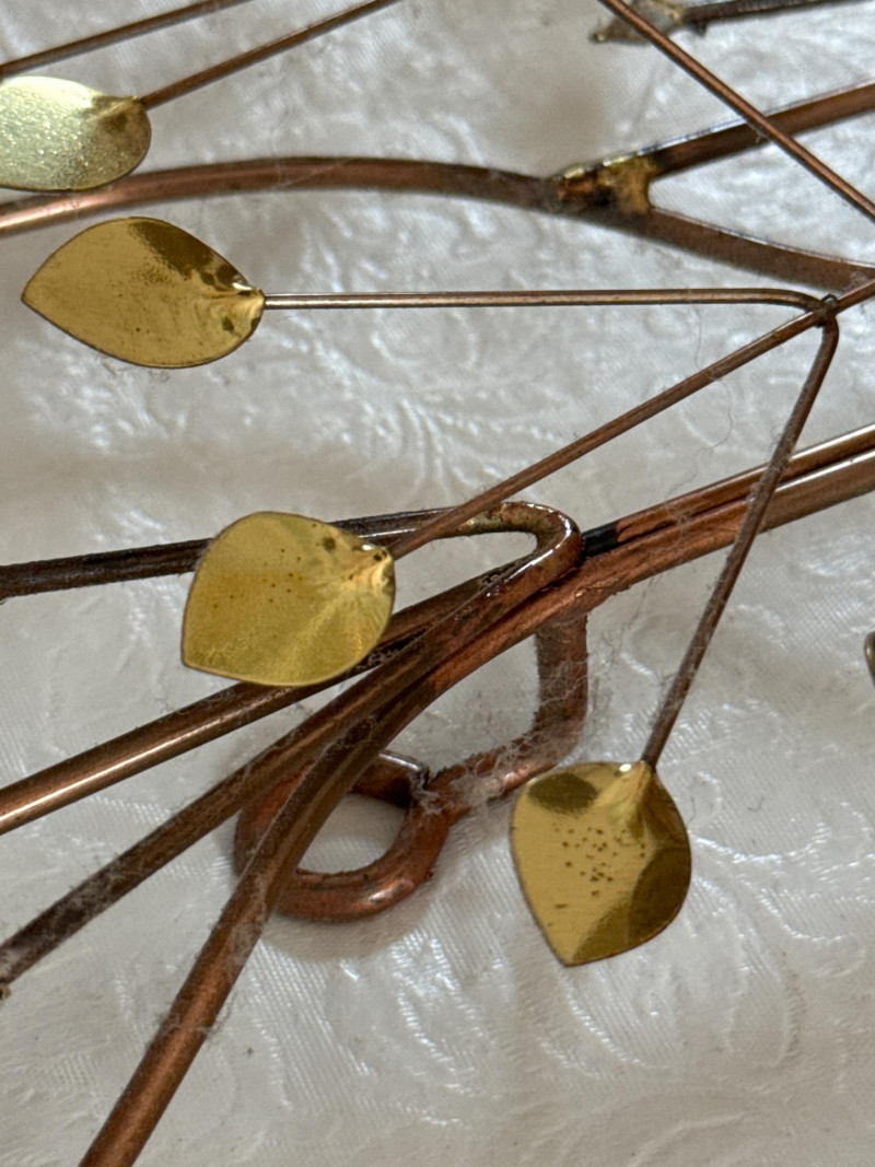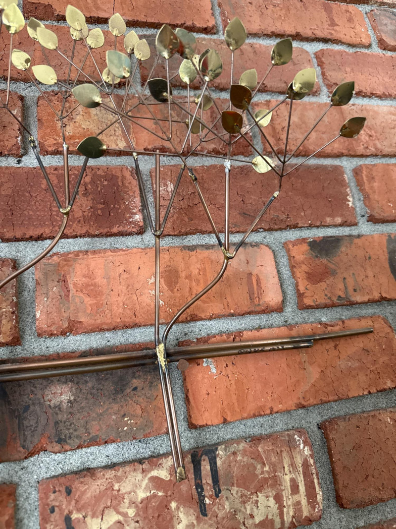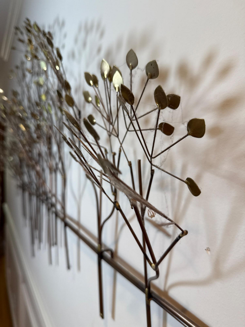 Striking mid-century modern wall sculpture by Curtis Jere, titled “The Elms.” This handcrafted piece features a stylized brass rendering of elm trees with sweeping, abstract branches, embodying the organic elegance and industrial artistry of the MCM era. Design Features Signed Curtis Jere; circa 1970s Constructed in solid brass with natural patina and warm golden tones Abstract tree motif with layered branches and textured surfaces Dimensions: 60" Length x 36" Height approximately Designed to hang horizontally; includes integrated loop hangers Condition