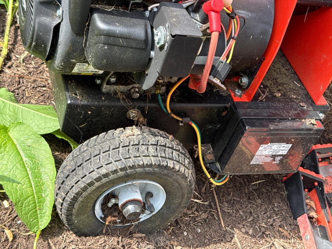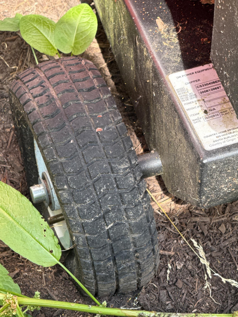 The chipper shredder is constructed with a 10-gauge steel housing and an 11-gauge steel frame for long-lasting durability. It features 9-inch by 3.5-4-inch tires for easy movement, and there is an optional pin hitch available that allows towing behind an ATV or lawn tractor, enhancing mobility across larger properties.