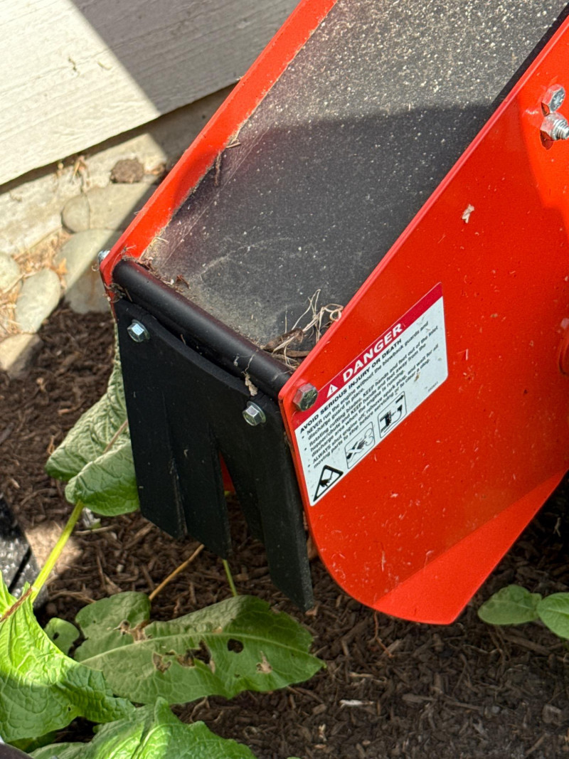 The chipper hopper opening measures 13.8 inches by 8.3 inches, while the shredder hopper opening is larger at 19 inches by 13.2 inches. The chipper knife is made of durable D2 tool steel, measuring 4.75 inches by 1.25 inches by 0.28 inches, and operates at a speed of 118 MPH.