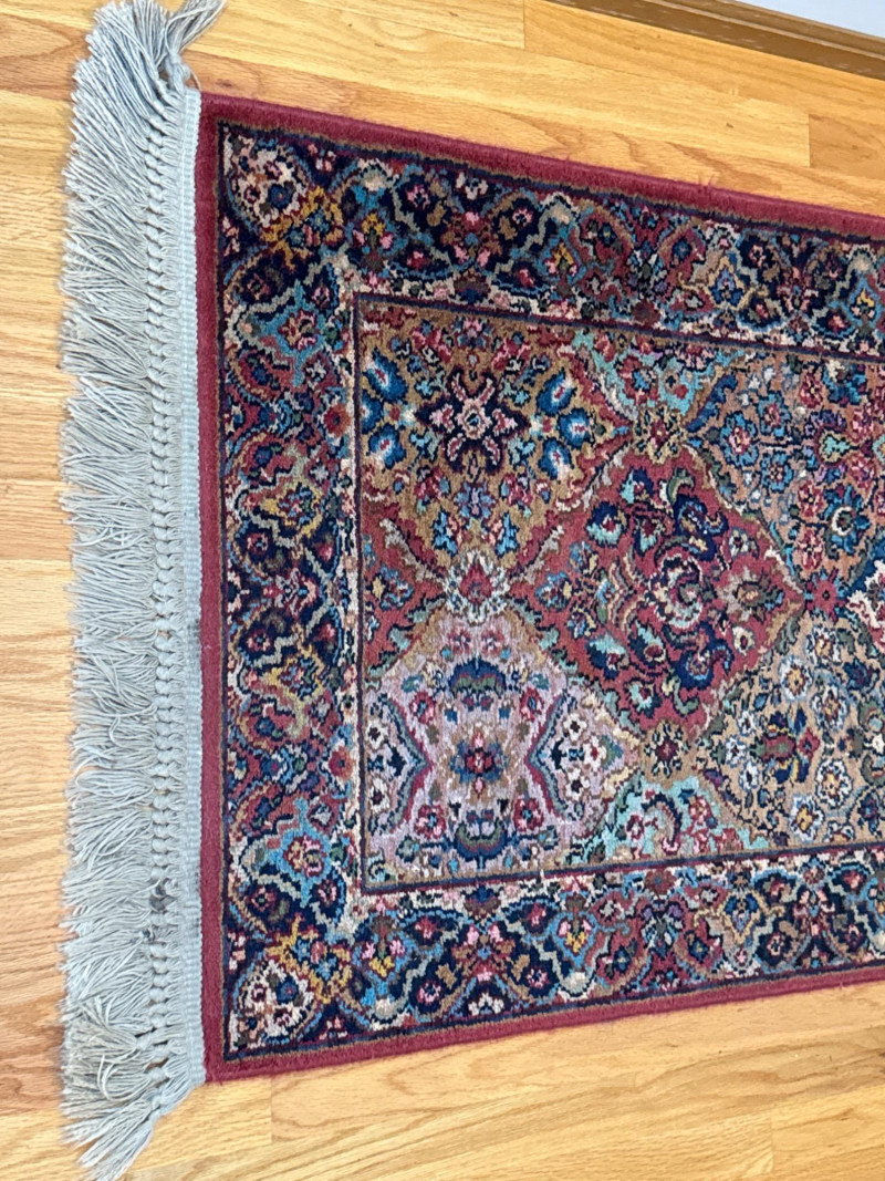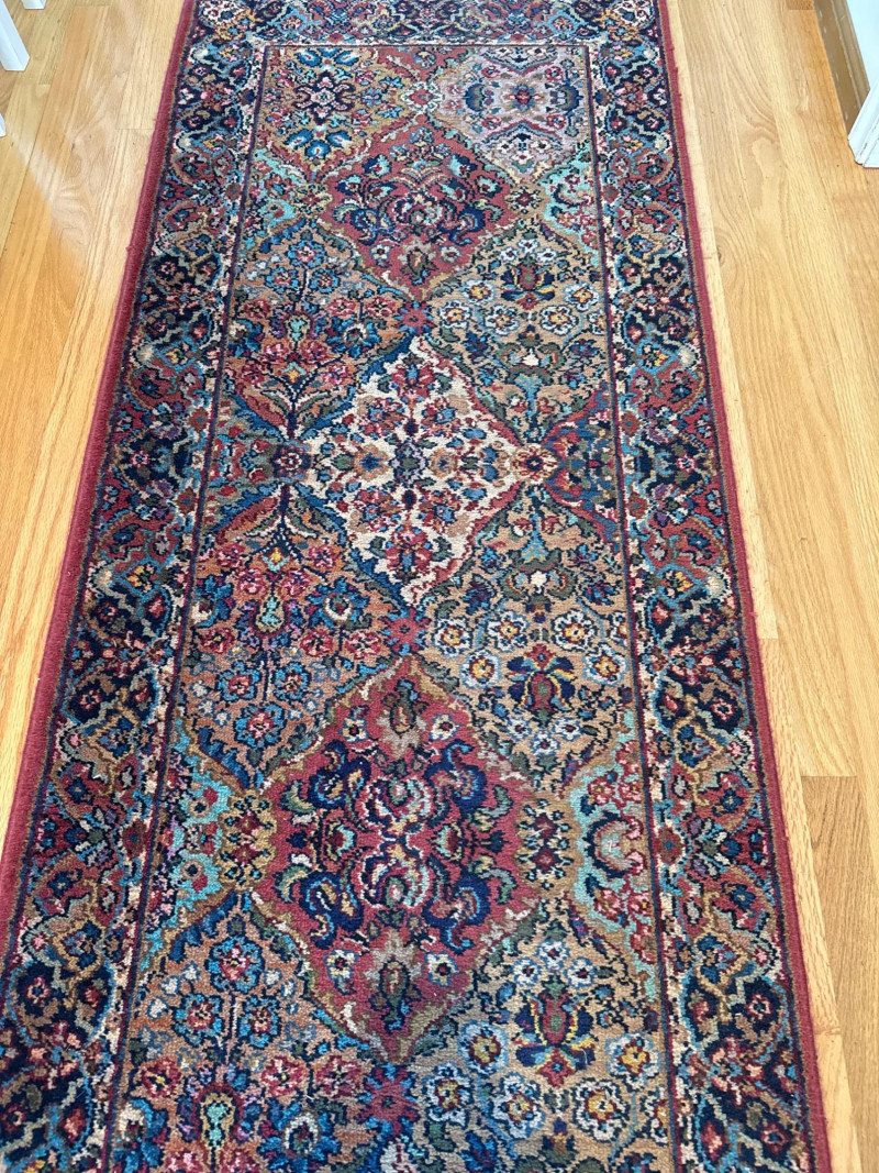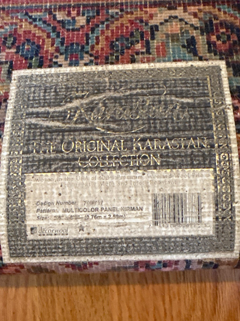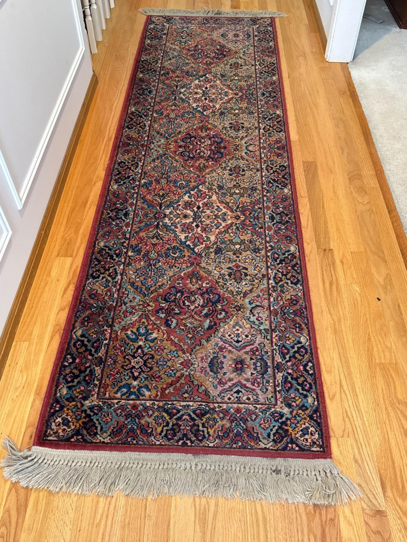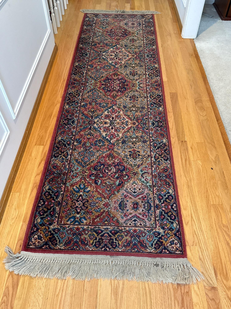 This Karastan wool rug runner measures an impressive 114 inches long by 30.5 inches wide, making it ideal for hallways, entryways, or layered decor in elegant interiors. Its timeless design features a rich combination of reds, blues, greens, and beige woven into diamond-shaped medallions and floral motifs. Fringed ends add a touch of classic detail, and the tightly woven wool construction offers durability and luxurious texture. Brand: Karastan Dimensions: 114" (L) x 30.5" (W) Material: High-quality wool with hand-finished details Design: Geometric diamonds with floral medallions, multicolor palette Condition: Gently used – may show light wear consistent with age Use Case: Perfect for hallway runners, formal interiors, vintage collections Features: Fringed edges, classic palette, exceptional craftsmanshipDescription
