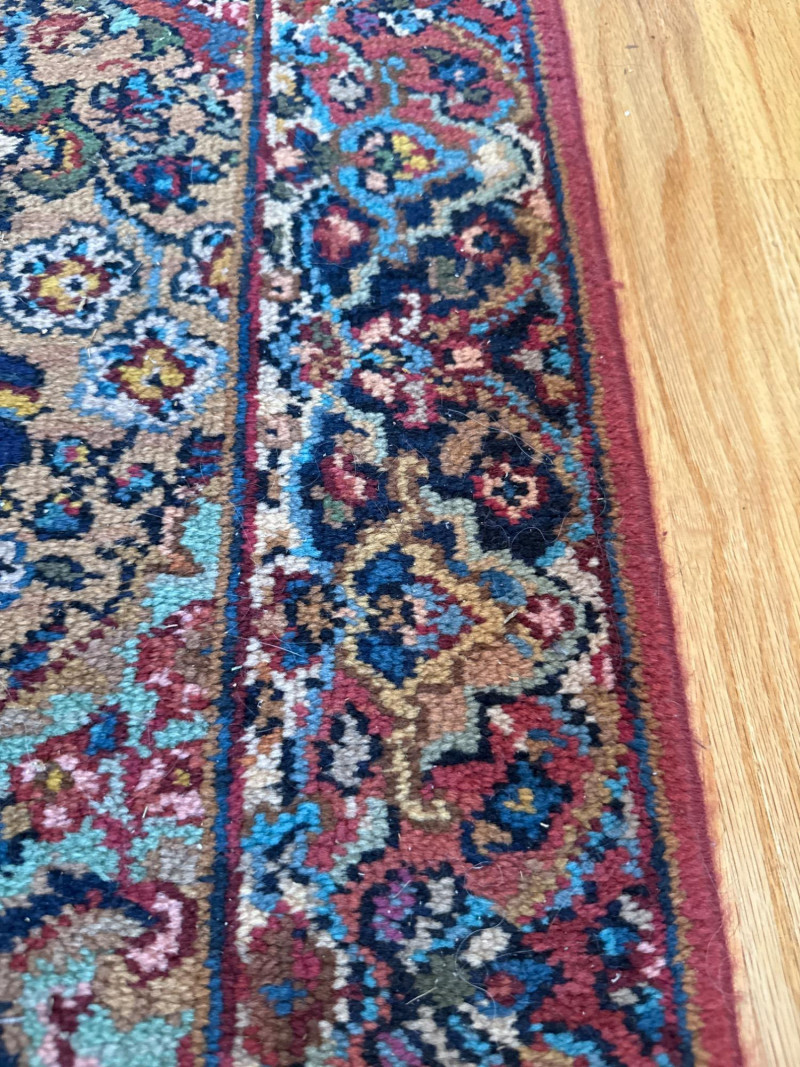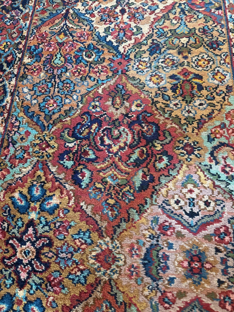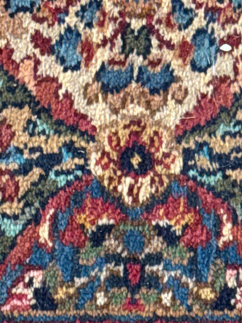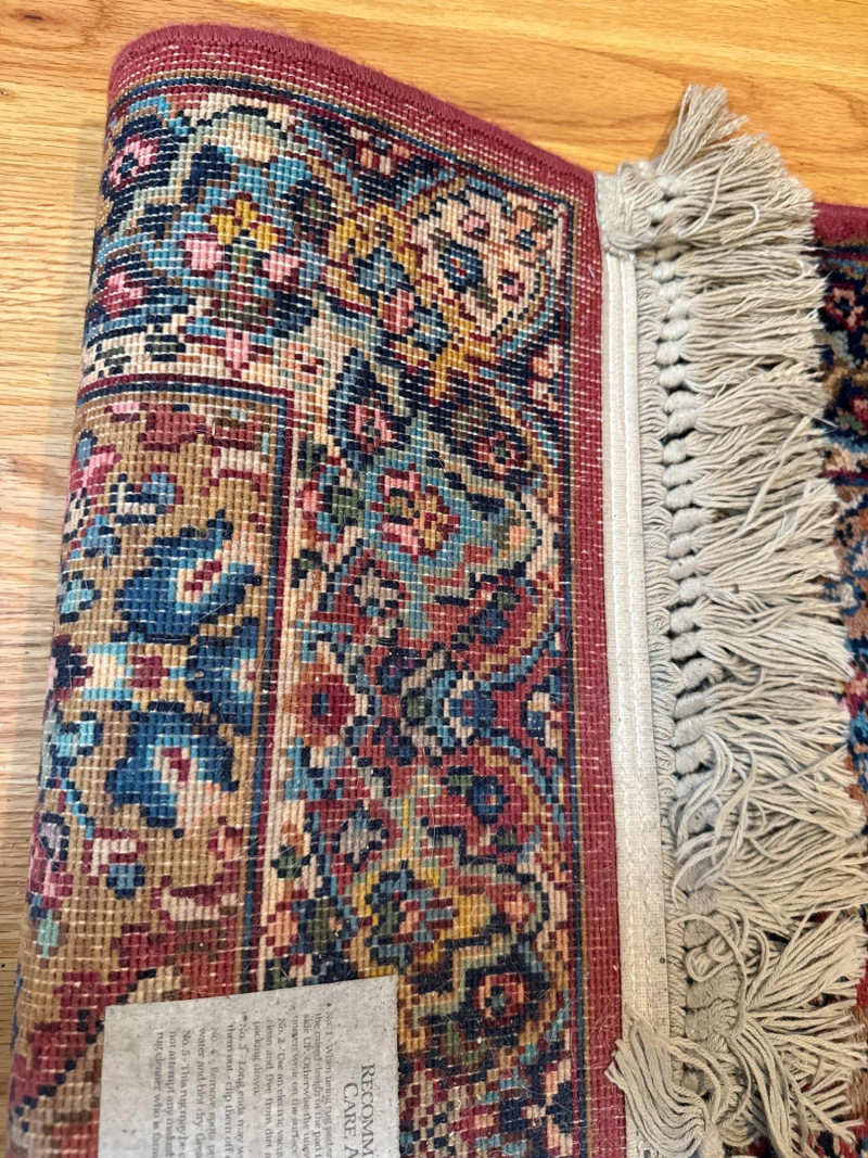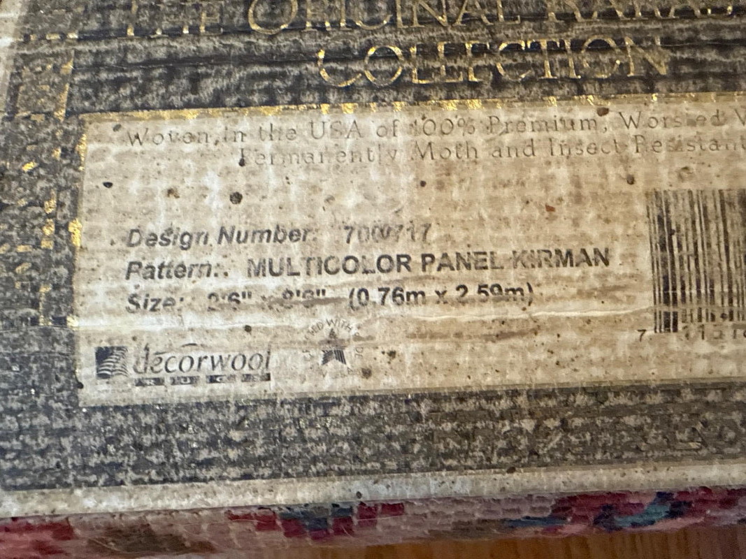This Karastan wool rug runner measures an impressive 114 inches long by 30.5 inches wide, making it ideal for hallways, entryways, or layered decor in elegant interiors. Its timeless design features a rich combination of reds, blues, greens, and beige woven into diamond-shaped medallions and floral motifs. Fringed ends add a touch of classic detail, and the tightly woven wool construction offers durability and luxurious texture. Brand: Karastan Dimensions: 114" (L) x 30.5" (W) Material: High-quality wool with hand-finished details Design: Geometric diamonds with floral medallions, multicolor palette Condition: Gently used – may show light wear consistent with age Use Case: Perfect for hallway runners, formal interiors, vintage collections Features: Fringed edges, classic palette, exceptional craftsmanshipDescription