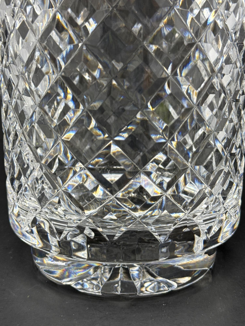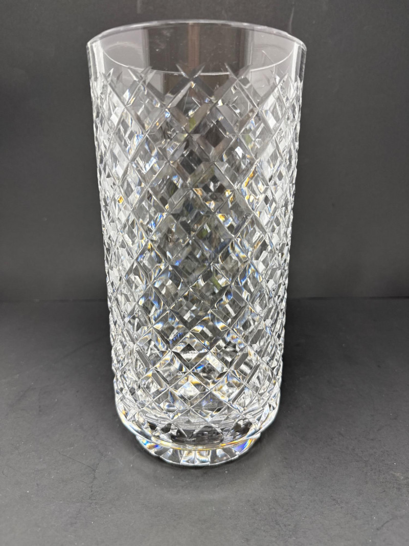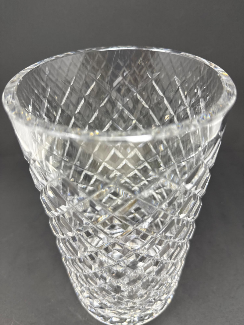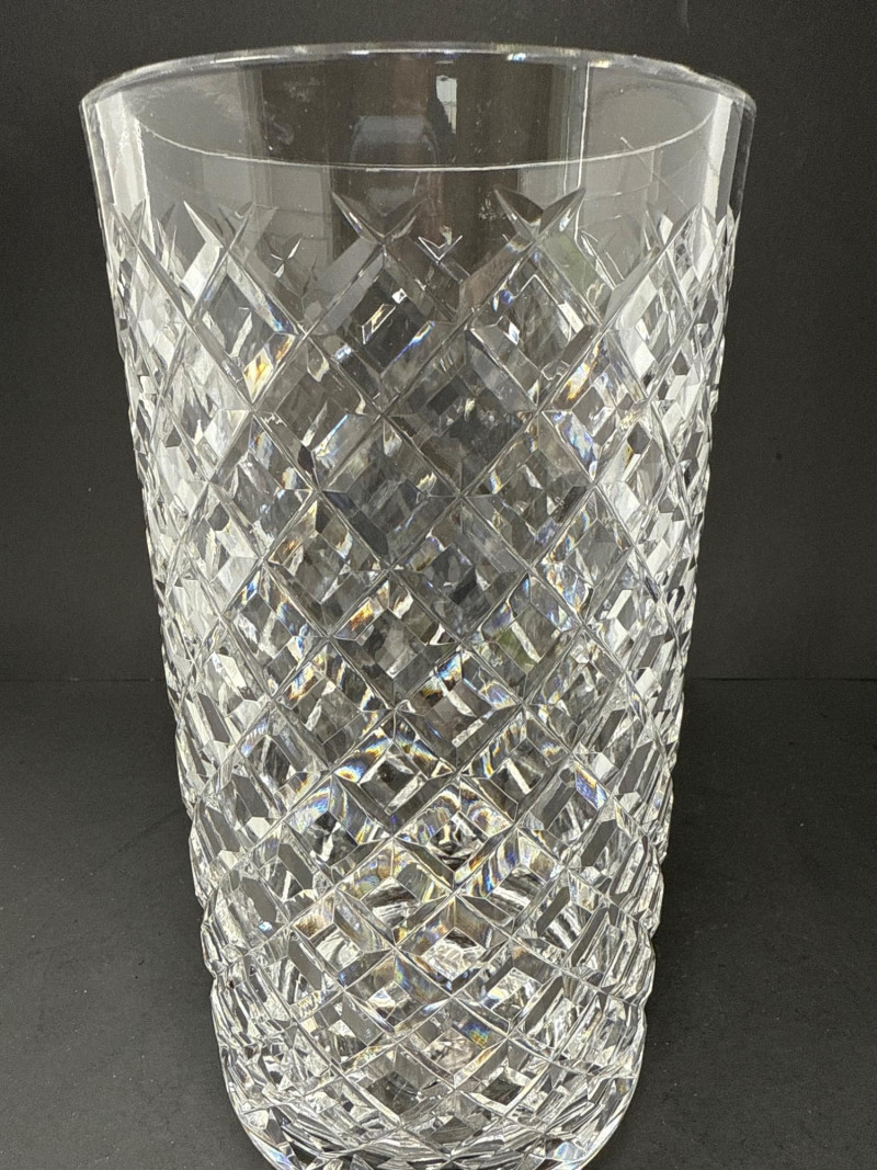 Timeless Waterford crystal vase in the elegant “Alana” pattern, known for its intricate crisscross cuts and luminous clarity. This 10-inch vase embodies the refined craftsmanship of Irish lead crystal production. Design Features Waterford “Alana” pattern featuring cross-cut lattice design Hand-cut lead crystal with glossy finish and flared rim Acid-etched Waterford mark on base; produced in Ireland Dimensions: 10 inches Height x 4½ inches Width Condition
