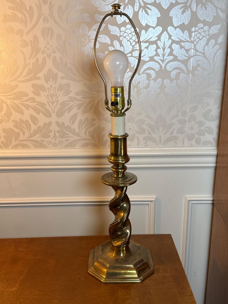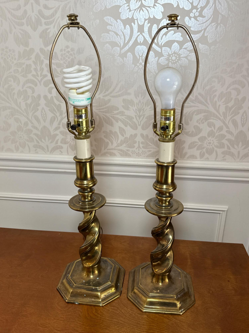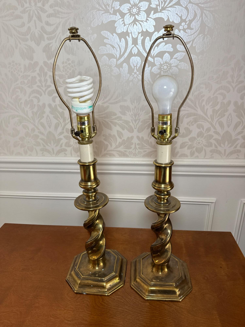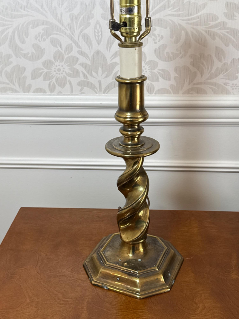 Maker: Stiffel — Renowned American manufacturer known for high-quality, classic lighting designs since 1932. Style: Traditional Elegance with a twisted brass column design, evoking timeless sophistication and mid-century charm. Size: Height: 27 inches Base Diameter: 7.5 inches Material: Solid Brass — Features a heavy, durable base that reflects Stiffel’s commitment to craftsmanship and quality. Condition: Excellent Working Condition — Both lamps power on successfully. Note: Lamps are sold without shades. Cosmetic Condition: Minor surface wear consistent with age; no major dents or damage.