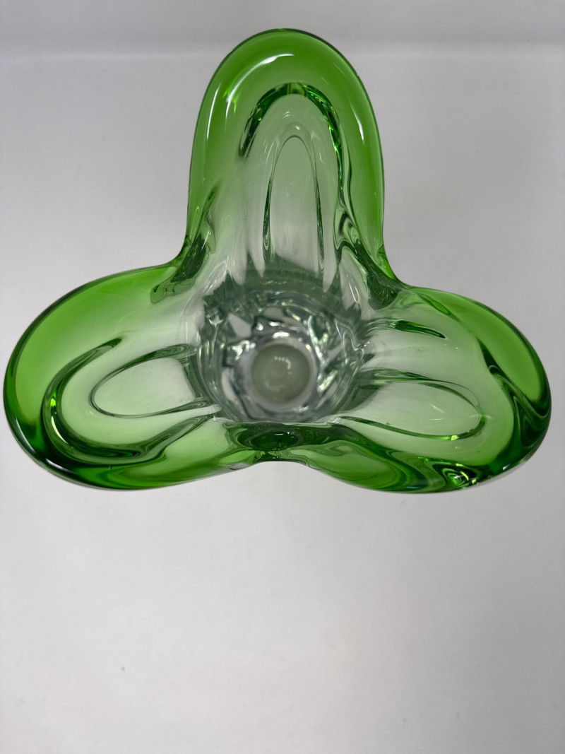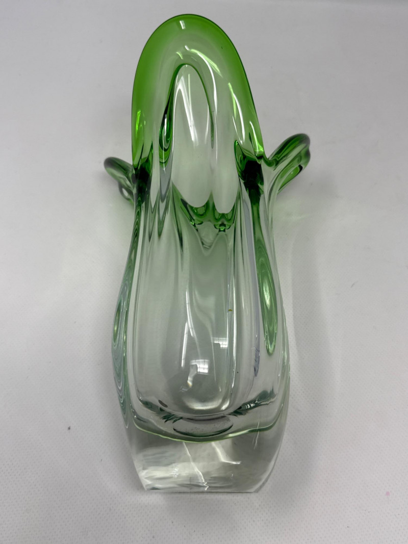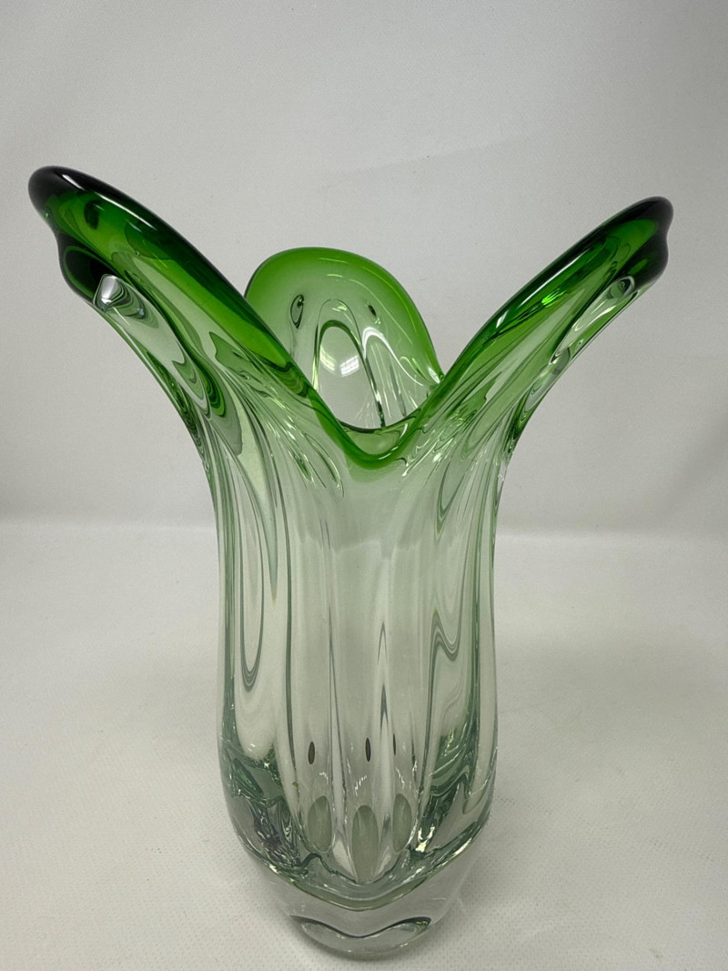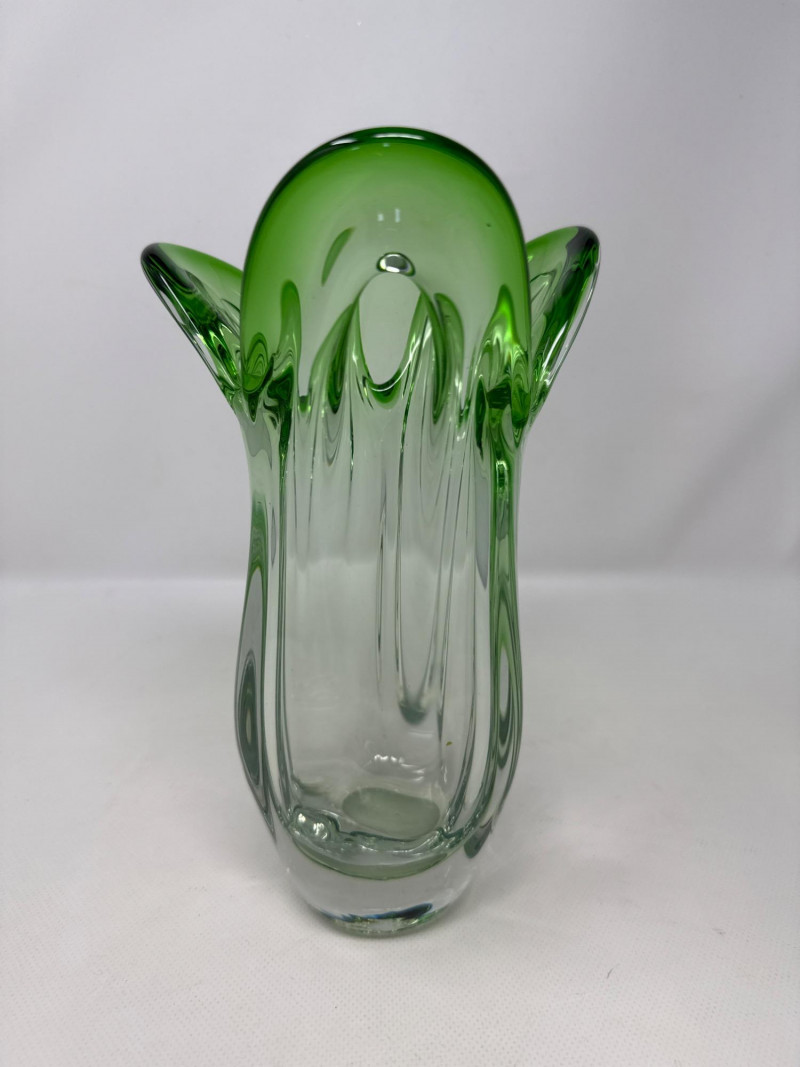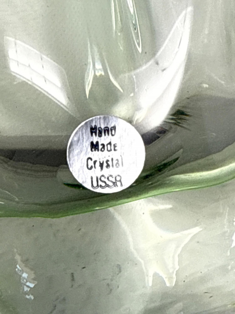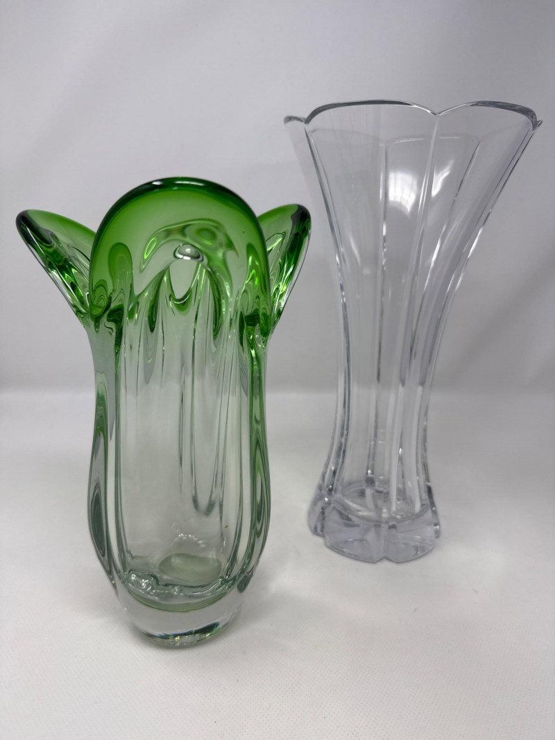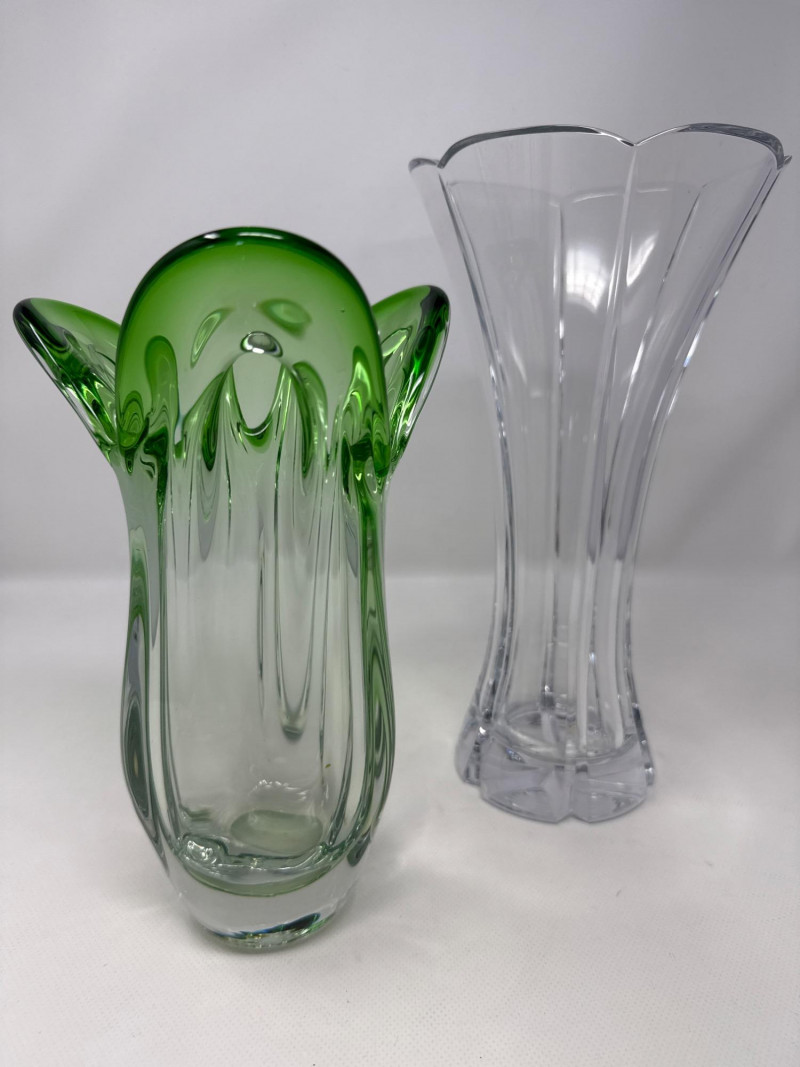 A charming pair of decorative vases showcasing timeless elegance and artisan craftsmanship. Brand/Origin: Rogaska clear crystal ta[ered tulip vase; Green and clear crystal vase is made in USSR Style: Flared Crystal Vase: Mid-century modern influence with a smooth, minimalist silhouette Tapered Tulip Crystal Vase: Studio art glass with a clear base and fluted green top. Very heavy Dimensions: Green Vase: 10" H × 6" W Tapered Vase: 12" H × 6.5" W Condition: Both pieces are in very good vintage condition with no visible chips or cracks. Light surface wear consistent with age. These vases complement a variety of interior styles—from retro-inspired to contemporary—and would make a striking addition to any shelf or centerpiece arrangement.