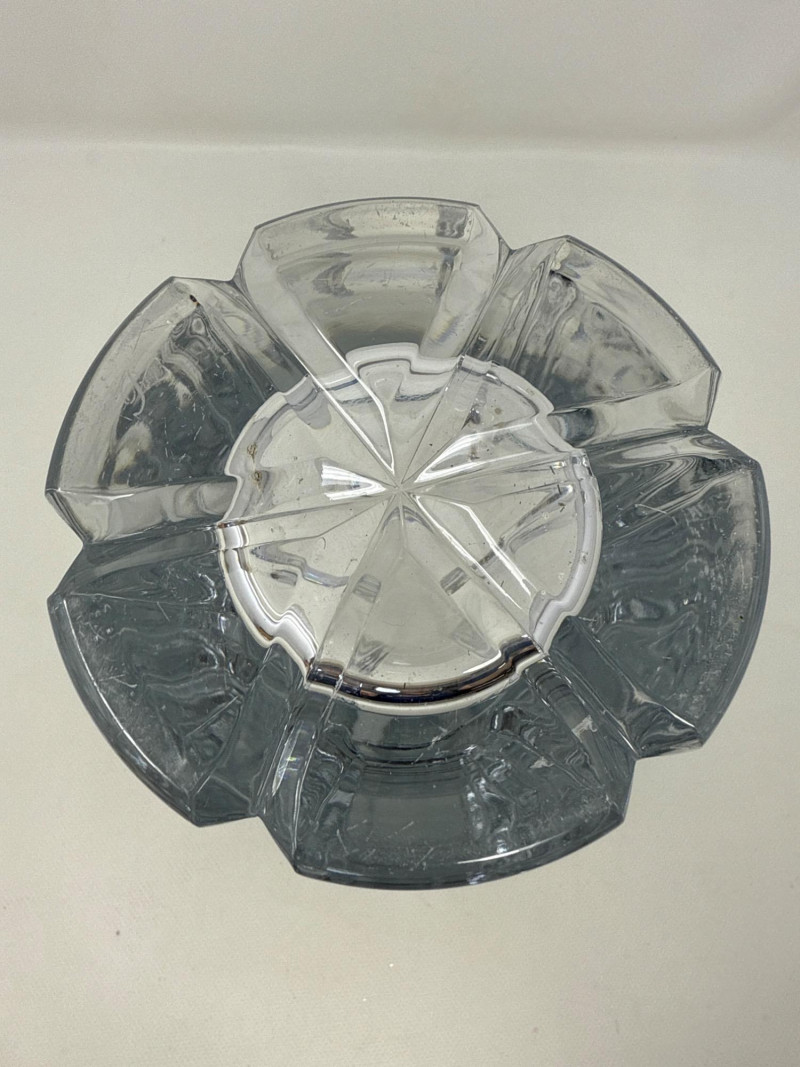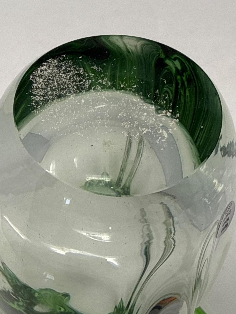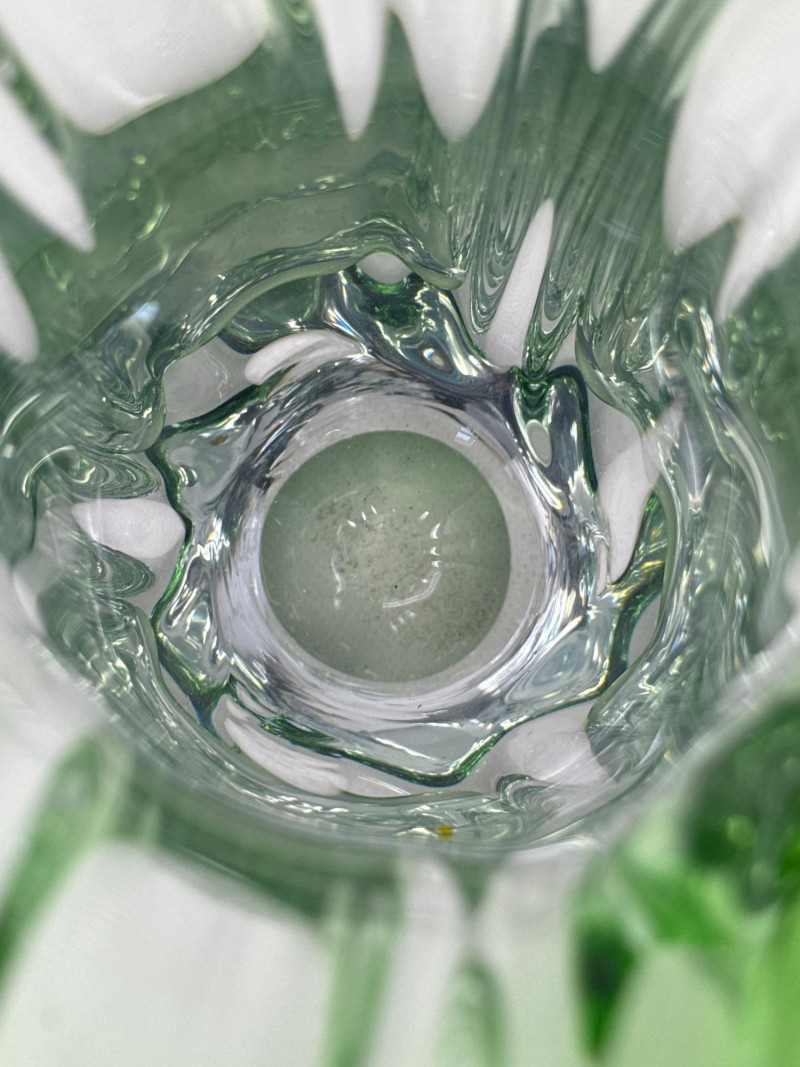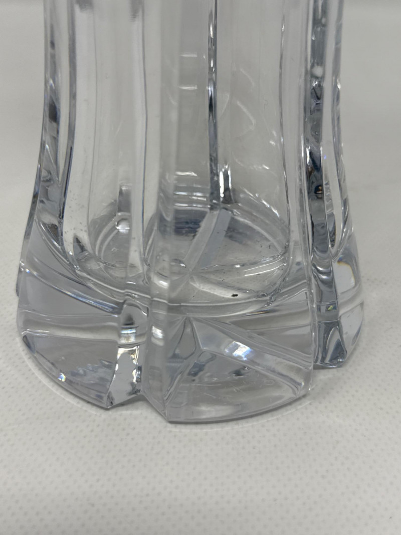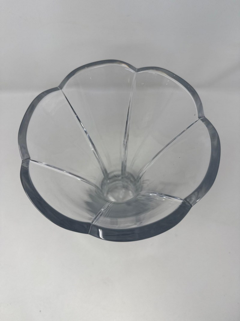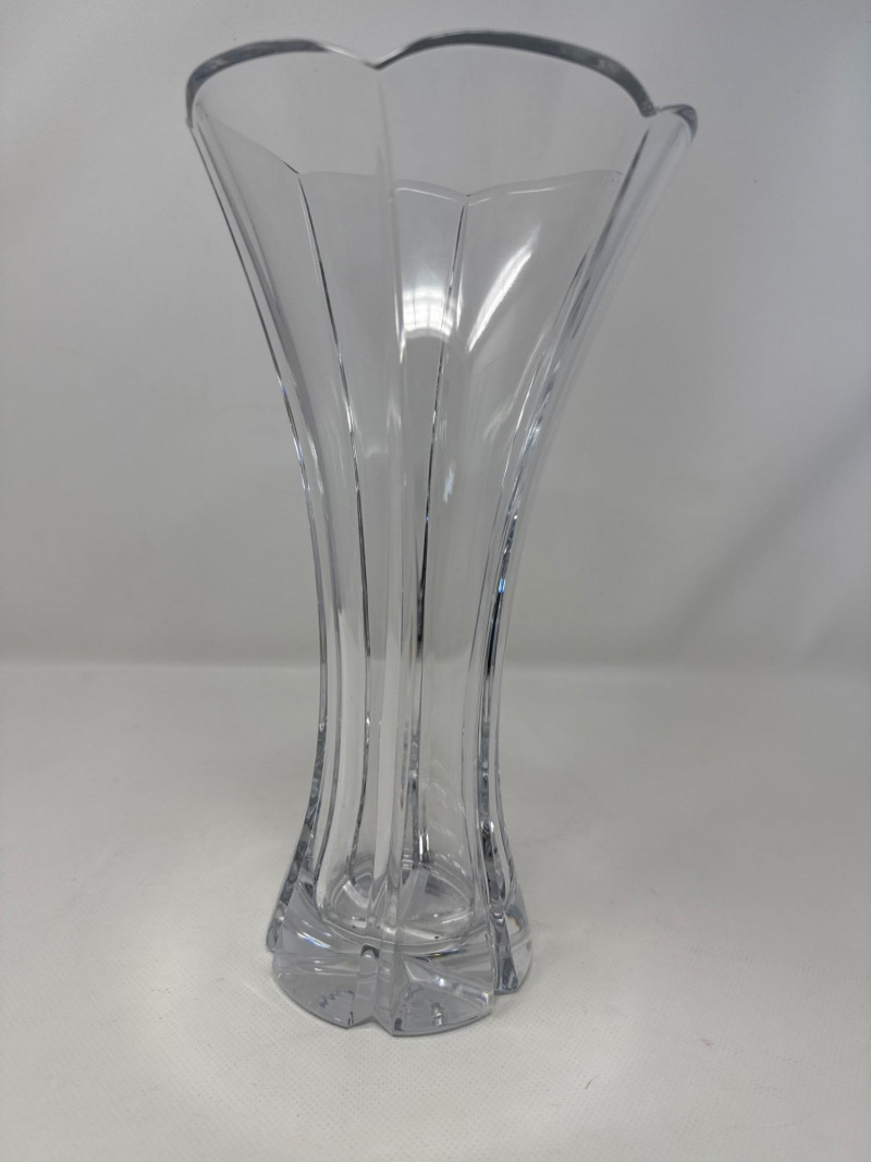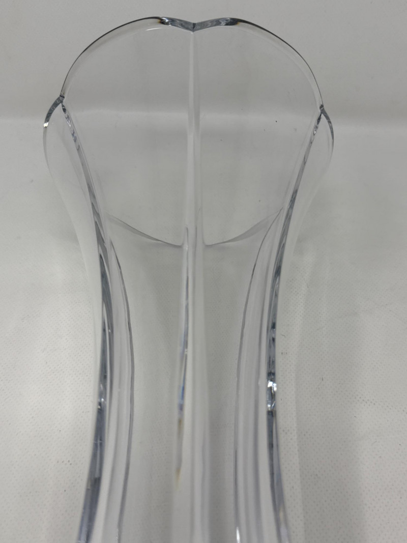 A charming pair of decorative vases showcasing timeless elegance and artisan craftsmanship. Brand/Origin: Rogaska clear crystal ta[ered tulip vase; Green and clear crystal vase is made in USSR Style: Flared Crystal Vase: Mid-century modern influence with a smooth, minimalist silhouette Tapered Tulip Crystal Vase: Studio art glass with a clear base and fluted green top. Very heavy Dimensions: Green Vase: 10" H × 6" W Tapered Vase: 12" H × 6.5" W Condition: Both pieces are in very good vintage condition with no visible chips or cracks. Light surface wear consistent with age. These vases complement a variety of interior styles—from retro-inspired to contemporary—and would make a striking addition to any shelf or centerpiece arrangement.
