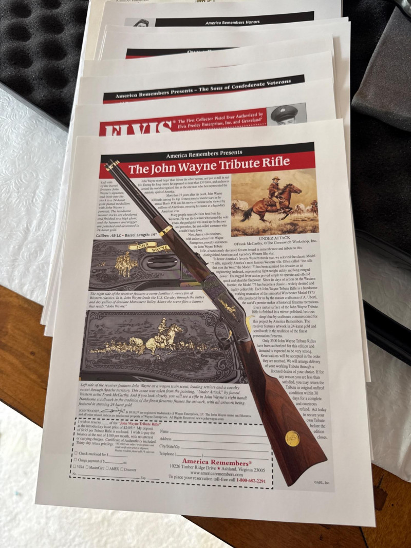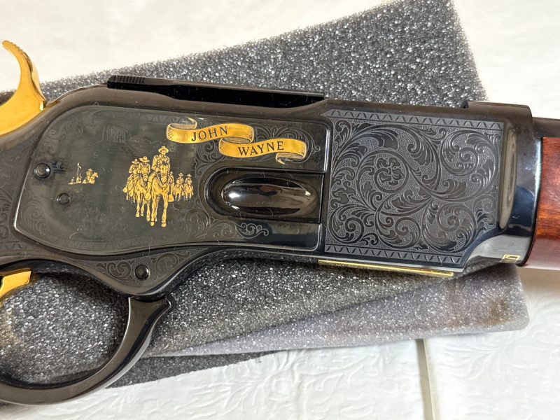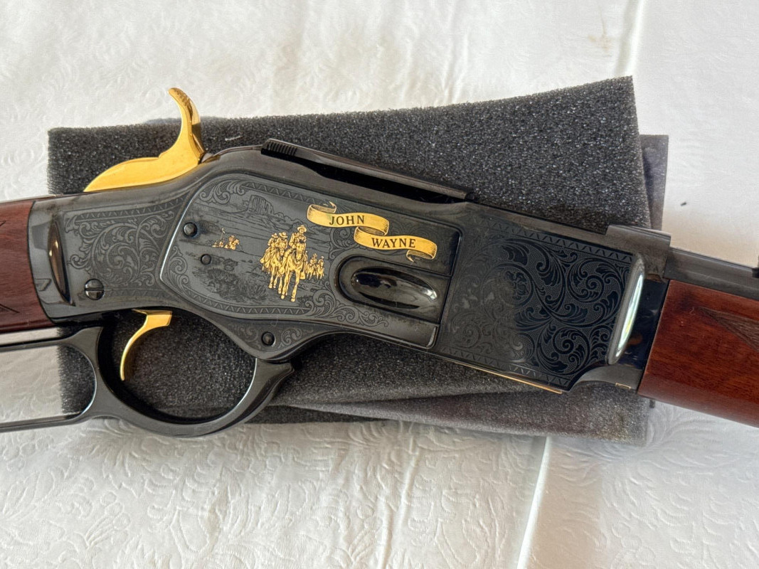 The John Wayne 1873 Tribute Rifle is a commemorative lever-action firearm styled after the legendary Winchester Model 1873. It features elegant engravings and gold-plated accents that honor John Wayne’s iconic Western film legacy. The receiver often showcases detailed scrollwork, images of Wayne in classic poses, and his signature.