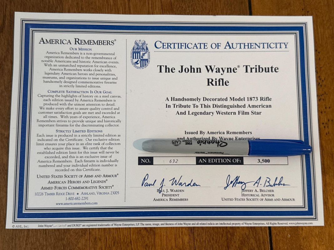 Lot # 23 - John Wayne 1873 Tribute Rifle-632/3500 .45Cal $3000 Value